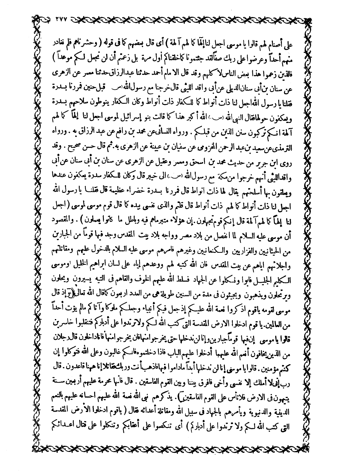 عَلى أَصْنامٍ لَهُمْ قالُوا يَا مُوسَى اجْعَلْ لَنا إِلهاً كَما لَهُمْ آلِهَةٌ 7: 138 أَيْ قَالَ بَعْضُهُمْ كَمَا فِي قَوْلِهِ وَحَشَرْناهُمْ فَلَمْ نُغادِرْ مِنْهُمْ أَحَداً وَعُرِضُوا عَلى رَبِّكَ صَفًّا لَقَدْ جِئْتُمُونا كَما خَلَقْناكُمْ أَوَّلَ مَرَّةٍ بَلْ زَعَمْتُمْ أَلَّنْ نَجْعَلَ لَكُمْ مَوْعِداً 18: 47- 48 فَالَّذِينَ زَعَمُوا هَذَا بَعْضُ النَّاسِ لَا كُلُّهُمْ وَقَدْ قَالَ الْإِمَامُ أَحْمَدُ حَدَّثَنَا عَبْدُ الرَّزَّاقِ حَدَّثَنَا مَعْمَرٌ عَنِ الزُّهْرِيِّ عَنْ سِنَانِ بْنِ أَبِي سِنَانٍ الدِّيلِيِّ عَنْ أَبِي وَاقِدٍ اللَّيْثِيِّ قَالَ خَرَجْنَا مَعَ رَسُولِ اللَّهِ صَلَّى اللَّهُ عَلَيْهِ وَسَلَّمَ قبل حنين فمررنا بسدرة فَقُلْنَا يَا رَسُولَ اللَّهِ اجْعَلْ لَنَا ذَاتَ أَنْوَاطٍ كَمَا لِلْكُفَّارِ ذَاتُ أَنْوَاطٍ وَكَانَ الْكَفَّارُ يَنُوطُونَ سِلَاحَهُمْ بِسِدْرَةٍ وَيَعْكُفُونَ حَوْلَهَا فَقَالَ النَّبِيُّ اللَّهِ صَلَّى اللَّهُ عَلَيْهِ وَسَلَّمَ اللَّهُ أَكْبَرُ هَذَا كَمَا قَالَتْ بَنُو إِسْرَائِيلَ لِمُوسَى اجْعَلْ لَنَا إِلَهًا كَمَا لَهُمْ آلِهَةٌ إِنَّكُمْ تَرْكَبُونَ سُنَنَ الَّذِينَ مِنْ قَبْلِكُمْ. وَرَوَاهُ النَّسَائِيُّ عَنْ مُحَمَّدِ بْنِ رَافِعٍ عَنْ عَبْدِ الرَّزَّاقِ بِهِ. وَرَوَاهُ التِّرْمِذِيُّ عَنْ سَعِيدِ بْنِ عَبْدِ الرَّحْمَنِ الْمَخْزُومِيِّ عَنْ سُفْيَانَ بْنِ عُيَيْنَةَ عَنِ الزُّهْرِيِّ بِهِ. ثُمَّ قَالَ حَسَنٌ صَحِيحٌ. وَقَدْ رَوَى ابْنُ جَرِيرٍ مِنْ حَدِيثِ مُحَمَّدِ بْنِ إِسْحَاقَ وَمَعْمَرٍ وَعَقِيلٍ عَنِ الزُّهْرِيِّ عَنْ سِنَانِ بْنِ أَبِي سِنَانٍ عَنْ أَبِي وَاقِدٍ اللَّيْثِيِّ أَنَّهُمْ خَرَجُوا مِنْ مَكَّةَ مَعَ رَسُولِ اللَّهِ صَلَّى اللَّهُ عَلَيْهِ وَسَلَّمَ الى خيبر قَالَ وَكَانَ لِلْكُفَّارِ سِدْرَةٌ يَعْكُفُونَ عِنْدَهَا وَيُعَلِّقُونَ بِهَا أَسْلِحَتَهُمْ يُقَالُ لَهَا ذَاتُ أَنْوَاطٍ قَالَ فَمَرَرْنَا بِسِدْرَةٍ خَضْرَاءَ عَظِيمَةٍ قَالَ فَقُلْنَا يَا رَسُولَ اللَّهِ اجْعَلْ لَنَا ذَاتَ أَنْوَاطٍ كَمَا لَهُمْ ذَاتُ أَنْوَاطٍ قَالَ قُلْتُمْ وَالَّذِي نَفْسِي بِيَدِهِ كَمَا قَالَ قَوْمُ مُوسَى لِمُوسَى اجْعَلْ لَنا إِلهاً كَما لَهُمْ آلِهَةٌ قَالَ إِنَّكُمْ قَوْمٌ تَجْهَلُونَ. إِنَّ هؤُلاءِ مُتَبَّرٌ مَا هُمْ فِيهِ وَباطِلٌ ما كانُوا يَعْمَلُونَ 7: 138- 139. وَالْمَقْصُودُ أَنَّ مُوسَى عَلَيْهِ السَّلَامُ لَمَّا انْفَصَلَ مِنْ بِلَادِ مِصْرَ وَوَاجَهَ بِلَادَ بَيْتِ الْمَقْدِسِ وَجَدَ فِيهَا قَوْمًا مِنَ الْجَبَّارِينَ مِنْ الْحَيْثَانِيِّينَ وَالْفَزَارِيِّينَ وَالْكَنْعَانِيِّينَ وَغَيْرِهِمْ فَأَمَرَهُمْ مُوسَى عَلَيْهِ السَّلَامُ بِالدُّخُولِ عَلَيْهِمْ وَمُقَاتَلَتِهِمْ وَإِجْلَائِهِمْ إِيَّاهُمْ عَنْ بَيْتِ الْمَقْدِسِ فَإِنَّ اللَّهَ كَتَبَهُ لَهُمْ وَوَعَدَهُمْ إِيَّاهُ عَلَى لِسَانِ إِبْرَاهِيمَ الْخَلِيلِ وَمُوسَى الْكَلِيمِ الْجَلِيلِ فَأَبَوْا وَنَكَلُوا عَنِ الْجِهَادِ فَسَلَّطَ اللَّهُ عَلَيْهِمُ الْخَوْفَ وَأَلْقَاهُمْ فِي التِّيهِ يَسِيرُونَ وَيَحِلُّونَ وَيَرْتَحِلُونَ وَيَذْهَبُونَ وَيَجِيئُونَ فِي مُدَّةٍ مِنَ السِّنِينَ طَوِيلَةٍ هِيَ مِنَ الْعَدَدِ أَرْبَعُونَ كَمَا قَالَ اللَّهُ تَعَالَى وَإِذْ قَالَ مُوسى لِقَوْمِهِ يَا قَوْمِ اذْكُرُوا نِعْمَتَ اللَّهِ عَلَيْكُمْ إِذْ جَعَلَ فِيكُمْ أَنْبِياءَ وَجَعَلَكُمْ مُلُوكاً وَآتاكُمْ مَا لَمْ يُؤْتِ أَحَداً مِنَ الْعالَمِينَ. يَا قَوْمِ ادْخُلُوا الْأَرْضَ الْمُقَدَّسَةَ الَّتِي كَتَبَ اللَّهُ لَكُمْ وَلا تَرْتَدُّوا عَلى أَدْبارِكُمْ فَتَنْقَلِبُوا خاسِرِينَ قالُوا يَا مُوسى. إِنَّ فِيها قَوْماً جَبَّارِينَ وَإِنَّا لَنْ 