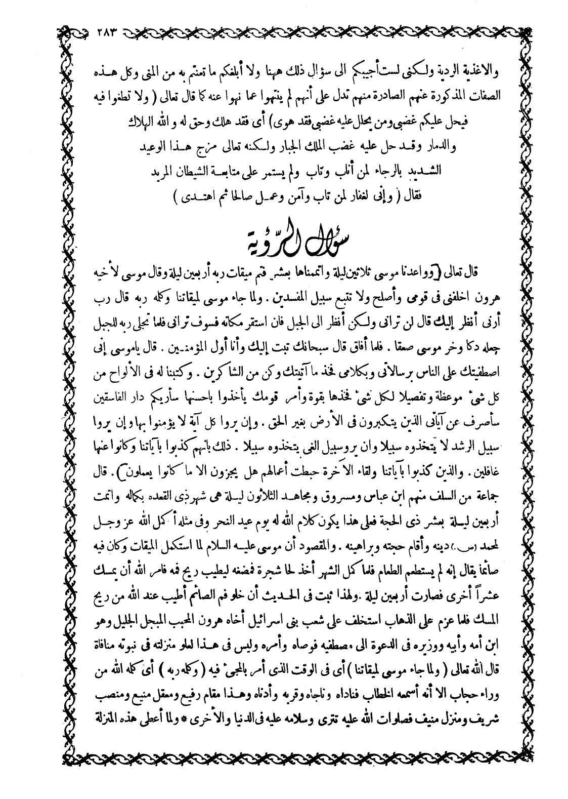 قال تَعَالَى وَواعَدْنا مُوسى ثَلاثِينَ لَيْلَةً وَأَتْمَمْناها بِعَشْرٍ فَتَمَّ مِيقاتُ رَبِّهِ أَرْبَعِينَ لَيْلَةً وَقال مُوسى لِأَخِيهِ هارُونَ اخْلُفْنِي فِي قَوْمِي وَأَصْلِحْ وَلا تَتَّبِعْ سَبِيلَ الْمُفْسِدِينَ. وَلَمَّا جاءَ مُوسى لِمِيقاتِنا وَكَلَّمَهُ رَبُّهُ قَالَ رَبِّ أَرِنِي أَنْظُرْ إِلَيْكَ قَالَ لَنْ تَرانِي وَلكِنِ انْظُرْ إِلَى الْجَبَلِ فَإِنِ اسْتَقَرَّ مَكانَهُ فَسَوْفَ تَرانِي فَلَمَّا تَجَلَّى رَبُّهُ لِلْجَبَلِ جَعَلَهُ دَكًّا وَخَرَّ مُوسى صَعِقاً. فَلَمَّا أَفاقَ قَالَ سُبْحانَكَ تُبْتُ إِلَيْكَ وَأَنَا أَوَّلُ الْمُؤْمِنِينَ. قَالَ يَا مُوسى إِنِّي اصْطَفَيْتُكَ عَلَى النَّاسِ بِرِسالاتِي وَبِكَلامِي فَخُذْ مَا آتَيْتُكَ وَكُنْ مِنَ الشَّاكِرِينَ. وَكَتَبْنا لَهُ فِي الْأَلْواحِ من كُلِّ شَيْءٍ مَوْعِظَةً وَتَفْصِيلًا لِكُلِّ شَيْءٍ فَخُذْها بِقُوَّةٍ وَأْمُرْ قَوْمَكَ يَأْخُذُوا بِأَحْسَنِها سَأُرِيكُمْ دارَ الْفاسِقِينَ سَأَصْرِفُ عَنْ آياتِيَ الَّذِينَ يَتَكَبَّرُونَ في الْأَرْضِ بِغَيْرِ الْحَقِّ. وَإِنْ يَرَوْا كُلَّ آيَةٍ لَا يُؤْمِنُوا بِها وَإِنْ يَرَوْا سَبِيلَ الرُّشْدِ لَا يَتَّخِذُوهُ سَبِيلًا وَإِنْ يَرَوْا سَبِيلَ الغَيِّ يَتَّخِذُوهُ سَبِيلًا. ذلِكَ بِأَنَّهُمْ كَذَّبُوا بِآياتِنا وَكانُوا عَنْها غافِلِينَ. وَالَّذِينَ كَذَّبُوا بِآياتِنا وَلِقاءِ الْآخِرَةِ حَبِطَتْ أَعْمالُهُمْ هَلْ يُجْزَوْنَ إِلَّا مَا كانُوا يَعْمَلُونَ 7: 142- 147. قَالَ جَمَاعَةٌ مِنَ السَّلَفِ مِنْهُمُ ابْنُ عَبَّاسٍ وَمَسْرُوقٌ وَمُجَاهِدٌ الثَّلَاثُونَ لَيْلَةً هِيَ شَهْرُ ذِي الْقَعْدَةِ بِكَمَالِهِ وَأُتِمَّتْ أَرْبَعِينَ لَيْلَةً بِعَشْرِ ذِي الْحِجَّةِ فَعَلَى هَذَا يَكُونُ كَلَامُ اللَّهِ لَهُ يَوْمَ عِيدِ النَّحْرِ وَفِي مِثْلِهِ أَكْمَلَ اللَّهُ عَزَّ وَجَلَّ لِمُحَمَّدٍ صَلَّى اللَّهُ عَلَيْهِ وَسَلَّمَ دِينَهُ وَأَقَامَ حُجَّتَهُ وَبَرَاهِينَهُ. وَالْمَقْصُودُ أَنَّ مُوسَى عَلَيْهِ السَّلَامُ لَمَّا اسْتَكْمَلَ الْمِيقَاتَ وَكَانَ فِيهِ صَائِمًا يُقَالُ إِنَّهُ لَمْ يَسْتَطْعِمِ الطَّعَامَ فَلَمَّا كَمَلَ الشَّهْرُ أَخَذَ لِحَا شَجَرَةٍ فَمَضَغَهُ لِيُطَيِّبَ رِيحَ فَمِهِ فَأَمَرَ اللَّهُ أَنْ يُمْسِكَ عَشْرًا أُخْرَى فَصَارَتْ أَرْبَعِينَ لَيْلَةً. وَلِهَذَا ثَبَتَ فِي الحديث أن خلو فَمِ الصَّائِمِ أَطْيَبُ عِنْدَ اللَّهِ مِنْ رِيحِ الْمِسْكِ فَلَمَّا عَزَمَ عَلَى الذَّهَابِ اسْتَخْلَفَ عَلَى شَعْبِ بَنِي إِسْرَائِيلَ أَخَاهُ هَارُونَ الْمُحَبَّبَ الْمُبَجَّلَ الْجَلِيلَ وَهُوَ ابْنُ أُمِّهِ وَأَبِيهِ وَوَزِيرُهُ فِي الدعوة الى مصطفيه فوصاه وأمره وَلَيْسَ فِي هَذَا لِعُلُوِّ مَنْزِلَتِهِ فِي نُبُوَّتِهِ مُنَافَاةٌ قَالَ اللَّهُ تَعَالَى وَلَمَّا جاءَ مُوسى لِمِيقاتِنا 7: 143 أَيْ فِي الْوَقْتِ الَّذِي أُمِرَ بِالْمَجِيءِ فِيهِ وَكَلَّمَهُ رَبُّهُ 7: 143 أَيْ كَلَّمَهُ اللَّهُ مِنْ وَرَاءِ حِجَابٍ إِلَّا أَنَّهُ أَسْمَعَهُ الْخِطَابَ فَنَادَاهُ وَنَاجَاهُ وَقَرَّبَهُ وَأَدْنَاهُ وَهَذَا مَقَامٌ رَفِيعٌ وَمَعْقِلٌ مَنِيعٌ وَمَنْصِبٌ شَرِيفٌ وَمَنْزِلٌ مُنِيفٌ فَصَلَوَاتُ اللَّهِ عَلَيْهِ تَتْرَى وَسَلَامُهُ عَلَيْهِ فِي الدُّنْيَا وَالْأُخْرَى وَلَمَّا أُعْطِيَ هَذِهِ المنزلة