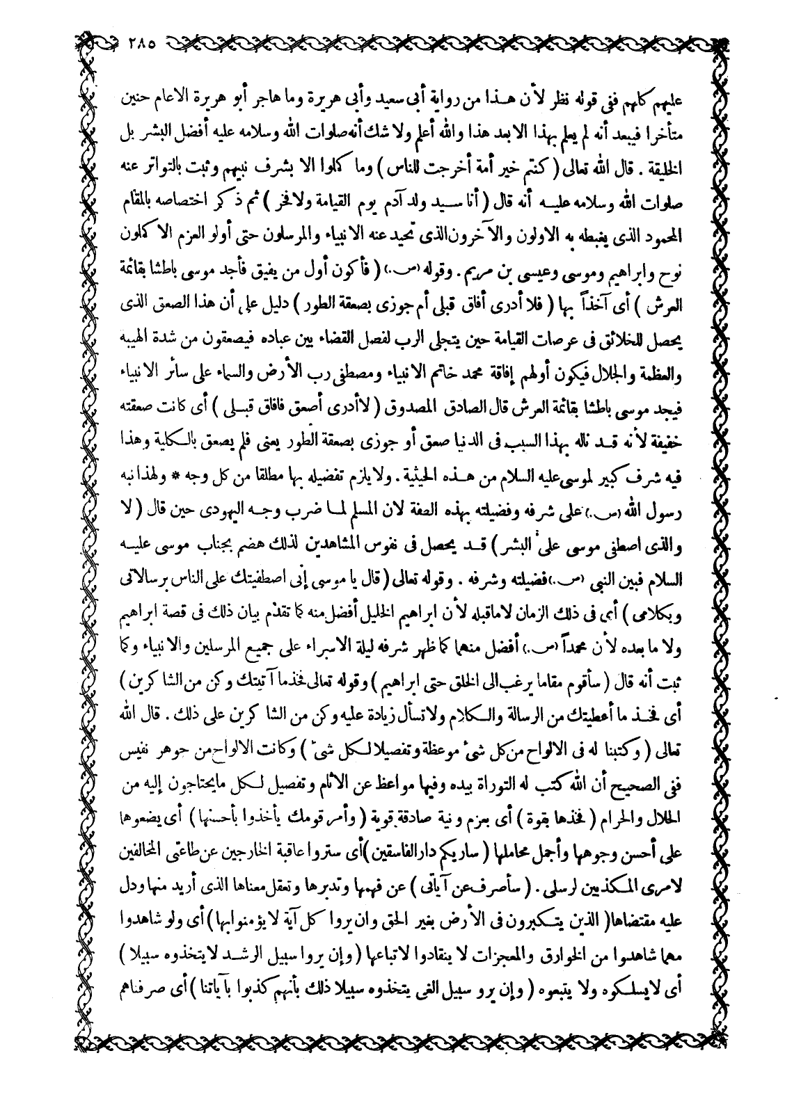 عَلَيْهِمْ كُلِّهِمْ فَفِي قَوْلِهِ نَظَرٌ لَأَنَّ هَذَا مِنْ رِوَايَةِ أَبِي سَعِيدٍ وَأَبِي هُرَيْرَةَ وَمَا هاجر أبو هريرة إلا عام حنين مُتَأَخِّرًا فَيَبْعُدُ أَنَّهُ لَمْ يَعْلَمْ بِهَذَا إِلَّا بَعْدَ هَذَا وَاللَّهُ أَعْلَمُ وَلَا شَكَّ أَنَّهُ صَلَوَاتُ اللَّهِ وَسَلَامُهُ عَلَيْهِ أَفْضَلُ الْبَشَرِ بَلِ الْخَلِيقَةِ. قَالَ اللَّهُ تَعَالَى كُنْتُمْ خَيْرَ أُمَّةٍ أُخْرِجَتْ لِلنَّاسِ 3: 110 وَمَا كَمُلُوا إِلَّا بِشَرَفِ نَبِيِّهِمْ وَثَبَتَ بِالتَّوَاتُرِ عَنْهُ صَلَوَاتُ اللَّهِ وَسَلَامُهُ عَلَيْهِ أَنَّهُ قَالَ (أَنَا سَيِّدُ وَلَدِ آدَمَ يَوْمَ الْقِيَامَةِ وَلَا فَخْرَ) ثُمَّ ذَكَرَ اخْتِصَاصَهُ بِالْمَقَامِ الْمَحْمُودِ الَّذِي يَغْبِطُهُ بِهِ الْأَوَّلُونَ وَالْآخَرُونَ الَّذِي تَحِيدُ عَنْهُ الْأَنْبِيَاءُ وَالْمُرْسَلُونَ حَتَّى أُولُو الْعَزْمِ الْأَكْمَلُونَ نُوحٌ وإبراهيم وموسى وعيسى بن مَرْيَمَ. وَقَوْلُهُ صَلَّى اللَّهُ عَلَيْهِ وَسَلَّمَ (فَأَكُونُ أَوَّلَ مَنْ يُفِيقُ فَأَجِدُ مُوسَى بَاطِشًا بِقَائِمَةِ الْعَرْشِ) أَيْ آخِذًا بِهَا (فَلَا أَدْرِي أَفَاقَ قَبْلِي أَمْ جُوزِيَ بِصَعْقَةِ الطُّورِ) دَلِيلٌ عَلَى أَنَّ هَذَا الصَّعْقَ الَّذِي يَحْصُلُ لِلْخَلَائِقِ فِي عَرَصَاتِ الْقِيَامَةِ حِينَ يَتَجَلَّى الرَّبُّ لِفَصْلِ الْقَضَاءِ بَيْنَ عِبَادِهِ فَيُصْعَقُونَ مِنْ شِدَّةِ الْهَيْبَةِ وَالْعَظَمَةِ وَالْجَلَالِ فَيَكُونُ أَوَّلَهُمْ إِفَاقَةً مُحَمَّدٌ خَاتَمُ الْأَنْبِيَاءِ وَمُصْطَفَى رَبِّ الْأَرْضِ وَالسَّمَاءِ عَلَى سَائِرِ الْأَنْبِيَاءِ فَيَجِدُ مُوسَى بَاطِشًا بِقَائِمَةِ الْعَرْشِ قَالَ الصَّادِقُ الْمَصْدُوقُ (لَا أَدْرِي أَصُعِقُ فَأَفَاقَ قَبْلِي) أَيْ كَانَتْ صَعْقَتُهُ خَفِيفَةً لِأَنَّهُ قَدْ نَالَهُ بِهَذَا السَّبَبِ فِي الدُّنْيَا صَعْقٌ أَوْ جُوزِيَ بِصَعْقَةِ الطُّورِ يَعْنِي فَلَمْ يُصْعَقْ بِالْكُلِّيَّةِ وَهَذَا فِيهِ شرف كبير لِمُوسَى عَلَيْهِ السَّلَامُ مِنْ هَذِهِ الْحَيْثِيَّةِ. وَلَا يَلْزَمُ تَفْضِيلُهُ بِهَا مُطْلَقًا مِنْ كُلِّ وَجْهٍ وَلِهَذَا نَبَّهَ رَسُولُ اللَّهِ صَلَّى اللَّهُ عَلَيْهِ وَسَلَّمَ عَلَى شَرَفِهِ وَفَضِيلَتِهِ بِهَذِهِ الصِّفَةِ لِأَنَّ الْمُسْلِمَ لَمَّا ضَرَبَ وَجْهَ الْيَهُودِيِّ حِينَ قَالَ (لَا وَالَّذِي اصْطَفَى مُوسَى عَلَى الْبَشَرِ) قَدْ يَحْصُلُ فِي نُفُوسِ الْمُشَاهِدِينَ لِذَلِكَ هَضْمٌ بِجَنَابِ مُوسَى عَلَيْهِ السَّلَامُ فَبَيَّنَ النَّبِيُّ صَلَّى اللَّهُ عَلَيْهِ وَسَلَّمَ فَضِيلَتَهُ وَشَرَفَهُ. وَقَوْلُهُ تَعَالَى قَالَ يَا مُوسى إِنِّي اصْطَفَيْتُكَ عَلَى النَّاسِ بِرِسالاتِي وَبِكَلامِي 7: 144 أَيْ فِي ذَلِكَ الزَّمَانِ لَا مَا قَبْلَهُ لِأَنَّ إِبْرَاهِيمَ الْخَلِيلَ أَفْضَلُ مِنْهُ كَمَا تَقَدَّمَ بَيَانُ ذَلِكَ فِي قِصَّةِ إِبْرَاهِيمَ وَلَا مَا بَعْدَهُ لِأَنَّ مُحَمَّدًا صَلَّى اللَّهُ عَلَيْهِ وَسَلَّمَ أَفْضَلُ مِنْهُمَا كَمَا ظَهَرَ شَرَفُهُ لَيْلَةَ الْإِسْرَاءِ عَلَى جَمِيعِ الْمُرْسَلِينَ وَالْأَنْبِيَاءِ وَكَمَا ثَبَتَ أَنَّهُ قَالَ سَأَقُومُ مَقَامًا يَرْغَبُ إِلَيَّ الْخَلْقُ حَتَّى إِبْرَاهِيمُ وَقَوْلُهُ تَعَالَى فَخُذْ مَا آتَيْتُكَ وَكُنْ من الشَّاكِرِينَ 7: 144 أَيْ فَخُذْ مَا أَعْطَيْتُكَ مِنَ الرِّسَالَةِ وَالْكَلَامِ وَلَا تَسْأَلْ زِيَادَةً عَلَيْهِ وَكُنْ مِنَ الشَّاكِرِينَ عَلَى ذَلِكَ. قَالَ اللَّهُ تَعَالَى وَكَتَبْنا لَهُ في الْأَلْواحِ من كُلِّ شَيْءٍ مَوْعِظَةً وَتَفْصِيلًا لِكُلِّ شَيْءٍ 7: 145 وَكَانَتِ الْأَلْوَاحُ مِنْ جَوْهَرٍ نَفِيسٍ فَفِي الصَّحِيحِ أَنَّ اللَّهَ كَتَبَ لَهُ التَّوْرَاةَ بِيَدِهِ وَفِيهَا مَوَاعِ