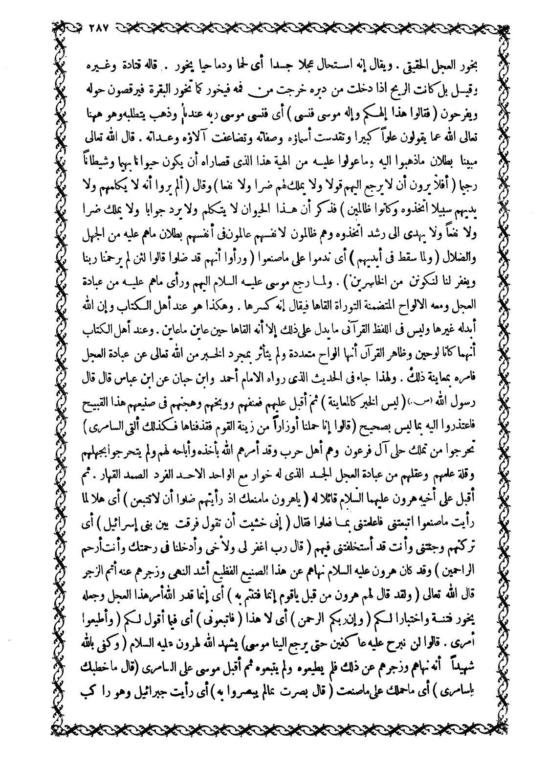 يَخُورُ الْعِجْلُ الْحَقِيقِيُّ. وَيُقَالُ إِنَّهُ اسْتَحَالَ عِجْلًا جَسَدًا أَيْ لَحْمًا وَدَمًا حَيًّا يَخُورُ. قَالَهُ قَتَادَةُ وَغَيْرُهُ وَقِيلَ بَلْ كَانَتِ الرِّيحُ إِذَا دَخَلَتْ مِنْ دُبُرِهِ خَرَجَتْ مِنْ فَمِهِ فَيَخُورُ كَمَا تَخُورُ الْبَقَرَةُ فَيَرْقُصُونَ حَوْلَهُ وَيَفْرَحُونَ فَقالُوا هذا إِلهُكُمْ وَإِلهُ مُوسى فَنَسِيَ 20: 88 أَيْ فَنَسِيَ مُوسَى رَبَّهُ عِنْدَنَا وَذَهَبَ يَتَطَلَّبُهُ وَهُوَ هَاهُنَا تَعَالَى اللَّهُ عَمَّا يَقُولُونَ عُلُوًّا كَبِيرًا وَتَقَدَّسَتْ أَسْمَاؤُهُ وَصِفَاتُهُ وَتَضَاعَفَتْ آلَاؤُهُ وَعِدَاتُهُ. قال الله تعالى مبينا بُطْلَانَ مَا ذَهَبُوا إِلَيْهِ وَمَا عَوَّلُوا عَلَيْهِ مِنْ إِلَهِيَّةِ هَذَا الَّذِي قُصَارَاهُ أَنْ يَكُونَ حَيَوَانًا بَهِيمًا وَشَيْطَانًا رَجِيمًا أَفَلا يَرَوْنَ أَلَّا يَرْجِعُ إِلَيْهِمْ قَوْلًا وَلا يَمْلِكُ لَهُمْ ضَرًّا وَلا نَفْعاً 20: 89 وَقَالَ أَلَمْ يَرَوْا أَنَّهُ لَا يُكَلِّمُهُمْ وَلا يَهْدِيهِمْ سَبِيلًا اتَّخَذُوهُ وَكانُوا ظالِمِينَ 7: 148 فَذَكَرَ أَنَّ هَذَا الْحَيَوَانَ لَا يَتَكَلَّمُ وَلَا يَرُدُّ جَوَابًا وَلَا يَمْلِكُ ضَرًّا وَلَا نَفْعًا وَلَا يَهْدِي إِلَى رُشْدٍ اتَّخَذُوهُ وَهُمْ ظَالِمُونَ لِأَنْفُسِهِمْ عَالِمُونَ فِي أَنْفُسِهِمْ بُطْلَانَ مَا هُمْ عَلَيْهِ مِنَ الْجَهْلِ وَالضَّلَالِ وَلَمَّا سُقِطَ فِي أَيْدِيهِمْ 7: 149 أَيْ نَدِمُوا عَلَى مَا صَنَعُوا وَرَأَوْا أَنَّهُمْ قَدْ ضَلُّوا قالُوا لَئِنْ لَمْ يَرْحَمْنا رَبُّنا وَيَغْفِرْ لَنا لَنَكُونَنَّ مِنَ الْخاسِرِينَ 7: 149. وَلَمَّا رَجَعَ مُوسَى عَلَيْهِ السَّلَامُ إِلَيْهِمْ وَرَأَى مَا هُمْ عَلَيْهِ مِنْ عِبَادَةِ الْعِجْلِ وَمَعَهُ الْأَلْوَاحُ الْمُتَضَمِّنَةُ التَّوْرَاةَ أَلْقَاهَا فَيُقَالُ إِنَّهُ كَسَرَهَا. وَهَكَذَا هُوَ عِنْدَ أَهْلِ الْكِتَابِ وَإِنَّ اللَّهَ أَبْدَلَهُ غَيْرَهَا وَلَيْسَ فِي اللَّفْظِ الْقُرْآنِيِّ مَا يَدُلُّ عَلَى ذَلِكَ إِلَّا أَنَّهُ أَلْقَاهَا حِينَ عَايَنَ مَا عَايَنَ. وَعِنْدَ أَهْلِ الْكِتَابِ أَنَّهُمَا كَانَا لَوْحَيْنِ وَظَاهِرُ الْقُرْآنِ أَنَّهَا أَلْوَاحٌ مُتَعَدِّدَةٌ وَلَمْ يَتَأَثَّرْ بِمُجَرَّدِ الْخَبَرِ مِنَ اللَّهِ تَعَالَى عَنْ عِبَادَةِ الْعِجْلِ فَأَمَرَهُ بِمُعَايَنَةِ ذَلِكَ. وَلِهَذَا جَاءَ فِي الْحَدِيثِ الَّذِي رَوَاهُ الْإِمَامُ أَحْمَدُ وَابْنُ حِبَّانَ عَنِ ابْنِ عَبَّاسٍ قَالَ قَالَ رَسُولُ اللَّهِ صَلَّى اللَّهُ عَلَيْهِ وَسَلَّمَ (لَيْسَ الْخَبَرُ كَالْمُعَايَنَةِ) ثُمَّ أَقْبَلَ عَلَيْهِمْ فَعَنَّفَهُمْ وَوَبَّخَهُمْ وَهَجَّنَهُمْ فِي صَنِيعِهِمْ هَذَا الْقَبِيحِ فَاعْتَذَرُوا إِلَيْهِ بِمَا لَيْسَ بِصَحِيح قَالُوا إِنَّا حُمِّلْنا أَوْزاراً مِنْ زِينَةِ الْقَوْمِ فَقَذَفْناها فَكَذلِكَ أَلْقَى السَّامِرِيُّ 20: 87 تَحَرَّجُوا مِنْ تَمَلُّكِ حُلِيِّ آلِ فِرْعَوْنَ وَهُمْ أَهْلُ حَرْبٍ وَقَدْ أَمَرَهُمُ اللَّهُ بِأَخْذِهِ وَأَبَاحَهُ لَهُمْ وَلَمْ يَتَحَرَّجُوا بِجَهْلِهِمْ وَقِلَّةِ عِلْمِهِمْ وَعَقْلِهِمْ مِنْ عِبَادَةِ الْعِجْلِ الْجَسَدِ الَّذِي لَهُ خُوَارٌ مَعَ الْوَاحِدِ الْأَحَدِ الْفَرْدِ الصَّمَدِ الْقَهَّارِ. ثُمَّ أَقْبَلَ عَلَى أَخِيهِ هَارُونَ عَلَيْهِمَا السَّلَامُ قَائِلًا له يَا هارُونُ مَا مَنَعَكَ إِذْ رَأَيْتَهُمْ ضَلُّوا أَلَّا تَتَّبِعَنِ 20: 92- 93 أَيْ هَلَّا لَمَّا رَأَيْتَ مَا صَنَعُوا اتَّبَعْتَنِي فَأَعْلَمْتَنِي بِمَا فَعَلُوا فَقَالَ إِنِّي خَشِيتُ أَنْ تَقُولَ فَرَّقْتَ بَيْنَ بَنِي إِسْرائِيلَ 20: 94 أَيْ تَرَكْتَهُمْ وَجِئْتَنِي وَأَنْتَ قَدِ اسْتَخْلَفْتَنِي فِيهِمْ قَالَ رَبِّ اغْفِرْ لِي وَلِأَخِي وَأ