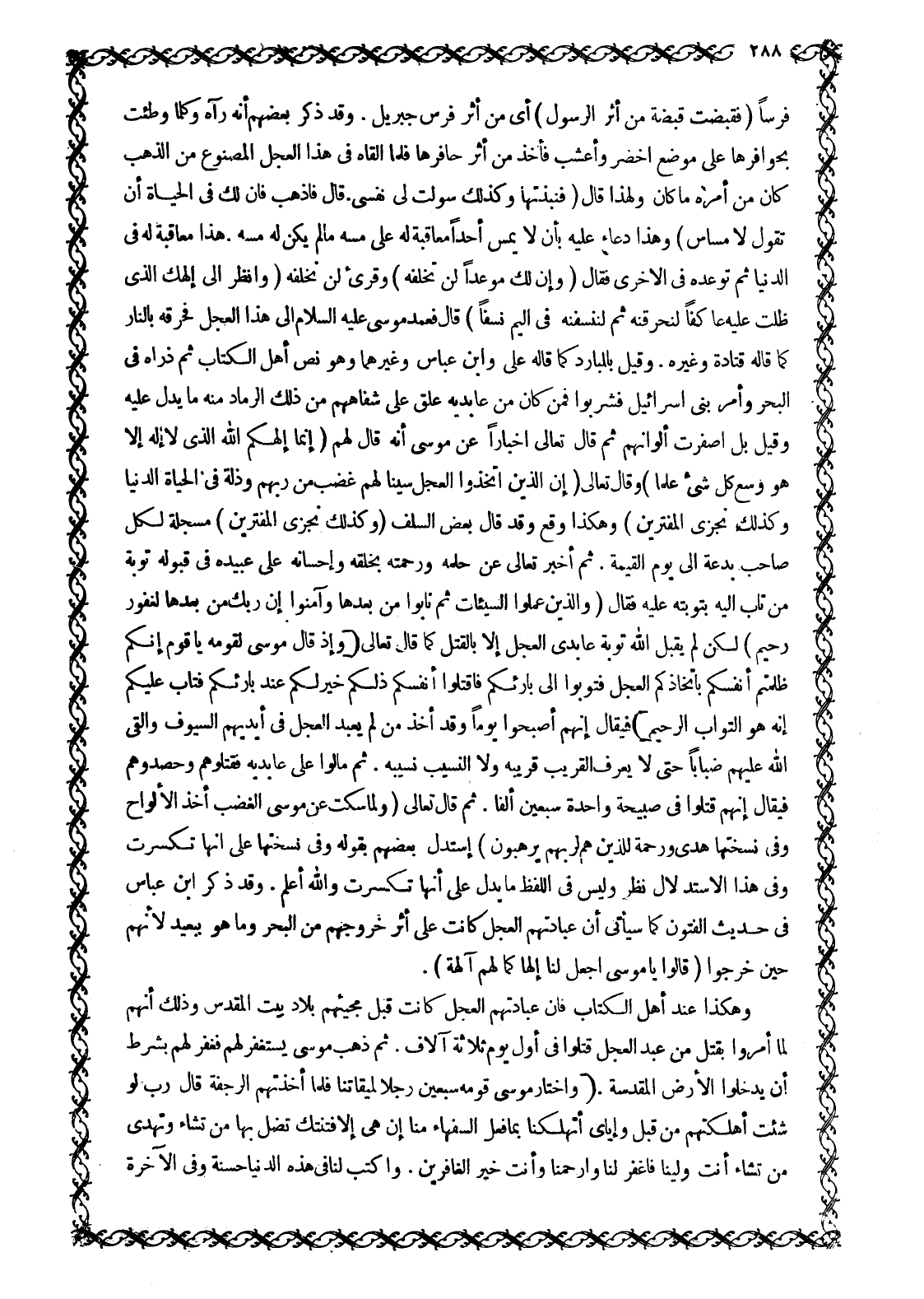 فرسا فَقَبَضْتُ قَبْضَةً من أَثَرِ الرَّسُولِ 20: 96 أَيْ مِنْ أَثَرِ فَرَسِ جِبْرِيلَ. وَقَدْ ذَكَرَ بعضهم أنه رآه وكلما وَطِئَتْ بِحَوَافِرِهَا عَلَى مَوْضِعٍ اخْضَرَّ وَأَعْشَبَ فَأَخَذَ مِنْ أَثَرِ حَافِرِهَا فَلَمَّا أَلْقَاهُ فِي هَذَا الْعِجْلِ الْمَصْنُوعِ مِنَ الذَّهَبِ كَانَ مِنْ أَمْرِهِ مَا كَانَ وَلِهَذَا قَالَ فَنَبَذْتُها وَكَذلِكَ سَوَّلَتْ لِي نَفْسِي. قَالَ فَاذْهَبْ فَإِنَّ لَكَ فِي الْحَياةِ أَنْ تَقُولَ لا مِساسَ 20: 96- 97 وَهَذَا دُعَاءٌ عَلَيْهِ بِأَنْ لَا يَمَسَّ أَحَدًا مُعَاقَبَةً لَهُ عَلَى مَسِّهِ مَا لَمْ يَكُنْ لَهُ مَسُّهُ. هَذَا مُعَاقَبَةٌ لَهُ فِي الدُّنْيَا ثُمَّ تَوَعَّدَهُ فِي الْأُخْرَى فَقَالَ وَإِنَّ لَكَ مَوْعِداً لَنْ تُخْلَفَهُ 20: 97 وقرئ لَنْ نُخْلِفَهُ وَانْظُرْ إِلى إِلهِكَ الَّذِي ظَلْتَ عَلَيْهِ عاكِفاً لَنُحَرِّقَنَّهُ ثُمَّ لَنَنْسِفَنَّهُ فِي الْيَمِّ نَسْفاً 20: 97 قَالَ فَعَمَدَ مُوسَى عَلَيْهِ السَّلَامُ إِلَى هَذَا العجل فحرقه بالنار كما قاله قتادة وغيره. وقيل بالبارد كَمَا قَالَهُ عَلِيٌّ وَابْنُ عَبَّاسٍ وَغَيْرُهُمَا وَهُوَ نَصُّ أَهْلِ الْكِتَابِ ثُمَّ ذَرَّاهُ فِي الْبَحْرِ وَأَمَرَ بَنِي إِسْرَائِيلَ فَشَرِبُوا فَمَنْ كَانَ مِنْ عَابِدِيهِ عَلَّقَ عَلَى شِفَاهِهِمْ مِنْ ذَلِكَ الرَّمَادِ مِنْهُ مَا يَدُلُّ عَلَيْهِ وَقِيلَ بَلِ اصْفَرَّتْ أَلْوَانُهُمْ ثُمَّ قَالَ تَعَالَى إِخْبَارًا عَنْ مُوسَى أَنَّهُ قَالَ لَهُمْ إِنَّما إِلهُكُمُ اللَّهُ الَّذِي لا إِلهَ إِلَّا هُوَ وَسِعَ كُلَّ شَيْءٍ عِلْماً 20: 98 وَقَالَ تَعَالَى إِنَّ الَّذِينَ اتَّخَذُوا الْعِجْلَ سَيَنالُهُمْ غَضَبٌ مِنْ رَبِّهِمْ وَذِلَّةٌ فِي الْحَياةِ الدُّنْيا وَكَذلِكَ نَجْزِي الْمُفْتَرِينَ 7: 152 وَهَكَذَا وَقَعَ وَقَدْ قَالَ بَعْضُ السَّلَفِ وَكَذلِكَ نَجْزِي الْمُفْتَرِينَ 7: 152 مسجلة لكل صاحب بدعة الى يوم القيمة. ثُمَّ أَخْبَرَ تَعَالَى عَنْ حِلْمِهِ وَرَحْمَتِهِ بِخَلْقِهِ وَإِحْسَانِهِ عَلَى عَبِيدِهِ فِي قَبُولِهِ تَوْبَةَ مَنْ تَابَ إِلَيْهِ بِتَوْبَتِهِ عَلَيْهِ فَقَالَ وَالَّذِينَ عَمِلُوا السَّيِّئاتِ ثُمَّ تابُوا مِنْ بَعْدِها وَآمَنُوا إِنَّ رَبَّكَ من بَعْدِها لَغَفُورٌ رَحِيمٌ 7: 153 لَكِنْ لَمْ يَقْبَلِ اللَّهُ تَوْبَةَ عَابِدِي الْعِجْلِ إِلَّا بِالْقَتْلِ كَمَا قَالَ تَعَالَى وَإِذْ قَالَ مُوسى لِقَوْمِهِ يَا قَوْمِ إِنَّكُمْ ظَلَمْتُمْ أَنْفُسَكُمْ بِاتِّخاذِكُمُ الْعِجْلَ فَتُوبُوا إِلى بارِئِكُمْ فَاقْتُلُوا أَنْفُسَكُمْ ذلِكُمْ خَيْرٌ لَكُمْ عِنْدَ بارِئِكُمْ فَتابَ عَلَيْكُمْ إِنَّهُ هُوَ التَّوَّابُ الرَّحِيمُ 2: 54 فَيُقَالُ إِنَّهُمْ أَصْبَحُوا يَوْمًا وَقَدْ أَخَذَ مَنْ لَمْ يَعْبُدِ الْعِجْلَ فِي أَيْدِيهِمُ السُّيُوفَ وَأَلْقَى الله عليهم ضَبَابًا حَتَّى لَا يَعْرِفَ الْقَرِيبُ قَرِيبَهُ وَلَا النَّسِيبُ نَسِيبَهُ. ثُمَّ مَالُوا عَلَى عَابِدِيهِ فَقَتَلُوهُمْ وَحَصَدُوهُمْ فَيُقَالُ إِنَّهُمْ قَتَلُوا فِي صَبِيحَةٍ وَاحِدَةٍ سَبْعِينَ أَلْفًا. ثُمَّ قَالَ تَعَالَى وَلَمَّا سَكَتَ عَنْ مُوسَى الْغَضَبُ أَخَذَ الْأَلْواحَ وَفي نُسْخَتِها هُدىً وَرَحْمَةٌ لِلَّذِينَ هُمْ لِرَبِّهِمْ يَرْهَبُونَ 7: 154 استدل بعضهم بقوله وفي نسختها عَلَى أَنَّهَا تَكَسَّرَتْ وَفِي هَذَا الِاسْتِدْلَالِ نَظَرٌ وَلَيْسَ فِي اللَّفْظِ مَا يَدُلُّ عَلَى أَنَّهَا تَكَسَّرَتْ وَاللَّهُ أَعْلَمُ. وَقَدْ ذَكَرَ ابْنُ عَبَّاسٍ فِي حَدِيثِ الْفُتُونِ كَمَا سَيَأْتِي أَنَّ عِبَادَتَهُمُ الْعِجْلَ كَانَتْ عَلَى أَثَرِ خُرُوجِهِمْ مِنَ الْبَحْرِ وَمَا هُوَ بِبَعِيدٍ لِأَنَّهُمْ حِينَ خَرَجُوا قالُوا يَا مُوسَى اجْعَلْ لَنا إِلهاً كَما لَهُمْ آلِهَةٌ 7: 138.