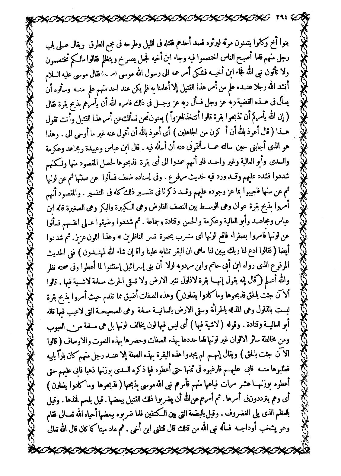 بَنُو أَخٍ وَكَانُوا يَتَمَنَّوْنَ مَوْتَهُ لِيَرِثُوهُ فَعَمَدَ أَحَدُهُمْ فَقَتَلَهُ فِي اللَّيْلِ وَطَرْحَهُ فِي مَجْمَعِ الطُّرُقِ وَيُقَالُ عَلَى بَابِ رَجُلٍ مِنْهُمْ فَلَمَّا أَصْبَحَ النَّاسُ اخْتَصَمُوا فِيهِ وَجَاءَ ابْنُ أَخِيهِ فَجَعَلَ يَصْرُخُ وَيَتَظَلَّمُ فَقَالُوا مَا لَكُمْ تَخْتَصِمُونَ وَلَا تَأْتُونَ نَبِيَّ اللَّهِ فَجَاءَ ابْنُ أَخِيهِ فَشَكَى أَمْرَ عَمِّهِ إِلَى رَسُولِ اللَّهِ مُوسَى صلّى الله عليه وسلّم فَقَالَ مُوسَى عَلَيْهِ السَّلَامُ أَنْشُدُ اللَّهَ رَجُلًا عِنْدَهُ عِلْمٌ مِنْ أَمْرِ هَذَا الْقَتِيلِ إِلَّا أَعْلَمَنَا بِهِ فَلَمْ يَكُنْ عِنْدَ أَحَدٍ مِنْهُمْ علم منه وَسَأَلُوهُ أَنَّ يَسْأَلَ فِي هَذِهِ الْقَضِيَّةِ رَبَّهُ عَزَّ وَجَلَّ فَسَأَلَ رَبَّهُ عَزَّ وَجَلَّ فِي ذَلِكَ فَأَمَرَهُ اللَّهُ أَنْ يَأْمُرَهُمْ بِذَبْحِ بَقَرَةٍ فَقَالَ إِنَّ اللَّهَ يَأْمُرُكُمْ أَنْ تَذْبَحُوا بَقَرَةً قالُوا أَتَتَّخِذُنا هُزُواً 2: 67 يَعْنُونَ نَحْنُ نَسْأَلُكَ عَنْ أَمْرِ هَذَا الْقَتِيلِ وَأَنْتَ تَقُولُ هَذَا قَالَ أَعُوذُ بِاللَّهِ أَنْ أَكُونَ من الْجاهِلِينَ 2: 67 أَيْ أَعُوذُ باللَّه أَنْ أَقُولَ عَنْهُ غَيْرَ مَا أَوْحَى إِلَيَّ. وَهَذَا هُوَ الَّذِي أَجَابَنِي حِينَ سَأَلْتُهُ عَمَّا سَأَلْتُمُونِي عَنْهُ أَنْ أَسْأَلَهُ فِيهِ. قَالَ ابْنُ عَبَّاسٍ وَعَبِيدَةُ وَمُجَاهِدٌ وَعِكْرِمَةُ وَالسُّدِّيُّ وَأَبُو الْعَالِيَةِ وَغَيْرُ وَاحِدٍ فَلَوْ أَنَّهُمْ عَمَدُوا إِلَى أَيِّ بَقَرَةٍ فَذَبَحُوهَا لَحَصَلَ الْمَقْصُودُ منها ولكنهم شددوا فشدد عَلَيْهِمْ وَقَدْ وَرَدَ فِيهِ حَدِيثٌ مَرْفُوعٌ. وَفِي إِسْنَادِهِ ضَعْفٌ فَسَأَلُوا عَنْ صِفَتِهَا ثُمَّ عَنْ لَوْنِهَا ثُمَّ عَنْ سِنِّهَا فَأُجِيبُوا بِمَا عَزَّ وُجُودُهُ عَلَيْهِمْ وَقَدْ ذَكَرْنَا فِي تَفْسِيرِ ذَلِكَ كُلِّهِ فِي التَّفْسِيرِ. وَالْمَقْصُودُ أَنَّهُمْ أُمِرُوا بِذَبْحِ بَقَرَةٍ عَوَانٍ وَهِيَ الْوَسَطُ بَيْنَ النِّصْفِ الْفَارِضِ وَهِيَ الْكَبِيرَةُ وَالْبِكْرُ وَهِيَ الصَّغِيرَةُ قَالَهُ ابْنُ عَبَّاسٍ وَمُجَاهِدٌ وَأَبُو الْعَالِيَةِ وَعِكْرِمَةُ وَالْحَسَنُ وَقَتَادَةُ وَجَمَاعَةٌ. ثُمَّ شَدَّدُوا وَضَيَّقُوا عَلَى أَنْفُسِهِمْ فَسَأَلُوا عَنْ لَوْنِهَا فَأُمِرُوا بِصَفْرَاءَ فَاقِعٍ لَوْنُهَا أَيْ مُشْرَبٍ بِحُمْرَةٍ تَسُرُّ النَّاظِرِينَ وَهَذَا اللَّوْنُ عَزِيزٌ. ثم شددوا أيضا ف قالُوا ادْعُ لَنا رَبَّكَ يُبَيِّنْ لَنا مَا هِيَ إِنَّ الْبَقَرَ تَشابَهَ عَلَيْنا وَإِنَّا إِنْ شاءَ الله لَمُهْتَدُونَ 2: 70 فَفِي الْحَدِيثِ الْمَرْفُوعِ الَّذِي رَوَاهُ ابْنُ أَبِي حَاتِمٍ وَابْنُ مَرْدَوَيْهِ لَوْلَا أَنَّ بَنِي إِسْرَائِيلَ اسْتَثْنَوْا لَمَا أُعْطُوا وَفِي صِحَّتِهِ نَظَرٌ وَاللَّهُ أَعْلَمُ قَالَ إِنَّهُ يَقُولُ إِنَّها بَقَرَةٌ لَا ذَلُولٌ تُثِيرُ الْأَرْضَ وَلا تَسْقِي الْحَرْثَ مُسَلَّمَةٌ لَا شِيَةَ فِيها. قالُوا الْآنَ جِئْتَ بِالْحَقِّ فَذَبَحُوها وَما كادُوا يَفْعَلُونَ 2: 71 وَهَذِهِ الصِّفَاتُ أَضْيَقُ مِمَّا تَقَدَّمَ حَيْثُ أُمِرُوا بِذَبْحِ بَقَرَةٍ لَيْسَتْ بِالذَّلُولِ وَهِيَ الْمُذَلَّلَةُ بِالْحِرَاثَةِ وَسَقْيِ الْأَرْضِ بِالسَّانِيَةِ مُسَلَّمَةٌ وَهِيَ الصَّحِيحَةُ الَّتِي لَا عَيْبَ فِيهَا قَالَهُ أَبُو الْعَالِيَةِ وَقَتَادَةُ. وقوله لا شِيَةَ فِيها 2: 71 أَيْ لَيْسَ فِيهَا لَوْنٌ يُخَالِفُ لَوْنَهَا بَلْ هِيَ مُسَلَّمَةٌ مِنَ الْعُيُوبِ وَمِنْ مُخَالَطَةِ سَائِرِ الْأَلْوَانِ غَيْرِ لَوْنِهَا فَلَمَّا حَدَّدَهَا بِهَذِهِ الصِّفَاتِ وَحَصَرَهَا بِهَذِهِ النُّعُوتِ وَالْأَوْصَافِ قالُوا الْآنَ جِئْتَ بِالْحَقِّ 2: 71 وَيُقَالُ إِنَّه