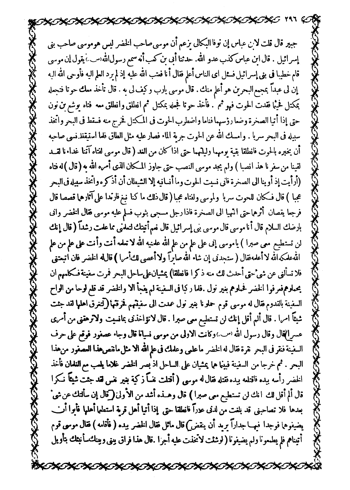 جُبَيْرٍ قَالَ قُلْتُ لِابْنِ عَبَّاسٍ إِنَّ نَوْفًا الْبِكَالِيَّ يَزْعُمُ أَنَّ مُوسَى صَاحِبَ الْخَضِرِ لَيْسَ هُوَ مُوسَى صَاحِبَ بَنِي إِسْرَائِيلَ. قَالَ ابْنُ عَبَّاسٍ كَذَبَ عَدُوُّ اللَّهِ. حَدَّثَنَا أُبَيُّ بْنُ كَعْبٍ أَنَّهُ سَمِعَ رَسُولَ اللَّهِ صَلَّى اللَّهُ عَلَيْهِ وَسَلَّمَ يَقُولُ إِنَّ مُوسَى قَامَ خَطِيبًا فِي بَنِي إِسْرَائِيلَ فَسُئِلَ أَيُّ النَّاسِ أَعْلَمُ فَقَالَ أَنَا فَعَتَبَ اللَّهُ عَلَيْهِ إِذْ لَمْ يَرُدَّ الْعِلْمَ إِلَيْهِ فَأَوْحَى اللَّهُ إِلَيْهِ إِنَّ لِي عَبْدًا بِمَجْمَعِ الْبَحْرَيْنِ هُوَ أَعْلَمُ مِنْكَ. قَالَ مُوسَى يَا رَبِّ وَكَيْفَ لِي بِهِ. قال تأخذ معك حوتا فتجعله بمكتل فَحَيْثُمَا فَقَدْتَ الْحُوتَ فَهُوَ ثَمَّ. فَأَخَذَ حُوتًا فَجَعَلَهُ بِمِكْتَلٍ ثُمَّ انْطَلَقَ وَانْطَلَقَ مَعَهُ فَتَاهَ يُوشَعُ بْنُ نُونٍ حَتَّى إِذَا أَتَيَا الصَّخْرَةَ وَضَعَا رُءُوسَهُمَا فَنَامَا وَاضْطَرَبَ الْحُوتَ فِي الْمِكْتَلِ فَخَرَجَ مِنْهُ فَسَقَطَ فِي الْبَحْرِ وَاتَّخَذَ سَبِيلَهُ فِي الْبَحْرِ سَرَبًا. وَأَمْسَكَ اللَّهُ عَنِ الْحُوتِ جَرْيَةَ الْمَاءِ فَصَارَ عَلَيْهِ مِثْلُ الطَّاقِ فَلَمَّا اسْتَيْقَظَ نَسِيَ صَاحِبُهُ أَنْ يُخْبِرَهُ بِالْحُوتِ فَانْطَلَقَا بَقِيَّةَ يَوْمِهِمَا وَلَيْلَتِهِمَا حَتَّى إِذَا كَانَ مِنَ الغد قَالَ لِفَتاهُ آتِنا غَداءَنا لَقَدْ لَقِينا مِنْ سَفَرِنا هذا نَصَباً 18: 62 وَلَمْ يَجِدْ مُوسَى النَّصَبَ حَتَّى جَاوَزَ الْمَكَانَ الَّذِي أَمَرَهُ اللَّهُ بِهِ قَالَ لَهُ فَتَاهَ أَرَأَيْتَ إِذْ أَوَيْنا إِلَى الصَّخْرَةِ فَإِنِّي نَسِيتُ الْحُوتَ وَما أَنْسانِيهُ إِلَّا الشَّيْطانُ أَنْ أَذْكُرَهُ وَاتَّخَذَ سَبِيلَهُ في الْبَحْرِ عَجَباً 18: 63 قَالَ فَكَانَ لِلْحُوتِ سَرَبًا وَلِمُوسَى وَلِفَتَاهُ عَجَبًا قَالَ ذلِكَ مَا كُنَّا نَبْغِ فَارْتَدَّا عَلى آثارِهِما قَصَصاً 18: 64 قَالَ فَرَجَعَا يَقُصَّانِ أَثَرَهُمَا حَتَّى انْتَهَيَا إِلَى الصَّخْرَةِ فَإِذَا رَجُلٌ مُسَجًّى بِثَوْبٍ فَسَلَّمَ عَلَيْهِ مُوسَى فَقَالَ الْخَضِرُ وَأَنَّى بِأَرْضِكَ السَّلَامُ قَالَ أَنَا مُوسَى قَالَ مُوسَى بَنِي إِسْرَائِيلَ قَالَ نَعَمْ أَتَيْتُكَ لِتُعَلِّمَنِي مِمَّا عُلِّمْتَ رُشْدًا قَالَ إِنَّكَ لَنْ تَسْتَطِيعَ مَعِيَ صَبْراً 18: 67 يَا مُوسَى إِنِّي عَلَى عِلْمٍ مِنْ عِلْمِ اللَّهِ عَلَّمَنِيهِ اللَّهُ لَا تَعْلَمُهُ أَنْتَ وَأَنْتَ عَلَى عِلْمٍ مَنْ عِلْمِ اللَّهِ عَلَّمَكَهُ اللَّهُ لا أعلمه فقال سَتَجِدُنِي إِنْ شاءَ اللَّهُ صابِراً وَلا أَعْصِي لَكَ أَمْراً 18: 69 قال له الخضر فَإِنِ اتَّبَعْتَنِي فَلا تَسْئَلْنِي عَنْ شَيْءٍ حَتَّى أُحْدِثَ لَكَ مِنْهُ ذِكْراً 18: 70 فَانْطَلَقَا يَمْشِيَانِ عَلَى سَاحِلِ الْبَحْرِ فَمَرَّتْ سَفِينَةٌ فَكَلَّمَهُمْ أَنْ يَحْمِلُوهُمْ فَعَرَفُوا الْخَضِرَ فَحَمَلُوهُمْ بِغَيْرِ نَوْلٍ. فَلَمَّا رَكِبَا فِي السَّفِينَةِ لَمْ يَفْجَأْ إِلَّا وَالْخَضِرُ قَدْ قَلَعَ لَوْحًا مِنْ أَلْوَاحِ السَّفِينَةِ بِالْقَدُومِ فَقَالَ لَهُ مُوسَى قَوْمٌ حَمَلُونَا بِغَيْرِ نَوْلٍ عَمَدْتَ إِلَى سَفِينَتِهِمْ فَخَرَقْتَهَا لِتُغْرِقَ أَهْلَها لَقَدْ جِئْتَ شَيْئاً إِمْراً. قَالَ أَلَمْ أَقُلْ إِنَّكَ لَنْ تَسْتَطِيعَ مَعِيَ صَبْراً. قَالَ لَا تُؤاخِذْنِي بِما نَسِيتُ وَلا تُرْهِقْنِي مِنْ أَمْرِي عُسْراً 18: 71- 73 قَالَ وَقَالَ رَسُولُ اللَّهِ صَلَّى اللَّهُ عَلَيْهِ وَسَلَّمَ وَكَانَتِ الْأُولَى مِنْ مُوسَى نِسْيَانًا قَالَ وَجَاءَ عُصْفُورٌ فَوَقَعَ عَلَى حَرْفِ السَّفِينَةِ فَنَقَرَ فِي الْبَحْرِ نَقْرَةً فَقَالَ لَهُ الْخَضِرُ مَا عِلْمِي وَعِلْمُكَ فِي عِلْمِ اللَّهِ إِلَّا مِثْلُ مَا 