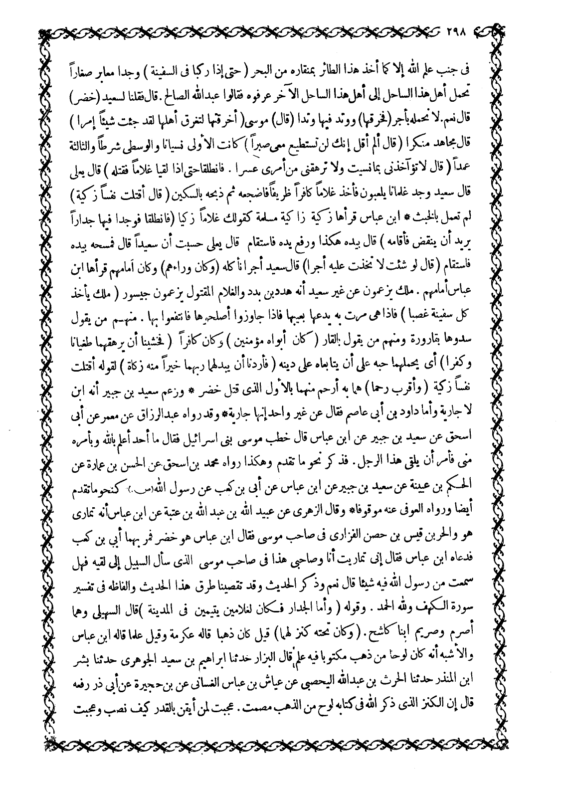 فِي جَنْبِ عِلْمِ اللَّهِ إِلَّا كَمَا أَخَذَ هَذَا الطَّائِرُ بِمِنْقَارِهِ مِنَ الْبَحْرِ حَتَّى إِذا رَكِبا فِي السَّفِينَةِ 18: 71 وَجَدَا مَعَابِرَ صِغَارًا تَحْمِلُ أَهْلَ هَذَا السَّاحِلِ إِلَى أَهْلِ هَذَا السَّاحِلِ الْآخَرِ عَرَفُوهُ فَقَالُوا عَبْدُ اللَّهِ الصَّالِحُ. قَالَ فَقُلْنَا لِسَعِيدٍ (خَضِرٌ) قَالَ نَعَمْ. لَا نَحْمِلُهُ بأجر خَرَقَها 18: 71 وَوَتَّدَ فِيهَا وَتِدًا قَالَ مُوسَى أَخَرَقْتَها لِتُغْرِقَ أَهْلَها لَقَدْ جِئْتَ شَيْئاً إِمْراً 18: 71 قَالَ مُجَاهِدٌ مُنْكَرًا قَالَ أَلَمْ أَقُلْ إِنَّكَ لَنْ تَسْتَطِيعَ مَعِيَ صَبْراً 18: 72 كَانَتِ الْأُولَى نِسْيَانًا وَالْوُسْطَى شَرْطًا وَالثَّالِثَةُ عَمْدًا قَالَ لَا تُؤاخِذْنِي بِما نَسِيتُ وَلا تُرْهِقْنِي مِنْ أَمْرِي عُسْراً. فَانْطَلَقا حَتَّى إِذا لَقِيا غُلاماً فَقَتَلَهُ 18: 73- 74 قَالَ يَعْلَى قَالَ سَعِيدٌ وَجَدَ غِلْمَانًا يَلْعَبُونَ فَأَخَذَ غُلَامًا كَافِرًا ظَرِيفًا فَأَضْجَعَهُ ثُمَّ ذَبَحَهُ بالسكين قال أَقَتَلْتَ نَفْساً زَكِيَّةً 18: 74 لَمْ تَعْمَلْ بِالْخَبَثِ ابْنُ عَبَّاسٍ قَرَأَهَا زَكِيَّةً زَاكِيَةً مُسْلِمَةً كَقَوْلِكَ غُلَامًا زَكِيًّا فَانْطَلَقَا فَوَجَدا فِيها جِداراً يُرِيدُ أَنْ يَنْقَضَّ فَأَقامَهُ 18: 77 قال بِيَدِهِ هَكَذَا وَرَفَعَ يَدَهُ فَاسْتَقَامَ قَالَ يَعْلَى حَسِبْتُ أَنَّ سَعِيدًا قَالَ فَمَسَحَهُ بِيَدِهِ فَاسْتَقَامَ قَالَ لَوْ شِئْتَ لَاتَّخَذْتَ عَلَيْهِ أَجْراً 18: 77 قَالَ سَعِيدٌ أَجْرًا نَأْكُلُهُ وَكانَ وَراءَهُمْ 18: 79 وَكَانَ أَمَامَهُمْ قَرَأَهَا ابْنُ عَبَّاسٍ أَمَامَهُمْ. مَلِكٌ يَزْعُمُونَ عَنْ غَيْرِ سَعِيدٍ أَنَّهُ هُدَدُ بْنُ بُدَدَ وَالْغُلَامُ الْمَقْتُولُ يَزْعُمُونَ جَيْسُورُ مَلِكٌ يَأْخُذُ كُلَّ سَفِينَةٍ غَصْباً 18: 79 فَإِذَا هِيَ مَرَّتْ بِهِ يَدَعُهَا بِعَيْبِهَا فَإِذَا جَاوَزُوا أَصْلَحُوهَا فَانْتَفَعُوا بِهَا. مِنْهُمْ مَنْ يَقُولُ سدوها بقارورة ومنهم من يقول بالقار؟ كان أبواه مؤمنين وَكَانَ كَافِرًا فَخَشِينَا أَنْ يُرْهِقَهُمَا طُغْيَانًا وَكُفْرًا 18: 80؟ أَيْ يَحْمِلَهُمَا حُبُّهُ عَلَى أَنْ يُتَابِعَاهُ عَلَى دِينِهِ فَأَرَدْنا أَنْ يُبْدِلَهُما رَبُّهُما خَيْراً مِنْهُ زَكاةً 18: 81 لقوله أقتلت نفسا زكية وَأَقْرَبَ رُحْماً 18: 81 هما به أرحم منهما بالأول الّذي قتل خضر وزعم سعيد بن جبير أنه ابن لا جَارِيَةً وَأَمَّا دَاوُدُ بْنُ أَبِي عَاصِمٍ فَقَالَ عَنْ غَيْرِ وَاحِدٍ إِنَّهَا جَارِيَةٌ وَقَدْ رَوَاهُ عَبْدُ الرَّزَّاقِ عَنْ مَعْمَرٍ عَنْ أَبِي إِسْحَاقَ عَنْ سَعِيدِ بْنِ جُبَيْرٍ عَنِ ابْنِ عَبَّاسٍ قَالَ خَطَبَ مُوسَى بَنِي إِسْرَائِيلَ فَقَالَ مَا أَحَدٌ أَعْلَمُ باللَّه وَبِأَمْرِهِ مِنِّي فَأُمِرَ أَنْ يَلْقَى هَذَا الرَّجُلَ. فَذَكَرَ نَحْوَ مَا تَقَدَّمَ وَهَكَذَا رَوَاهُ مُحَمَّدُ بْنُ إِسْحَاقَ عَنِ الْحَسَنِ بن عمارة عن الحكم بن عيينة عَنْ سَعِيدِ بْنِ جُبَيْرٍ عَنِ ابْنِ عَبَّاسٍ عَنْ أُبَيِّ بْنِ كَعْبٍ عَنْ رَسُولِ اللَّهِ صَلَّى اللَّهُ عَلَيْهِ وَسَلَّمَ كَنَحْوِ مَا تَقَدَّمَ أَيْضًا وَرَوَاهُ الْعَوْفِيُّ عَنْهُ مَوْقُوفًا وَقَالَ الزُّهْرِيُّ عَنْ عُبَيْدِ اللَّهِ بْنِ عَبْدِ اللَّهِ بْنِ عُتْبَةَ عَنِ ابْنِ عَبَّاسٍ أَنَّهُ تَمَارَى هُوَ وَالْحُرُّ بْنُ قَيْسِ بْنِ حِصْنٍ الْفَزَارِيُّ فِي صَاحِبِ مُوسَى فَقَالَ ابْنُ عَبَّاسٍ هُوَ خَضِرٌ فَمَرَّ بِهِمَا أُبَيُّ بْنُ كَعْبٍ فَدَعَاهُ ابْنُ عَبَّاسٍ فَقَالَ إِنِّي تَمَارَيْتُ أَنَا وَصَاحِبِي هَذَا فِي صَاحِبِ مُوسَى الَّذِي سَأَلَ السَّبِيلَ إِلَى لُقِيِّهِ فَهَلْ سَمِعْتَ مِنْ رَسُولِ اللَّهِ فِيهِ شَيْئًا قَالَ نَعَمْ وَذَكَرَ الْحَدِيثَ وَقَدْ تَقَصَّيْنَا طُرُ