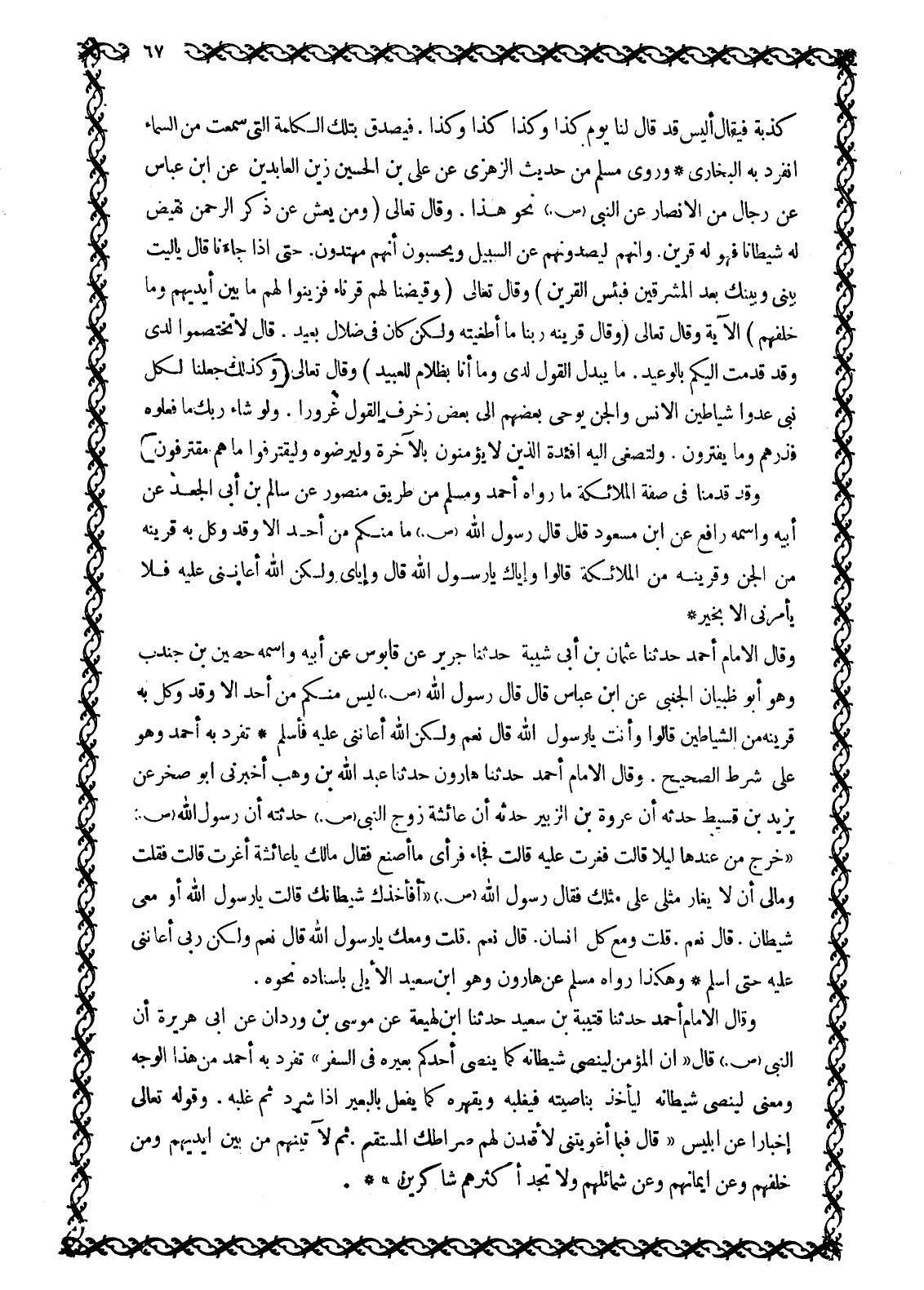 كِذِبَةٍ فَيُقَالُ أَلَيْسَ قَدْ قَالَ لَنَا يَوْمَ كَذَا وَكَذَا كَذَا وَكَذَا. فَيُصَدِّقُ بِتِلْكَ الْكَلِمَةِ الَّتِي سُمِعَتْ مِنَ السَّمَاءِ انْفَرَدَ بِهِ الْبُخَارِيُّ وَرَوَى مُسْلِمٌ مِنْ حَدِيثِ الزُّهْرِيِّ عَنْ عَلِيِّ بْنِ الْحُسَيْنِ زَيْنِ الْعَابِدِينَ عَنِ ابْنِ عَبَّاسٍ عَنْ رِجَالٍ مِنَ الْأَنْصَارِ عَنِ النَّبِيِّ صَلَّى اللَّهُ عَلَيْهِ وَسَلَّمَ نَحْوَ هَذَا. وَقَالَ تَعَالَى وَمن يَعْشُ عَنْ ذِكْرِ الرَّحْمنِ نُقَيِّضْ لَهُ شَيْطاناً فَهُوَ لَهُ قَرِينٌ. وَإِنَّهُمْ لَيَصُدُّونَهُمْ عَنِ السَّبِيلِ وَيَحْسَبُونَ أَنَّهُمْ مُهْتَدُونَ. حَتَّى إِذا جاءَنا قَالَ يَا لَيْتَ بَيْنِي وَبَيْنَكَ بُعْدَ الْمَشْرِقَيْنِ فَبِئْسَ الْقَرِينُ 43: 36- 38 وقال تعالى وَقَيَّضْنا لَهُمْ قُرَناءَ فَزَيَّنُوا لَهُمْ ما بَيْنَ أَيْدِيهِمْ وَما خَلْفَهُمْ 41: 25 الْآيَةَ وَقَالَ تَعَالَى قَالَ قَرِينُهُ رَبَّنا مَا أَطْغَيْتُهُ وَلكِنْ كانَ فِي ضَلالٍ بَعِيدٍ. قَالَ لَا تَخْتَصِمُوا لَدَيَّ وَقَدْ قَدَّمْتُ إِلَيْكُمْ بِالْوَعِيدِ. مَا يُبَدَّلُ الْقَوْلُ لَدَيَّ وَما أَنَا بِظَلَّامٍ لِلْعَبِيدِ) 50: 27- 29 وَقَالَ تَعَالَى وَكَذلِكَ جَعَلْنا لِكُلِّ نَبِيٍّ عَدُوًّا شَياطِينَ الْإِنْسِ وَالْجِنِّ يُوحِي بَعْضُهُمْ إِلى بَعْضٍ زُخْرُفَ الْقَوْلِ غُرُوراً. وَلَوْ شاءَ رَبُّكَ مَا فَعَلُوهُ فَذَرْهُمْ وَما يَفْتَرُونَ. وَلِتَصْغى إِلَيْهِ أَفْئِدَةُ الَّذِينَ لَا يُؤْمِنُونَ بِالْآخِرَةِ وَلِيَرْضَوْهُ وَلِيَقْتَرِفُوا مَا هُمْ مُقْتَرِفُونَ 6: 112- 113 وَقَدْ قَدَّمْنَا فِي صِفَةِ الْمَلَائِكَةِ مَا رَوَاهُ أَحْمَدُ وَمُسْلِمٌ مِنْ طَرِيقِ مَنْصُورٍ عَنْ سَالِمِ بْنِ أَبِي الْجَعْدِ عَنْ أَبِيهِ وَاسْمُهُ رَافِعٌ عَنِ ابْنِ مَسْعُودٍ قَالَ قَالَ رَسُولُ اللَّهِ صَلَّى اللَّهُ عَلَيْهِ وَسَلَّمَ مَا مِنْكُمْ مِنْ أَحَدٍ إِلَّا وَقَدْ وُكِّلَ بِهِ قَرِينُهُ مِنَ الْجِنِّ وَقَرِينُهُ مِنَ الْمَلَائِكَةِ قَالُوا وَإِيَّاكَ يَا رَسُولَ اللَّهِ قَالَ وَإِيَّايَ وَلَكِنَّ اللَّهَ أَعَانَنِي عَلَيْهِ فَلَا يَأْمُرُنِي إِلَّا بِخَيْرٍ وَقَالَ الْإِمَامُ أَحْمَدُ حَدَّثَنَا عُثْمَانُ بْنُ أَبِي شَيْبَةَ حَدَّثَنَا جَرِيرٌ عَنْ قَابُوسَ عَنْ أَبِيهِ وَاسْمُهُ حُصَيْنُ بْنُ جُنْدُبٍ وَهُوَ أَبُو ظَبْيَانَ الْجَنْبِيُّ عَنِ ابْنِ عَبَّاسٍ قَالَ قَالَ رَسُولُ اللَّهِ صَلَّى اللَّهُ عَلَيْهِ وَسَلَّمَ لَيْسَ مِنْكُمْ مِنْ أَحَدٍ إِلَّا وَقَدْ وُكِّلَ بِهِ قَرِينُهُ مِنَ الشَّيَاطِينِ قَالُوا وَأَنْتَ يَا رَسُولَ اللَّهِ قَالَ نَعَمْ وَلَكِنَّ اللَّهَ أَعَانَنِي عَلَيْهِ فَأَسْلَمَ تَفَرَّدَ بِهِ أَحْمَدُ وَهُوَ عَلَى شَرْطِ الصَّحِيحِ. وَقَالَ الْإِمَامُ أَحْمَدُ حَدَّثَنَا هَارُونُ حَدَّثَنَا عَبْدُ اللَّهِ بْنُ وَهْبٍ أَخْبَرَنِي أَبُو صَخْرٍ عَنْ يَزِيدَ بْنِ قُسَيْطٍ حَدَّثَهُ أَنَّ عُرْوَةَ بْنَ الزُّبَيْرِ حَدَّثَهُ أَنَّ عَائِشَةَ زَوْجَ النَّبِيِّ صَلَّى اللَّهُ عَلَيْهِ وَسَلَّمَ حَدَّثَتْهُ أَنَّ رَسُولَ اللَّهِ صَلَّى اللَّهُ عَلَيْهِ وَسَلَّمَ «خَرَجَ مِنْ عِنْدِهَا لَيْلًا قَالَتْ فَغِرْتُ عَلَيْهِ قَالَتْ فَجَاءَ فَرَأَى مَا أَصْنَعُ فَقَالَ مَالَكِ يَا عَائِشَةُ أَغِرْتِ قَالَتْ فَقُلْتُ وما لي أَنْ لَا يَغَارَ مِثْلِي عَلَى مِثْلِكَ فَقَالَ رَسُولُ اللَّهِ صَلَّى اللَّهُ عَلَيْهِ وَسَلَّمَ «أَفَأَخَذَكِ شيطانك قالت يا رسول الله أومعى شَيْطَانٌ. قَالَ نَعَمْ. قُلْتُ وَمَعَ كُلِّ إِنْسَانٍ. قَالَ نَعَمْ. قُلْتُ وَمَعَكَ يَا رَسُولَ اللَّهِ قَالَ نَعَمْ وَلَكِنَّ رَبِّي أَعَانَنِي عَلَيْهِ حَتَّى أَسْلَمَ وَهَكَذَا رَوَاهُ مُسْلِمٌ عَنْ هَارُونَ وَهُوَ ابْنُ سَع