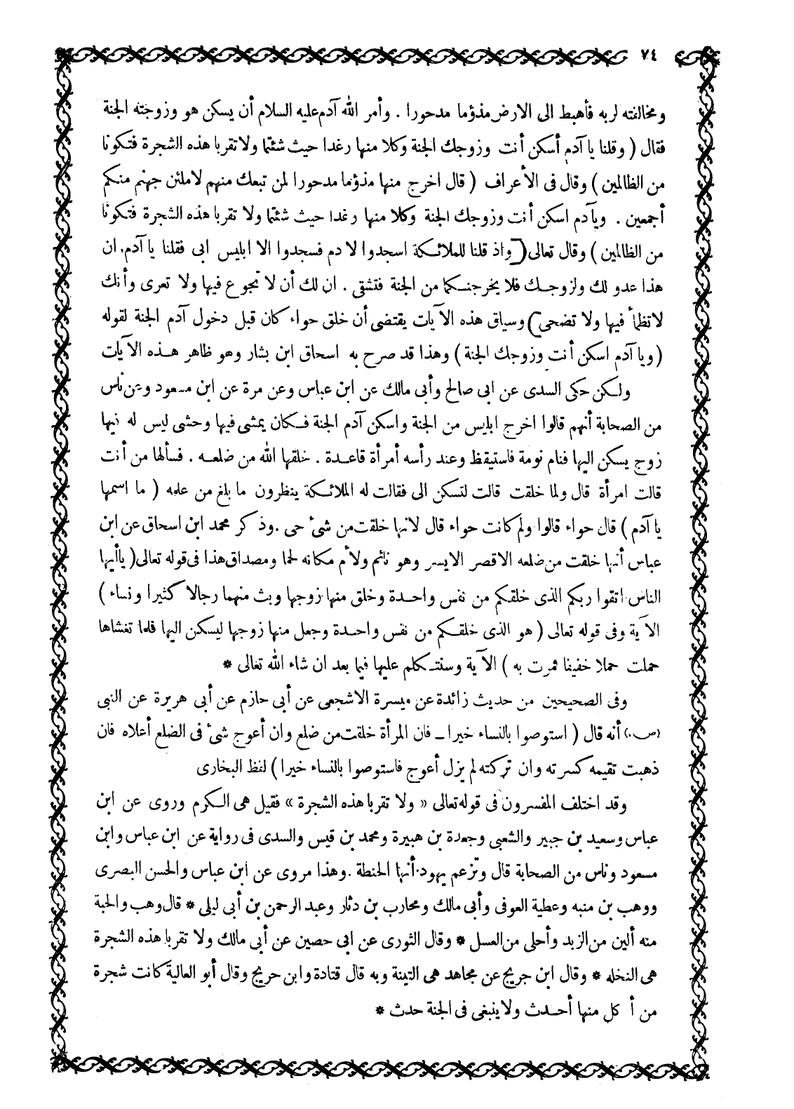 وَمُخَالَفَتِهِ لِرَبِّهِ فَأُهْبِطَ إِلَى الْأَرْضِ مَذْءُومًا مَدْحُورًا. وَأَمَرَ اللَّهُ آدَمَ عَلَيْهِ السَّلَامُ أَنْ يَسْكُنَ هُوَ وَزَوْجَتُهُ الْجَنَّةَ فَقَالَ وَقُلْنا يَا آدَمُ اسْكُنْ أَنْتَ وَزَوْجُكَ الْجَنَّةَ وَكُلا مِنْها رَغَداً حَيْثُ شِئْتُما وَلا تَقْرَبا هذِهِ الشَّجَرَةَ فَتَكُونا من الظَّالِمِينَ 2: 35 وقال في الأعراف قال اخْرُجْ مِنْها مَذْؤُماً مَدْحُوراً لَمَنْ تَبِعَكَ مِنْهُمْ لَأَمْلَأَنَّ جَهَنَّمَ مِنْكُمْ أَجْمَعِينَ. وَيا آدَمُ اسْكُنْ أَنْتَ وَزَوْجُكَ الْجَنَّةَ فَكُلا مِنْ حَيْثُ شِئْتُما وَلا تَقْرَبا هذِهِ الشَّجَرَةَ فَتَكُونا من الظَّالِمِينَ 7: 18- 19 وَقَالَ تَعَالَى وَإِذْ قُلْنا لِلْمَلائِكَةِ اسْجُدُوا لِآدَمَ فَسَجَدُوا إِلَّا إِبْلِيسَ أَبى فَقُلْنا يَا آدَمُ إِنَّ هَذَا عَدُوٌّ لَكَ وَلِزَوْجِكَ فَلا يُخْرِجَنَّكُما مِنَ الْجَنَّةِ فَتَشْقى. إِنَّ لَكَ أَلَّا تَجُوعَ فِيها وَلا تَعْرى وَأَنَّكَ لا تَظْمَؤُا فِيها وَلا تَضْحى 20: 116- 119 وسياق هذه الآيات يقتضي أن خلق حواء كان قبل دخول آدم الجنة لقوله وَيا آدَمُ اسْكُنْ أَنْتَ وَزَوْجُكَ الْجَنَّةَ 7: 19 وهذا قد صرح به إسحاق ابن بشار وَهُوَ ظَاهِرُ هَذِهِ الْآيَاتِ وَلَكِنْ حَكَى السُّدِّيُّ عن أبي صالح وأبي مالك عَنِ ابْنِ عَبَّاسٍ وَعَنْ مُرَّةَ عَنِ ابْنِ مَسْعُودٍ وَعَنْ نَاسٍ مِنَ الصَّحَابَةِ أَنَّهُمْ قَالُوا أُخْرِجَ إِبْلِيسُ مِنَ الْجَنَّةِ وَأُسْكِنَ آدَمُ الْجَنَّةَ فَكَانَ يَمْشِي فيها وحشي لَيْسَ لَهُ فِيهَا زَوْجٌ يَسْكُنُ إِلَيْهَا فَنَامَ نَوْمَةً فَاسْتَيْقَظَ وَعِنْدَ رَأْسِهِ امْرَأَةٌ قَاعِدَةٌ. خَلَقَهَا اللَّهُ مِنْ ضِلْعِهِ. فَسَأَلَهَا مَنْ أَنْتِ قَالَتْ امرأة قال ولما خلقت قالت لستكن إِلَيَّ فَقَالَتْ لَهُ الْمَلَائِكَةُ يَنْظُرُونَ مَا بَلَغَ مِنْ عِلْمِهِ (مَا اسْمُهَا يَا آدَمُ) قَالَ حَوَّاءُ قَالُوا وَلِمَ كَانَتْ حَوَّاءَ قَالَ لِأَنَّهَا خلقت من شيء حي. وذكر محمد ابن إِسْحَاقَ عَنِ ابْنِ عَبَّاسٍ أَنَّهَا خُلِقَتْ مِنْ ضِلْعِهِ الْأَقْصَرِ الْأَيْسَرِ وَهُوَ نَائِمٌ وَلَأَمَ مَكَانَهُ لَحْمًا وَمِصْدَاقُ هَذَا فِي قَوْلِهِ تَعَالَى يَا أَيُّهَا النَّاسُ اتَّقُوا رَبَّكُمُ الَّذِي خَلَقَكُمْ مِنْ نَفْسٍ واحِدَةٍ وَخَلَقَ مِنْها زَوْجَها وَبَثَّ مِنْهُما رِجالًا كَثِيراً وَنِساءً 4: 1 الْآيَةَ وَفِي قَوْلِهِ تَعَالَى هُوَ الَّذِي خَلَقَكُمْ مِنْ نَفْسٍ واحِدَةٍ وَجَعَلَ مِنْها زَوْجَها لِيَسْكُنَ إِلَيْها فَلَمَّا تَغَشَّاها حَمَلَتْ حَمْلًا خَفِيفاً فَمَرَّتْ به 7: 189 الْآيَةَ وَسَنَتَكَلَّمُ عَلَيْهَا فِيمَا بَعْدُ إِنْ شَاءَ اللَّهُ تَعَالَى وَفِي الصَّحِيحَيْنِ مِنْ حَدِيثِ زَائِدَةَ عَنْ مَيْسَرَةَ الْأَشْجَعِيِّ عَنْ أَبِي حَازِمٍ عَنْ أَبِي هُرَيْرَةَ عَنِ النَّبِيِّ صَلَّى اللَّهُ عَلَيْهِ وَسَلَّمَ أَنَّهُ قَالَ (اسْتَوْصُوا بِالنِّسَاءِ خَيْرًا- فَإِنَّ الْمَرْأَةَ خُلِقَتْ مِنْ ضِلْعٍ وَإِنَّ أَعْوَجَ شَيْءٍ فِي الضِّلْعِ أَعْلَاهُ فَإِنْ ذَهَبْتَ تُقِيمُهُ كَسَرْتَهُ وَإِنْ تَرَكْتَهُ لَمْ يَزَلْ أَعْوَجَ فَاسْتَوْصُوا بِالنِّسَاءِ خَيْرًا) لَفْظُ الْبُخَارِيِّ وَقَدِ اخْتَلَفَ الْمُفَسِّرُونَ فِي قوله تعالى وَلا تَقْرَبا هذِهِ الشَّجَرَةَ 2: 35 فَقِيلَ هِيَ الْكَرْمُ وَرَوَى عَنِ ابْنِ عَبَّاسٍ وَسَعِيدِ بْنِ جُبَيْرٍ وَالشَّعْبِيِّ وَجَعْدَةَ بْنِ هُبَيْرَةَ وَمُحَمَّدِ بْنِ قَيْسٍ وَالسُّدِّيِّ فِي رِوَايَةٍ عَنِ ابْنِ عَبَّاسٍ وَابْنِ مَسْعُودٍ وَنَاسٍ مِنَ الصَّحَابَةِ قَالَ وَتَزْعُمُ يَهُودُ أَنَّهَا الْحِنْطَةُ. وَهَذَا مَرْوِيٌّ عَنِ ابْنِ عَبَّاسٍ وَالْحَسَنِ الْبَصْرِيِّ وَوَهْبِ بْنِ مُنَبِّهٍ وَعَطِيَّةَ الْعَوْفِيِّ 