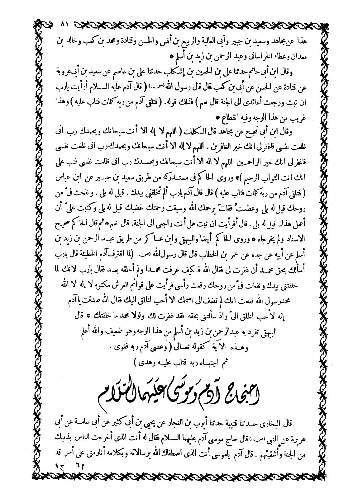 هَذَا عَنْ مُجَاهِدٍ وَسَعِيدِ بْنِ جُبَيْرٍ وَأَبِي الْعَالِيَةِ وَالرَّبِيعِ بْنِ أَنَسٍ وَالْحَسَنِ وَقَتَادَةَ وَمُحَمَّدِ بْنِ كَعْبٍ وَخَالِدِ بْنِ مَعْدَانَ وَعَطَاءٍ الْخُرَاسَانِيِّ وَعَبْدِ الرَّحْمَنِ بْنِ زَيْدِ بْنِ أَسْلَمَ وَقَالَ ابْنُ أَبِي حَاتِمٍ حَدَّثَنَا عَلِيُّ بْنُ الْحُسَيْنِ بْنُ إِشْكَابٍ حَدَّثَنَا عَلِيُّ بْنُ عَاصِمٍ عَنْ سَعِيدِ بْنِ أَبِي عَرُوبَةَ عَنْ قَتَادَةَ عَنِ الْحَسَنِ عَنْ أُبَيِّ بْنِ كَعْبٍ قَالَ قَالَ رَسُولُ اللَّهِ صَلَّى اللَّهُ عَلَيْهِ وَسَلَّمَ (قال آدَمُ عَلَيْهِ السَّلَامُ أَرَأَيْتَ يَا رَبِّ إِنْ تُبْتُ وَرَجَعْتُ أَعَائِدِي إِلَى الْجَنَّةِ قَالَ نَعَمْ) فَذَلِكَ قَوْلُهُ. (فَتَلَقَّى آدَمُ مِنْ رَبِّهِ كَلِماتٍ فَتابَ عَلَيْهِ) 2: 37 وَهَذَا غَرِيبٌ مِنْ هَذَا الْوَجْهِ وَفِيهِ انْقِطَاعٌ وَقَالَ ابْنُ أَبِي نَجِيحٍ عَنْ مُجَاهِدٍ قَالَ الْكَلِمَاتُ (اللَّهمّ لَا إِلَهَ إِلَّا أَنْتَ سُبْحَانَكَ وَبِحَمْدِكَ رَبِّ إِنِّي ظَلَمْتُ نَفْسِي فَاغْفِرْ لِي إِنَّكَ خَيْرُ الْغَافِرِينَ. اللَّهمّ لَا إِلَهَ إِلَّا أَنْتَ سُبْحَانَكَ وَبِحَمْدِكَ رَبِّ إِنِّي ظَلَمْتُ نَفْسِي فَاغْفِرْ لِي إِنَّكَ خَيْرُ الرَّاحِمِينَ اللَّهمّ لَا إِلَهَ إِلَّا أَنْتَ سُبْحَانَكَ وَبِحَمْدِكَ رَبِّ إِنِّي ظَلَمْتُ نَفْسِي فَتُبْ عَلَيَّ إِنَّكَ أَنْتَ التَّوَّابُ الرَّحِيمُ) وَرَوَى الْحَاكِمُ فِي مُسْتَدْرَكِهِ مِنْ طَرِيقِ سعيد بن جبير عن ابن عباس (فَتَلَقَّى آدَمُ مِنْ رَبِّهِ كَلِماتٍ فَتابَ عَلَيْهِ) 2: 37 قَالَ قَالَ آدَمُ يَا رَبِّ أَلَمْ تَخْلُقْنِي بِيَدِكَ. قِيلَ لَهُ بَلَى. وَنَفَخْتَ فِيَّ مَنْ رُوحِكَ قِيلَ لَهُ بَلَى وَعَطَسْتُ فَقُلْتَ يَرْحَمُكَ اللَّهُ وَسَبَقَتْ رَحْمَتُكَ غَضَبَكَ قِيلَ لَهُ بَلَى وَكَتَبْتَ عَلَيَّ أَنْ أَعْمَلَ هَذَا- قِيلَ لَهُ بَلَى. قَالَ أَفَرَأَيْتَ إِنْ تُبْتُ هَلْ أَنْتَ رَاجِعِي إِلَى الْجَنَّةِ. قَالَ نَعَمْ ثُمَّ قَالَ الْحَاكِمُ صَحِيحُ الْإِسْنَادِ وَلَمْ يُخَرِّجَاهُ وَرَوَى الْحَاكِمُ أَيْضًا والْبَيْهَقِيُّ وَابْنُ عَسَاكِرَ مِنْ طَرِيقِ عَبْدِ الرَّحْمَنِ بْنِ زَيْدِ بْنِ أَسْلَمَ عَنْ أَبِيهِ عَنْ جَدِّهِ عَنْ عُمَرَ بْنِ الْخَطَّابِ قَالَ قَالَ رَسُولُ اللَّهِ صَلَّى اللَّهُ عَلَيْهِ وَسَلَّمَ (لَمَّا اقْتَرَفَ آدَمُ الْخَطِيئَةَ قَالَ يَا رَبِّ أسألك بحق محمد أن غَفَرْتَ لِي فَقَالَ اللَّهُ فَكَيْفَ عَرَفْتَ مُحَمَّدًا وَلَمْ أَخْلُقْهُ بَعْدُ فَقَالَ يَا رَبِّ لِأَنَّكَ لَمَّا خَلَقْتَنِي بِيَدِكَ وَنَفَخْتَ فِيَّ مَنْ رُوحِكَ رَفَعْتُ رَأْسِي فَرَأَيْتُ عَلَى قَوَائِمِ الْعَرْشِ مَكْتُوبًا لَا إِلَهَ إِلَّا اللَّهُ مُحَمَّدٌ رَسُولُ اللَّهِ فَعَلِمْتُ أَنَّكَ لَمْ تُضِفْ إِلَى اسْمِكَ إِلَّا أَحَبَّ الْخَلْقِ إِلَيْكَ فَقَالَ اللَّهُ صَدَقْتَ يَا آدَمُ إِنَّهُ لَأَحَبُّ الْخَلْقِ إِلَيَّ وَإِذْ سَأَلْتَنِي بِحَقِّهِ فَقَدْ غَفَرْتُ لَكَ وَلَوْلَا مُحَمَّدٌ مَا خَلَقْتُكَ قَالَ الْبَيْهَقِيُّ تَفَرَّدَ بِهِ عَبْدُ الرَّحْمَنِ بْنُ زَيْدِ بْنِ أَسْلَمَ مِنْ هَذَا الْوَجْهِ وَهُوَ ضَعِيفٌ وَاللَّهُ أَعْلَمُ وَهَذِهِ الْآيَةُ كَقَوْلِهِ تَعَالَى وَعَصى آدَمُ رَبَّهُ فَغَوى.