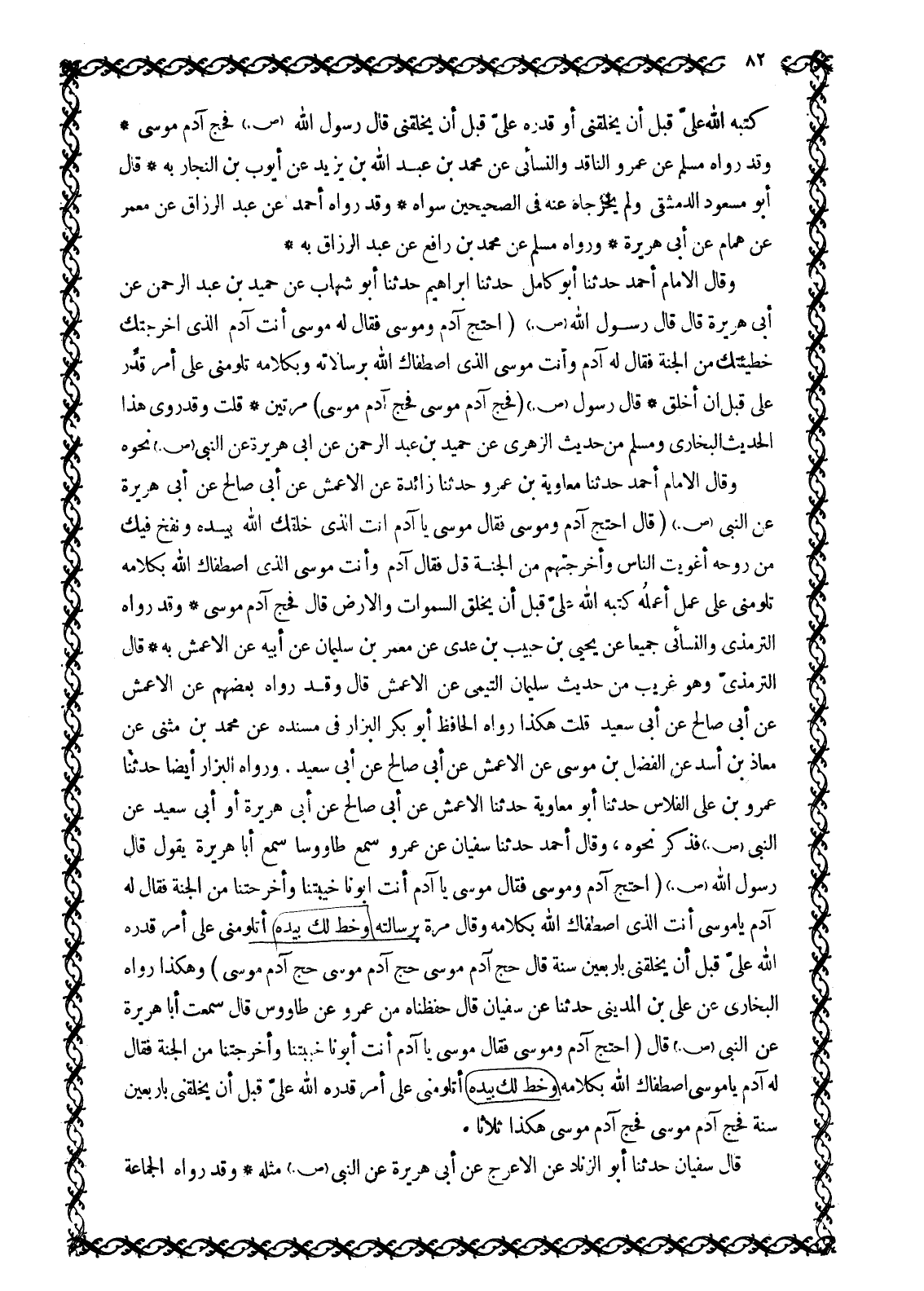 كَتَبَهُ اللَّهُ عَلَيَّ قَبْلَ أَنْ يَخْلُقَنِي أَوْ قَدَّرَهُ عَلَيَّ قَبْلَ أَنْ يَخْلُقَنِي قَالَ رَسُولُ اللَّهِ صَلَّى اللَّهُ عَلَيْهِ وَسَلَّمَ فَحَجَّ آدَمُ مُوسَى وَقَدْ رَوَاهُ مُسْلِمٌ عَنْ عَمْرٍو النَّاقِدِ وَالنَّسَائِيُّ عَنْ مُحَمَّدِ بْنِ عَبْدِ اللَّهِ بْنِ يَزِيدَ عَنْ أَيُّوبَ بْنِ النَّجَّارِ بِهِ قَالَ أبو مسعود الدمشقيّ ولم يخرجاه عَنْهُ فِي الصَّحِيحَيْنِ سِوَاهُ وَقَدْ رَوَاهُ أَحْمَدُ عَنْ عَبْدِ الرَّزَّاقِ عَنْ مَعْمَرٍ عَنْ هَمَّامٍ عَنْ أَبِي هُرَيْرَةَ وَرَوَاهُ مُسْلِمٌ عَنْ مُحَمَّدِ بْنِ رَافِعٍ عَنْ عَبْدِ الرَّزَّاقِ بِهِ وَقَالَ الْإِمَامُ أَحْمَدُ حَدَّثَنَا أَبُو كَامِلٍ حَدَّثَنَا إِبْرَاهِيمُ حدثنا أبو شِهَابٍ عَنْ حُمَيْدِ بْنِ عَبْدِ الرَّحْمَنِ عَنْ أَبِي هُرَيْرَةَ قَالَ قَالَ رَسُولُ اللَّهِ صَلَّى اللَّهُ عَلَيْهِ وَسَلَّمَ (احْتَجَّ آدَمُ وَمُوسَى فَقَالَ لَهُ مُوسَى أَنْتَ آدَمُ الَّذِي أَخْرَجَتْكَ خَطِيئَتُكَ مِنَ الْجَنَّةِ فَقَالَ لَهُ آدَمُ وَأَنْتَ مُوسَى الَّذِي اصْطَفَاكَ اللَّهُ بِرِسَالَاتِهِ وَبِكَلَامِهِ تَلُومُنِي عَلَى أَمْرٍ قُدِّرَ عَلَيَّ قَبْلَ أَنْ أُخْلَقَ قَالَ رَسُولُ اللَّهِ صَلَّى اللَّهُ عَلَيْهِ وَسَلَّمَ (فَحَجَّ آدَمُ مُوسَى فَحَجَّ آدَمُ مُوسَى) مَرَّتَيْنِ قُلْتُ وَقَدْ رَوَى هَذَا الْحَدِيثَ الْبُخَارِيُّ وَمُسْلِمٌ مِنْ حَدِيثِ الزُّهْرِيِّ عَنْ حُمَيْدِ بْنِ عَبْدِ الرَّحْمَنِ عَنْ أَبِي هُرَيْرَةَ عَنِ النَّبِيِّ صَلَّى اللَّهُ عَلَيْهِ وَسَلَّمَ نَحْوَهُ وَقَالَ الْإِمَامُ أَحْمَدُ حَدَّثَنَا مُعَاوِيَةُ بْنُ عَمْرٍو حَدَّثَنَا زَائِدَةُ عَنِ الْأَعْمَشِ عَنْ أَبِي صَالِحٍ عَنْ أَبِي هُرَيْرَةَ عَنِ النَّبِيِّ صَلَّى اللَّهُ عَلَيْهِ وَسَلَّمَ (قَالَ احْتَجَّ آدَمُ وَمُوسَى فَقَالَ مُوسَى يَا آدَمُ أَنْتَ الَّذِي خَلَقَكَ اللَّهُ بِيَدِهِ وَنَفَخَ فِيكَ مِنْ رُوحِهِ أَغْوَيْتَ النَّاسَ وَأَخْرَجْتَهُمْ مِنَ الْجَنَّةِ قَالَ فَقَالَ آدَمُ وَأَنْتَ مُوسَى الَّذِي اصْطَفَاكَ اللَّهُ بِكَلَامِهِ تَلُومُنِي عَلَى عَمَلٍ أَعْمَلُهُ كَتَبَهُ اللَّهُ عليّ قبل أن يخلق السموات وَالْأَرْضَ قَالَ فَحَجَّ آدَمُ مُوسَى وَقَدْ رَوَاهُ التِّرْمِذِيُّ وَالنَّسَائِيُّ جَمِيعًا عَنْ يَحْيَى بْنِ حَبِيبِ بن عدي عن معمر بْنِ سُلَيْمَانَ عَنْ أَبِيهِ عَنِ الْأَعْمَشِ بِهِ قَالَ التِّرْمِذِيُّ وَهُوَ غَرِيبٌ مِنْ حَدِيثِ سُلَيْمَانَ التَّيْمِيِّ عَنِ الْأَعْمَشِ قَالَ وَقَدْ رَوَاهُ بَعْضُهُمْ عَنِ الْأَعْمَشِ عَنْ أَبِي صَالِحٍ عَنْ أَبِي سَعِيدٍ قُلْتُ هَكَذَا رَوَاهُ الْحَافِظُ أَبُو بَكْرٍ الْبَزَّارُ فِي مُسْنَدِهِ عَنْ مُحَمَّدِ بْنِ مُثَنَّى عَنْ مُعَاذِ بْنِ أَسَدٍ عَنِ الْفَضْلِ بْنِ مُوسَى عَنِ الْأَعْمَشِ عَنْ أَبِي صَالِحٍ عَنْ أَبِي سَعِيدٍ. وَرَوَاهُ الْبَزَّارُ أَيْضًا حَدَّثَنَا عَمْرُو بْنُ عَلِيٍّ الْفَلَّاسُ حَدَّثَنَا أَبُو مُعَاوِيَةَ حَدَّثَنَا الْأَعْمَشِ عَنْ أَبِي صَالِحٍ عَنْ أَبِي هُرَيْرَةَ أَوْ أَبِي سَعِيدٍ عَنِ النَّبِيِّ صَلَّى اللَّهُ عَلَيْهِ وَسَلَّمَ فَذَكَرَ نَحْوَهُ، وَقَالَ أَحْمَدُ حَدَّثَنَا سفيان عن عمرو سمع طاووسا سَمِعَ أَبَا هُرَيْرَةَ يَقُولُ قَالَ رَسُولُ اللَّهِ صَلَّى اللَّهُ عَلَيْهِ وَسَلَّمَ (احْتَجَّ آدَمُ وَمُوسَى فَقَالَ مُوسَى يَا آدَمُ أَنْتَ أَبُونَا خَيَّبْتَنَا وَأَخْرَجْتَنَا مِنَ الْجَنَّةِ فَقَالَ لَهُ آدَمُ يَا مُوسَى أَنْتَ الَّذِي اصْطَفَاكَ اللَّهُ بِكَلَامِهِ وَقَالَ مَرَّةً بِرِسَالَتِهِ وَخَطَّ لَكَ بِيَدِهِ أَتَلُومُنِي عَلَى أَمْرٍ قَدَّرَهُ اللَّهُ عَلَيَّ قَبْلَ أَنْ يَخْلُقَنِي بِأَرْبَعِينَ سَنَةً قَالَ حَجَّ آ