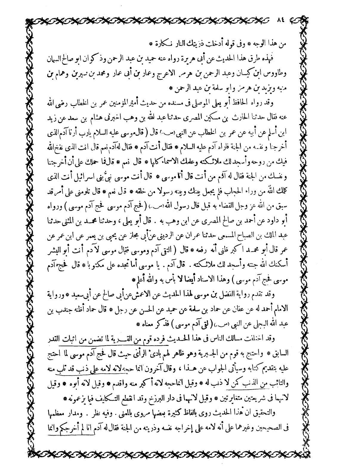 مِنْ هَذَا الْوَجْهِ وَفِي قَوْلِهِ أَدْخَلْتَ ذُرِّيَّتَكَ النَّارَ نَكَارَةٌ فَهَذِهِ طُرُقُ هَذَا الْحَدِيثِ عَنْ أَبِي هُرَيْرَةَ رَوَاهُ عَنْهُ حُمَيْدُ بْنُ عَبْدِ الرحمن وذكوان ابو صالح السمان وطاووس ابن كَيْسَانَ وَعَبْدُ الرَّحْمَنِ بْنُ هُرْمُزَ الْأَعْرَجُ وَعَمَّارُ بْنُ أَبِي عَمَّارٍ وَمُحَمَّدُ بْنُ سِيرِينَ وَهَمَّامُ بْنُ مُنَبِّهٍ وَيَزِيدُ بْنُ هُرْمُزَ وَأَبُو سَلَمَةَ بْنُ عَبْدِ الرَّحْمَنِ وَقَدْ رَوَاهُ الْحَافِظُ أَبُو يَعْلَى الْمَوْصِلِيُّ فِي مُسْنَدِهِ مِنْ حَدِيثِ أَمِيرِ الْمُؤْمِنِينَ عُمَرَ بْنِ الْخَطَّابِ رَضِيَ اللَّهُ عنه فَقَالَ حَدَّثَنَا الْحَارِثُ بْنُ مِسْكِينٍ الْمِصْرِيُّ حَدَّثَنَا عَبْدُ اللَّهِ بْنُ وَهْبٍ أَخْبَرَنِي هِشَامُ بْنُ سعد عن زيد ابن أَسْلَمَ عَنْ أَبِيهِ عَنْ عُمَرَ بْنِ الْخَطَّابِ عَنِ النَّبِيِّ صَلَّى اللَّهُ عَلَيْهِ وَسَلَّمَ قَالَ (قَالَ مُوسَى عَلَيْهِ السَّلَامُ يَا رَبِّ أَرِنَا آدَمَ الَّذِي أَخْرَجَنَا وَنَفْسَهُ مِنَ الْجَنَّةِ فَأَرَاهُ آدَمَ عَلَيْهِ السَّلَامُ فَقَالَ أَنْتَ آدَمُ فَقَالَ لَهُ آدَمُ نَعَمْ قَالَ أَنْتَ الَّذِي نَفَخَ اللَّهُ فِيكَ مِنْ رُوحِهِ وَأَسْجَدَ لَكَ مَلَائِكَتَهُ وَعَلَّمَكَ الْأَسْمَاءَ كُلَّهَا قَالَ نَعَمْ قَالَ فَمَا حَمَلَكَ عَلَى أَنْ أَخْرَجْتَنَا وَنَفْسَكَ مِنَ الْجَنَّةِ فَقَالَ لَهُ آدَمُ مَنْ أَنْتَ قَالَ أَنَا مُوسَى قَالَ أَنْتَ مُوسَى نَبِيُّ بَنِي إِسْرَائِيلَ أَنْتَ الَّذِي كَلَّمَكَ اللَّهُ مِنْ وَرَاءِ الْحِجَابِ فَلَمْ يَجْعَلْ بَيْنَكَ وَبَيْنَهُ رَسُولًا مِنْ خَلْقِهِ قَالَ نَعَمْ قَالَ تَلُومُنِي عَلَى أَمْرٍ قَدْ سَبَقَ مِنَ اللَّهِ عَزَّ وَجَلَّ الْقَضَاءُ بِهِ قَبْلُ قَالَ رَسُولُ اللَّهِ صَلَّى اللَّهُ عَلَيْهِ وَسَلَّمَ (فَحَجَّ آدَمُ مُوسَى فَحَجَّ آدَمُ مُوسَى) وَرَوَاهُ أَبُو دَاوُدَ عَنْ أَحْمَدَ بْنِ صَالِحٍ الْمِصْرِيِّ عَنِ ابْنِ وَهْبٍ بِهِ. قَالَ أَبُو يَعْلَى، وَحَدَّثَنَا مُحَمَّدُ بْنُ الْمُثَنَّى حَدَّثَنَا عَبْدُ الْمَلِكِ بْنُ الصَّبَّاحِ الْمِسْمَعِيُّ حَدَّثَنَا عِمْرَانُ عَنِ الرديني عن أَبِي مِجْلَزٍ عَنْ يَحْيَى بْنِ يَعْمُرَ عَنِ ابْنِ عُمَرَ عَنْ عُمَرَ قَالَ أَبُو مُحَمَّدٍ أكبر ظَنِّي أَنَّهُ رَفَعَهُ قَالَ (الْتَقَى آدَمُ وَمُوسَى فقال موسى لآدم أنت أبو البشر أَسْكَنَكَ اللَّهُ جَنَّتَهُ وَأَسْجَدَ لَكَ مَلَائِكَتَهُ. قَالَ آدَمُ. يَا مُوسَى أَمَا تَجِدُهُ عَلَيَّ مَكْتُوبًا قَالَ فَحَجَّ آدَمُ مُوسَى فَحَجَّ آدَمُ مُوسَى) وَهَذَا الْإِسْنَادُ أَيْضًا لَا بَأْسَ بِهِ وَاللَّهُ أَعْلَمُ وَقَدْ تَقَدَّمَ رِوَايَةُ الْفَضْلِ بْنِ مُوسَى لِهَذَا الْحَدِيثِ عَنِ الْأَعْمَشِ عَنْ أَبِي صَالِحٍ عَنْ أَبِي سَعِيدٍ وَرِوَايَةُ الْإِمَامِ أَحْمَدَ لَهُ عَنْ عَفَّانَ عَنْ حَمَّادِ بْنِ سَلَمَةَ عَنْ حُمَيْدٍ عَنِ الْحَسَنِ عَنْ رَجُلٍ قَالَ حَمَّادٌ أظنه جندب بن عبد الله البجلي عن النَّبِيِّ صَلَّى اللَّهُ عَلَيْهِ وَسَلَّمَ (لَقِيَ آدَمُ مُوسَى) فَذَكَرَ مَعْنَاهُ وَقَدِ اخْتَلَفَتْ مَسَالِكُ النَّاسِ فِي هَذَا الْحَدِيثِ فَرَدَّهُ قَوْمٌ مِنَ الْقَدَرِيَّةِ لِمَا تَضَمَّنَ مِنْ إِثْبَاتِ الْقَدَرِ السَّابِقِ وَاحْتَجَّ بِهِ قَوْمٌ مِنَ الْجَبْرِيَّةِ وَهُوَ ظَاهِرٌ لَهُمْ بادئ الرَّأْيِ حَيْثُ قَالَ فَحَجَّ آدَمُ مُوسَى لَمَّا احْتَجَّ عَلَيْهِ بِتَقْدِيمِ كِتَابِهِ وَسَيَأْتِي الْجَوَابُ عَنْ هَذَا، وَقَالَ آخَرُونَ إِنَّمَا حَجَّهُ لِأَنَّهُ لَامَهُ عَلَى ذَنْبٍ قَدْ تَابَ مِنْهُ وَالتَّائِبُ مِنَ الذَّنْبِ كَمَنْ لَا ذَنْبَ لَهُ وَقِيلَ إِنَّمَا حَجَّهُ لِأَنَّهُ أَكْبَرُ مِنْهُ وَأَقْدَمُ وَقِيلَ لِأَنَّه