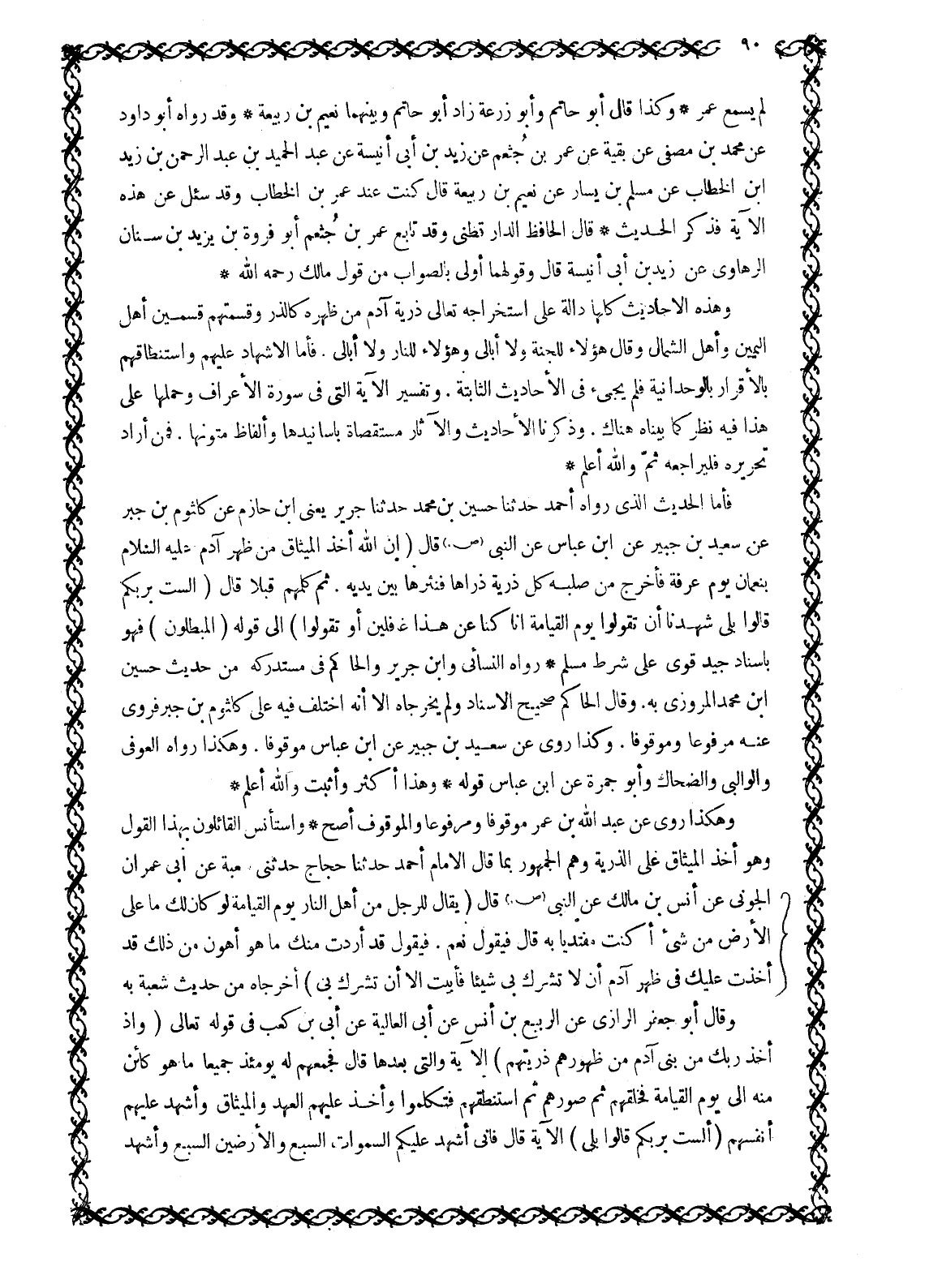 لَمْ يَسْمَعْ عُمَرَ وَكَذَا قَالَ أَبُو حَاتِمٍ وَأَبُو زُرْعَةَ زَادَ أَبُو حَاتِمٍ وَبَيْنَهُمَا نُعَيْمُ بْنُ رَبِيعَةَ وَقَدْ رَوَاهُ أَبُو دَاوُدَ عَنْ مُحَمَّدِ بْنِ مُصَفَّى عَنْ بَقِيَّةَ عَنْ عُمَرَ بن جثعم عَنْ زَيْدِ بْنِ أَبِي أُنَيْسَةَ عَنْ عَبْدِ الحميد بن عبد الرحمن بن زيد ابن الْخَطَّابِ عَنْ مُسْلِمِ بْنِ يَسَارٍ عَنْ نُعَيْمِ بْنِ رَبِيعَةَ قَالَ كُنْتُ عِنْدَ عُمَرَ بْنِ الْخَطَّابِ وَقَدْ سُئِلَ عَنْ هَذِهِ الْآيَةِ فَذَكَرَ الْحَدِيثَ قَالَ الْحَافِظُ الدَّارَقُطْنِيُّ وَقَدْ تَابَعَ عُمَرَ بن جثعم أبو فروة بن يَزِيدُ بْنُ سِنَانٍ الرَّهَاوِيُّ عَنْ زَيْدِ بْنِ أَبِي أُنَيْسَةَ قَالَ وَقَوْلُهُمَا أَوْلَى بِالصَّوَابِ مِنْ قَوْلِ مَالِكٍ رَحِمَهُ اللَّهُ وَهَذِهِ الْأَحَادِيثُ كُلُّهَا دَالَّةٌ عَلَى اسْتِخْرَاجِهِ تَعَالَى ذُرِّيَّةَ آدَمَ مِنْ ظَهْرِهِ كَالذَّرِّ وَقِسْمَتِهِمْ قِسْمَيْنِ أَهْلِ الْيَمِينِ وَأَهْلِ الشَّمَالِ وَقَالَ هَؤُلَاءِ لِلْجَنَّةِ وَلَا أُبَالِي وَهَؤُلَاءِ لِلنَّارِ وَلَا أُبَالِي. فَأَمَّا الْإِشْهَادُ عَلَيْهِمْ وَاسْتِنْطَاقُهُمْ بِالْإِقْرَارِ بِالْوَحْدَانِيَّةِ فَلَمْ يَجِئْ فِي الْأَحَادِيثِ الثَّابِتَةِ. وَتَفْسِيرُ الْآيَةِ الَّتِي فِي سُورَةِ الْأَعْرَافِ وَحَمْلُهَا عَلَى هَذَا فِيهِ نَظَرٌ كَمَا بَيَّنَّاهُ هُنَاكَ. وَذَكَرْنَا الْأَحَادِيثَ وَالْآثَارَ مُسْتَقْصَاةً بِأَسَانِيدِهَا وَأَلْفَاظِ مُتُونِهَا. فَمَنْ أَرَادَ تَحْرِيرَهُ فَلْيُرَاجِعْهُ ثَمَّ وَاللَّهُ أَعْلَمُ فَأَمَّا الْحَدِيثُ الَّذِي رَوَاهُ أَحْمَدُ حَدَّثَنَا حُسَيْنُ بْنُ مُحَمَّدٍ حَدَّثَنَا جَرِيرٌ يَعْنِي ابْنَ حَازِمٍ عن كلثوم بْنِ جُبَيْرٍ عَنْ سَعِيدِ بْنِ جُبَيْرٍ عَنِ ابْنِ عَبَّاسٍ عَنِ النَّبِيِّ صَلَّى اللَّهُ عَلَيْهِ وَسَلَّمَ قَالَ (إِنَّ اللَّهَ أَخَذَ الْمِيثَاقَ مِنْ ظَهْرِ آدَمَ عَلَيْهِ السَّلَامُ بِنُعْمَانَ يَوْمَ عَرَفَةَ فَأَخْرَجَ مِنْ صُلْبِهِ كُلَّ ذُرِّيَّةٍ ذَرَأَهَا فَنَثَرَهَا بَيْنَ يَدَيْهِ. ثُمَّ كَلَّمَهُمْ قُبُلًا قَالَ (أَلَسْتُ بِرَبِّكُمْ قالُوا بَلى شَهِدْنا أَنْ تَقُولُوا يَوْمَ الْقِيامَةِ إِنَّا كُنَّا عَنْ هَذَا غافِلِينَ أَوْ تَقُولُوا) 7: 172- 173 إِلَى قوله (الْمُبْطِلُونَ) 7: 173 فَهُوَ بِإِسْنَادٍ جَيِّدٍ قَوِيٍّ عَلَى شَرْطِ مُسْلِمٍ رَوَاهُ النَّسَائِيُّ وابْنُ جَرِيرٍ وَالْحَاكِمُ فِي مُسْتَدْرَكِهِ من حديث حسين ابن مُحَمَّدٍ الْمَرْوَزِيِّ بِهِ. وَقَالَ الْحَاكِمُ صَحِيحُ الْإِسْنَادِ وَلَمْ يُخَرِّجَاهُ إِلَّا أَنَّهُ اخْتَلَفَ فِيهِ عَلَى كُلْثُومِ بْنِ جَبْرٍ فَرَوَى عَنْهُ مَرْفُوعًا وَمَوْقُوفًا. وَكَذَا رَوَى عَنْ سَعِيدِ بْنِ جُبَيْرٍ عَنِ ابْنِ عَبَّاسٍ موقوفا. وَهَكَذَا رَوَاهُ الْعَوْفِيُّ وَالْوَالِبِيُّ وَالضَّحَّاكُ وَأَبُو جَمْرَةَ عَنِ ابْنِ عَبَّاسٍ قَوْلَهُ وَهَذَا أَكْثَرُ وَأَثْبَتُ وَاللَّهُ أَعْلَمُ وَهَكَذَا رَوَى عَنْ عَبْدِ اللَّهِ بن عمر مَوْقُوفًا وَمَرْفُوعًا وَالْمَوْقُوفُ أَصَحُّ وَاسْتَأْنَسَ الْقَائِلُونَ بِهَذَا الْقَوْلِ وَهُوَ أَخْذُ الْمِيثَاقِ عَلَى الذُّرِّيَّةِ وَهُمُ الْجُمْهُورُ بِمَا قَالَ الْإِمَامُ أَحْمَدُ حَدَّثَنَا حَجَّاجٌ حَدَّثَنِي شُعْبَةُ عَنْ أَبِي عِمْرَانَ الْجَوْنِيِّ عَنْ أَنَسِ بْنِ مَالِكٍ عَنِ النَّبِيِّ صَلَّى اللَّهُ عَلَيْهِ وَسَلَّمَ قَالَ (يُقَالُ لِلرَّجُلِ مِنْ أَهْلِ النَّارِ يَوْمَ الْقِيَامَةِ لَوْ كَانَ لَكَ مَا عَلَى الْأَرْضِ مِنْ شَيْءٍ أَكُنْتَ مُفْتَدِيًا بِهِ قَالَ فَيَقُولُ نَعَمْ. فَيَقُولُ قَدْ أَرَدْتُ مِنْكَ مَا هُوَ أَهْوَنُ مِنْ ذَلِكَ قَدْ أَخَذْتُ عَلَيْكَ فِي ظَهْرِ آدَمَ أَنْ لَا تُش