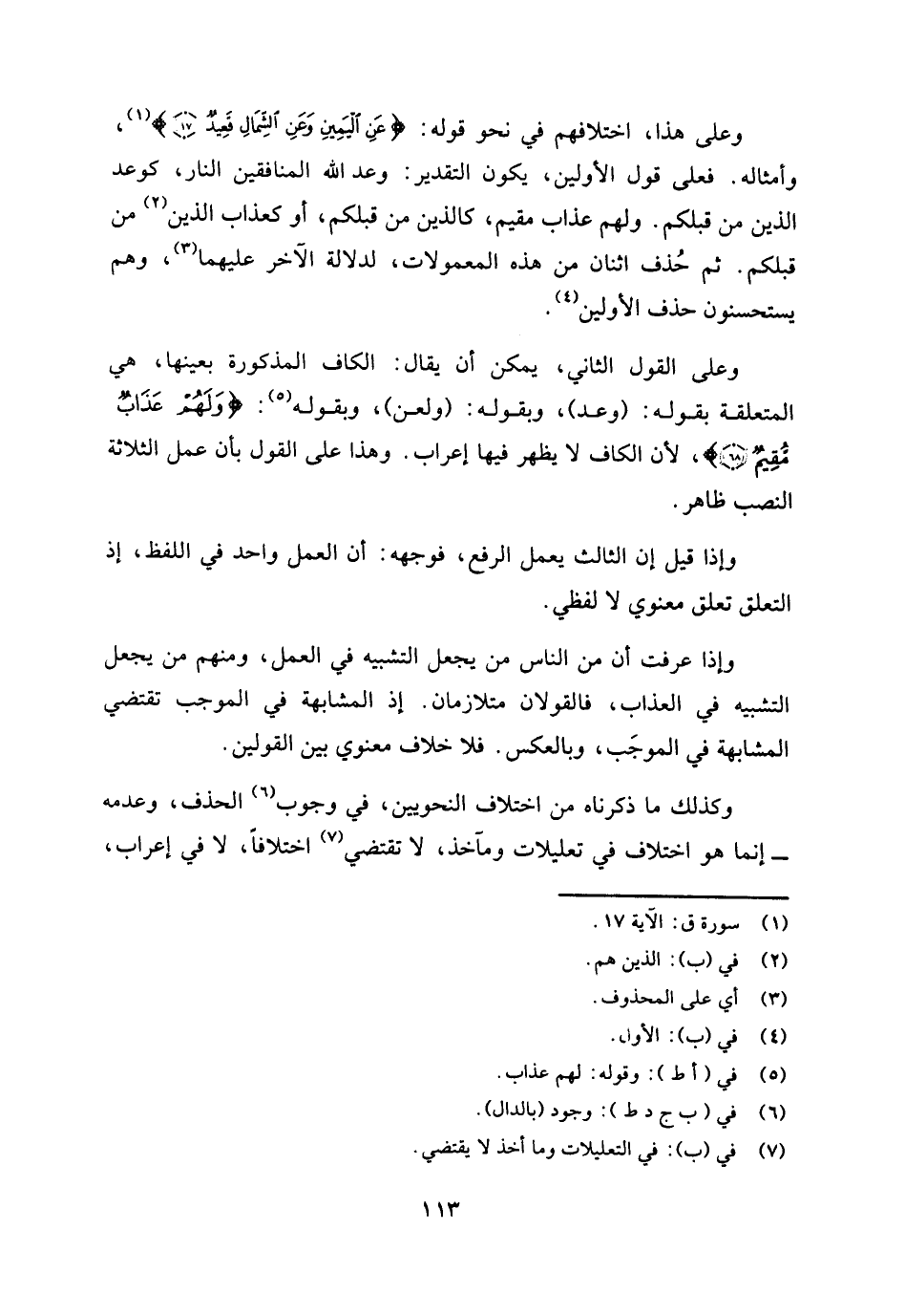 وكذلك ما ذكرناه من اختلاف النحويين في وجوب في (¬6) الحذف وعدمه - إنما هو اختلاف في تعليلات ومآخذ، لا تقتضي (¬7) اختلافا لا في إعراب،