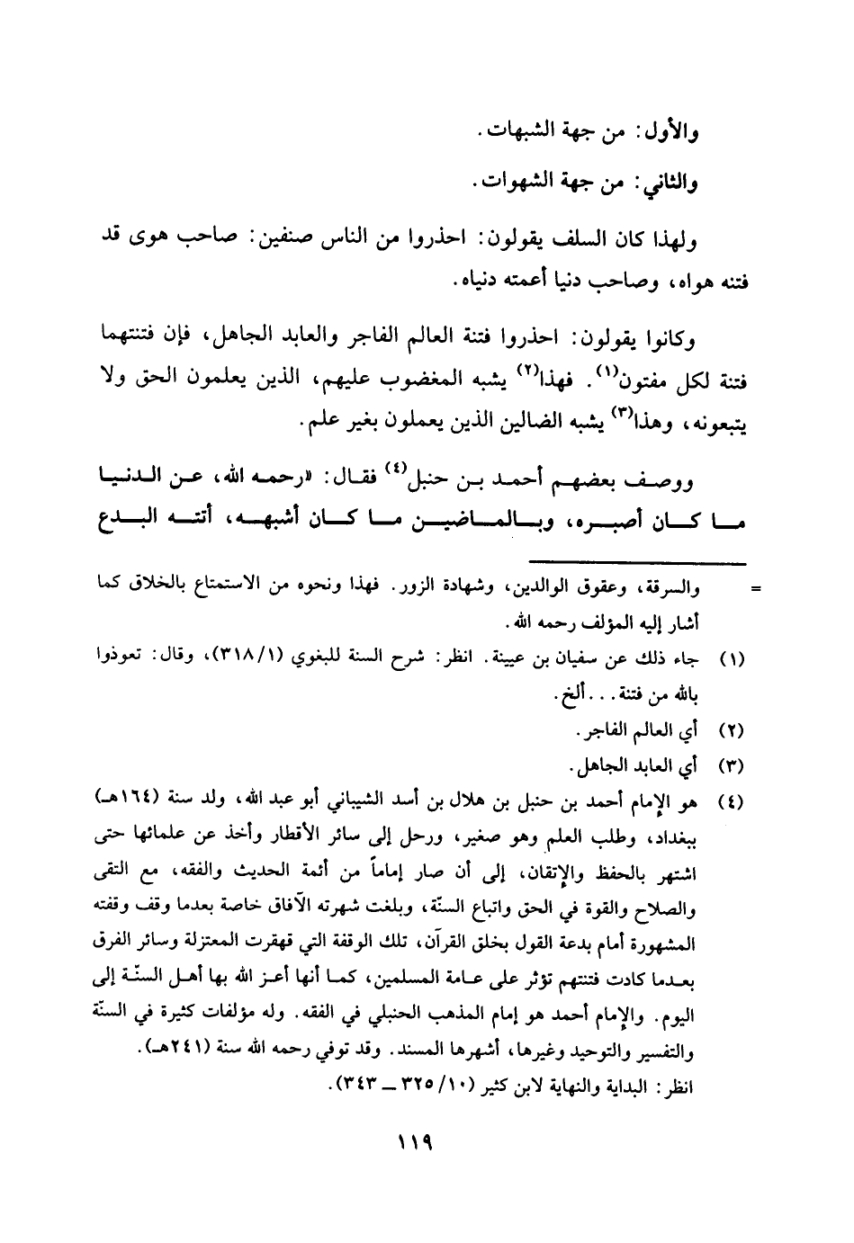 (¬4) هو: الإمام أحمد بن حنبل بن هلال بن أسد الشيباني، أبو عبد الله، ولد سنة (164 هـ) ببغداد، وطلب العلم وهو صغير، ورحل إلى سائر الأقطار وأخذ عن علمائها حتى اشتهر بالحفظ والإتقان، إلى أن صار إماما من أئمة الحديث والفقه، مع التقى والصلاح والقوة في الحق واتباع السنة، وبلغت شهرته الآفاق خاصة بعدما وقف وقفته المشهورة أمام بدعة القول بخلق القرآن، تلك الوقفة التي قهقرت المعتزلة وسائر الفرق اليوم، والإمام أحمد هو إمام المذهب الحنبلي في الفقه، وله مؤلفات كثيرة في السنة، والتفسير، والتوحيد، وغيرها، أشهرها المسند، وقد توفي رحمه الله سنة (241 هـ) .