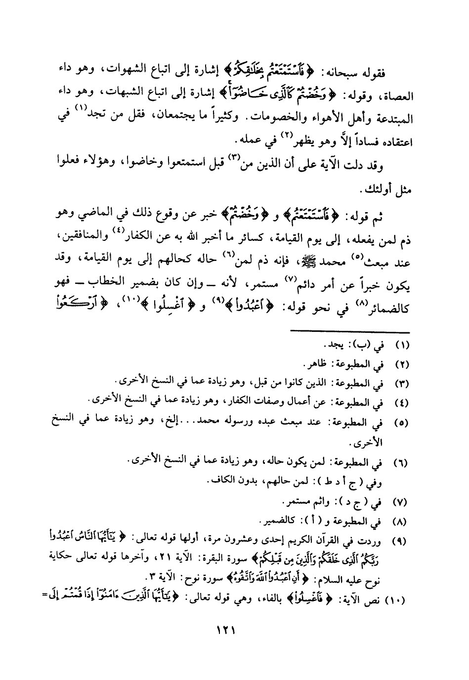 ثم قوله: {فَاسْتَمْتَعْتُمْ} [التوبة: 69] و {وَخُضْتُمْ} [التوبة: 69] خبر عن وقوع ذلك في الماضي وهو ذم لمن يفعله، إلى يوم القيامة، كسائر ما أخبر الله به عن الكفار (¬4) والمنافقين، عند مبعث (¬5) محمد صلى الله عليه وسلم، فإنه ذم لمن (¬6) حاله كحالهم إلى يوم القيامة، وقد يكون خبرا عن أمر دائم (¬7) مستمر؛ لأنه - وإن كان بضمير الخطاب - فهو كالضمائر (¬8) في نحو قوله: (اعْبُدُوا) (¬9) و (اغْسِلُوا) (¬10)