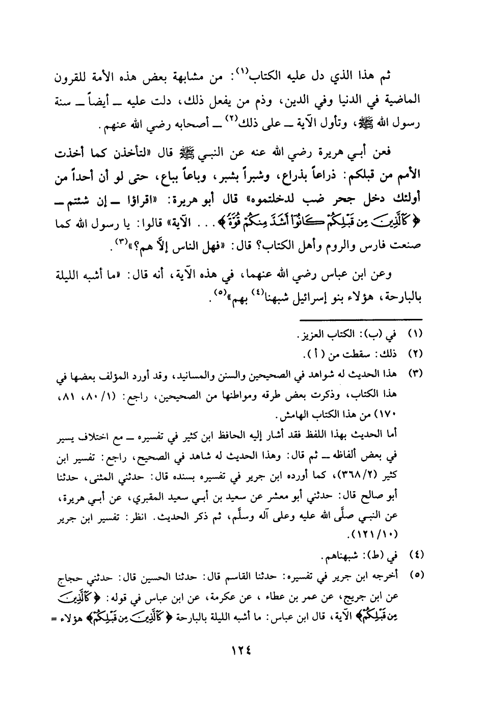 (¬5) أخرجه ابن جرير في تفسيره: حدثتنا القاسم قال: حدثنا الحسين قال: حدثني حجاج، عن ابن جريج، عن عمر بن عطاء، عن عكرمة، عن ابن عباس في قوله: (كَالَّذِينَ مِنْ قَبْلِكُمْ) الآية، قال ابن عباس: " ما أشبه الليلة بالبارحة (كَالَّذِينَ مِنْ قَبْلِكُمْ) هؤلاء بنو إسرائيل شبهنا بهم، لا أعلم إلا أنه قال: والذي نفسي بيده لتتبعنهم حتى لو دخل الرجل جحر ضب لدخلتموه ". اهـ. عن تفسير ابن جرير (10 / 121- 122) .