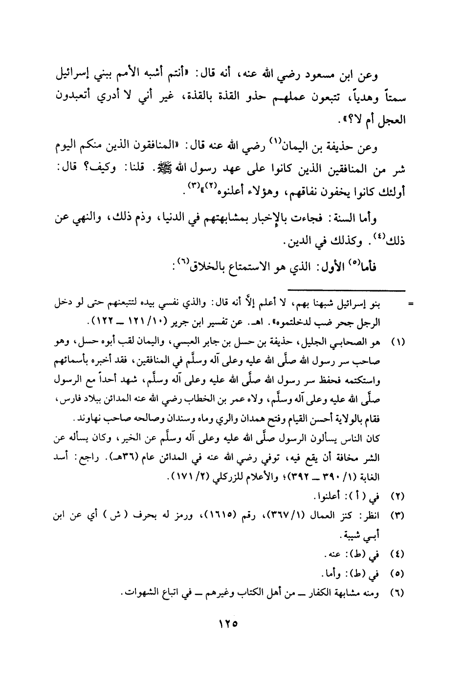 وعن ابن مسعود رضي الله عنه، أنه قال: " أنتم أشبه الأمم ببني إسرائيل سمتا وهديا تتبعون عملهم حذو القذة بالقذة غير أني لا أدري أتعبدون العجل أم لا؟ ".