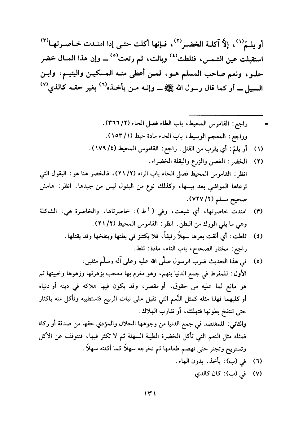 أو يلمّ (¬1) إلا آكلة الخضر (¬2) فإنها أكلت حتى إذا امتدت خاصرتها (¬3) استقبلت عين الشمس فثلطت (¬4) وبالت، ثم رتعت (¬5) وإن هذا المال خضر حلو، ونعم صاحب المسلم هو، لمن أعطى منه المسكين واليتيم، وابن السبيل - أو كما قال رسول الله صلى الله عليه وسلم - وإنه من يأخذه (¬6) بغير حقه كالذي (¬7)