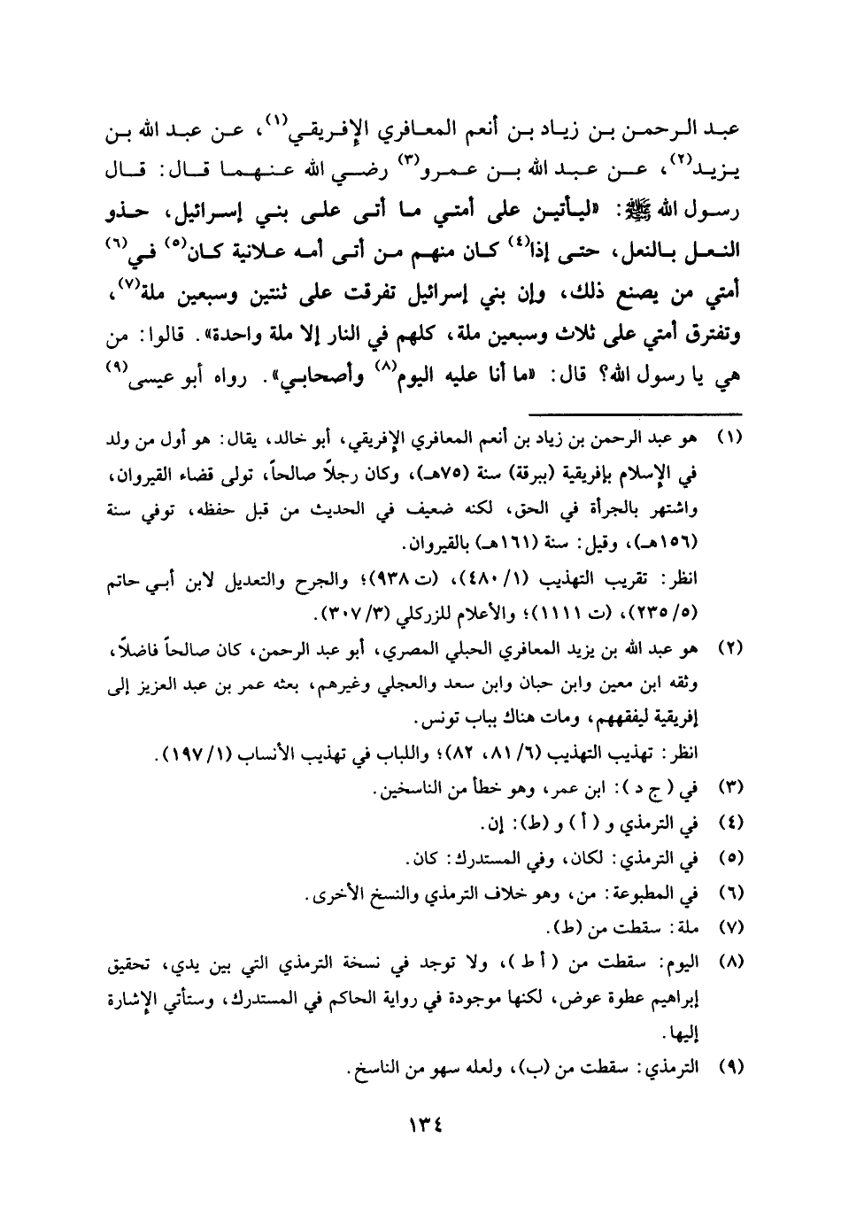 عبد الرحمن بن زياد بن أنعم الإفريقي (¬1) عن عبد الله بن يزيد (¬2) عن عبد الله بن عمرو (¬3) رضي الله عنهما قال: قال رسول الله صلى الله عليه وسلم: «ليأتين على أمتي ما أتى على بني إسرائيل حذو النعل بالنعل، حتى إذا (¬4) كان منهم من أتى أمه علانية كان (¬5) في (¬6) أمتي من يصنع ذلك، وإن بني إسرائيل تفرقت على ثنتين وسبعين ملة (¬7) وتفترق أمتي على ثلاث وسبعين ملة كلهم في النار إلا ملة واحدة " قالوا: من هي يا رسول الله؟ قال: "ما أنا عليه اليوم (¬8) وأصحابي» رواه أبو عيسى (¬9)