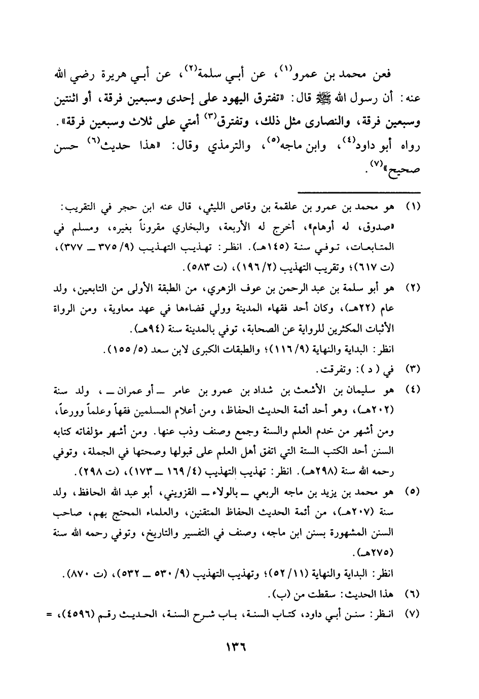 (¬7) انظر: سنن أبي داود، كتاب السنة، الحديث رقم (4596) ، (5 / 4) ؛ وسنن ابن ماجه، باب افتراق الأمم، الحديث رقم (3991) ، (2 / 1321) ؛ وسنن الترمذي، كتاب الإيمان، باب ما جاء في افتراق هذه الأمة، حديث رقم (2640) ، (5 / 25) ، وقال: " حديث أبي هريرة حديث حسن صحيح ".