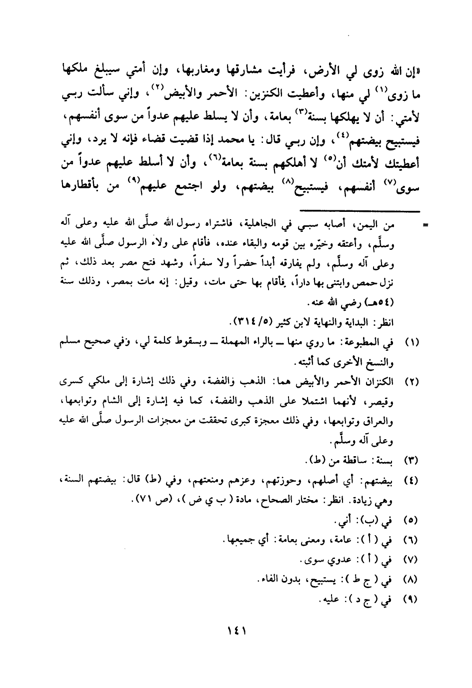 «إن الله زوى لي الأرض، فرأيت مشارقها ومغاربها، وإن أمتي سيبلغ ملكها ما زوى (¬1) لي منها، وأعطيت الكنزين: الأحمر والأبيض (¬2) وإني سألت ربي لأمتي: أن لا يهلكها بسنة (¬3) بعامة، وأن لا يسلط عليهم عدوا من سوى أنفسهم، فيستبيح بيضتهم (¬4) وإن ربي قال: يا محمد إذا قضيت قضاء فإنه لا يرد، وإني أعطيتك لأمتك أن (¬5) لا أهلكهم بسنة بعامة (¬6) وأن لا أسلط عليهم عدوا من سوى (¬7) أنفسهم، فيستبيح (¬8) بيضتهم، ولو اجتمع عليهم (¬9) من بأقطارها