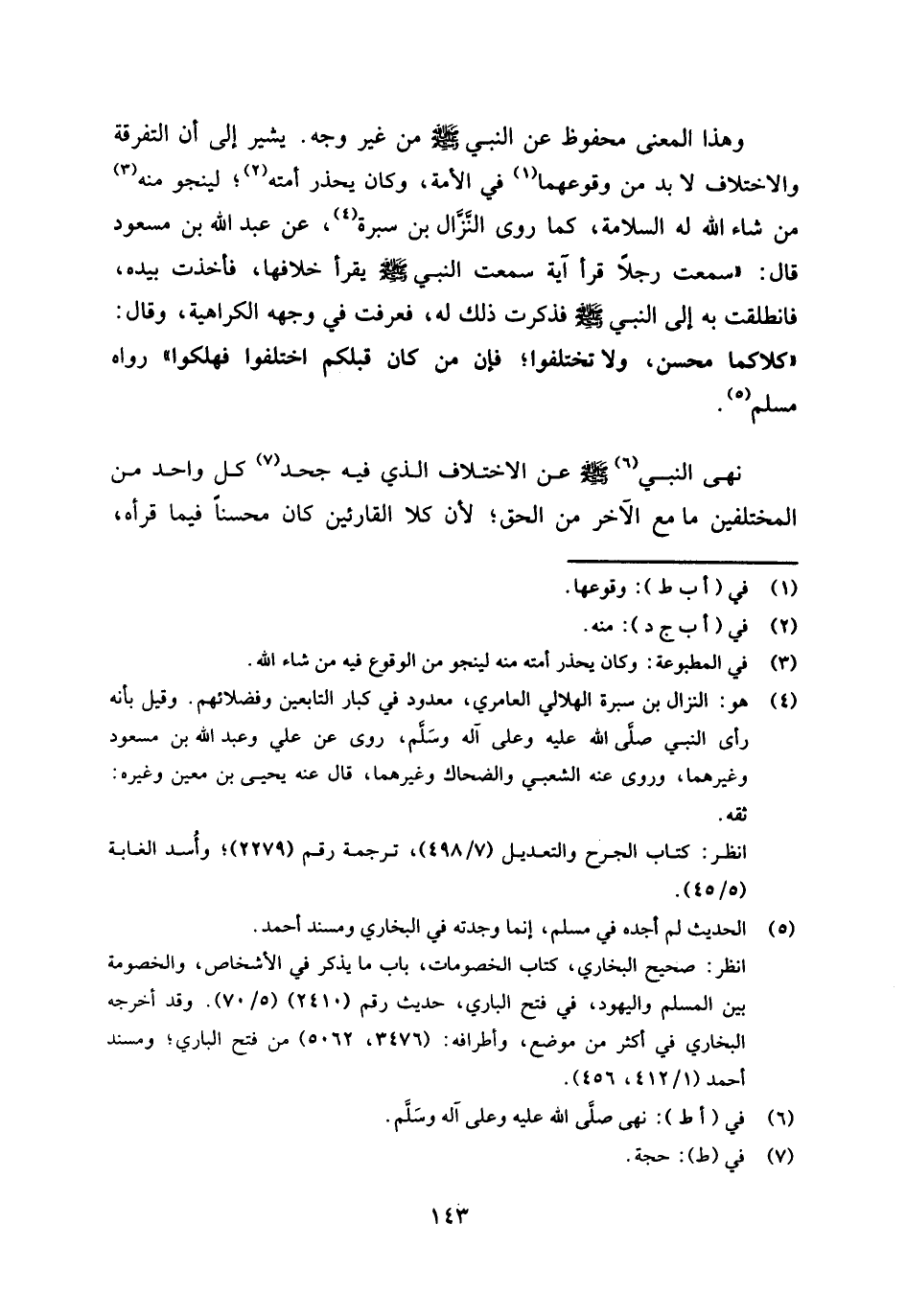وهذا المعنى محفوظ عن النبي صلى الله عليه وسلم من غير وجه، يشير إلى أن التفرقة والاختلاف لا بد من وقوعهما (¬1) في الأمة، وكان يحذر أمته (¬2) ؛ لينجو منه (¬3) من شاء الله له السلامة، كما روى النزال بن سبرة (¬4) عن عبد الله بن مسعود قال: «سمعت رجلا قرأ آية سمعت النبي صلى الله عليه وسلم يقرأ خلافها، فأخذت بيده، فانطلقت به إلى النبي صلى الله عليه وسلم فذكرت ذلك له، فعرفت في وجهه الكراهية، وقال: " كلاكما محسن، ولا تختلفوا؛ فإن من كان قبلكم اختلفوا فهلكوا» رواه مسلم (¬5) .