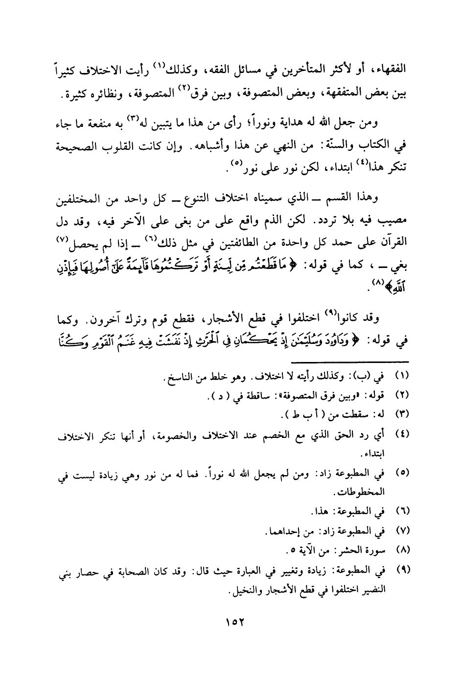 وهذا القسم - الذي سميناه: اختلاف التنوع - كل واحد من المختلفين مصيب فيه بلا تردد، لكن الذم واقع على من بغى على الآخر فيه، وقد دل القرآن على حمد كل واحد من الطائفتين في مثل ذلك (¬6) إذا لم يحصل (¬7) بغي كما في قوله: {مَا قَطَعْتُمْ مِنْ لِينَةٍ أَوْ تَرَكْتُمُوهَا قَائِمَةً عَلَى أُصُولِهَا فَبِإِذْنِ اللَّهِ} [الحشر: 5] (¬8) .