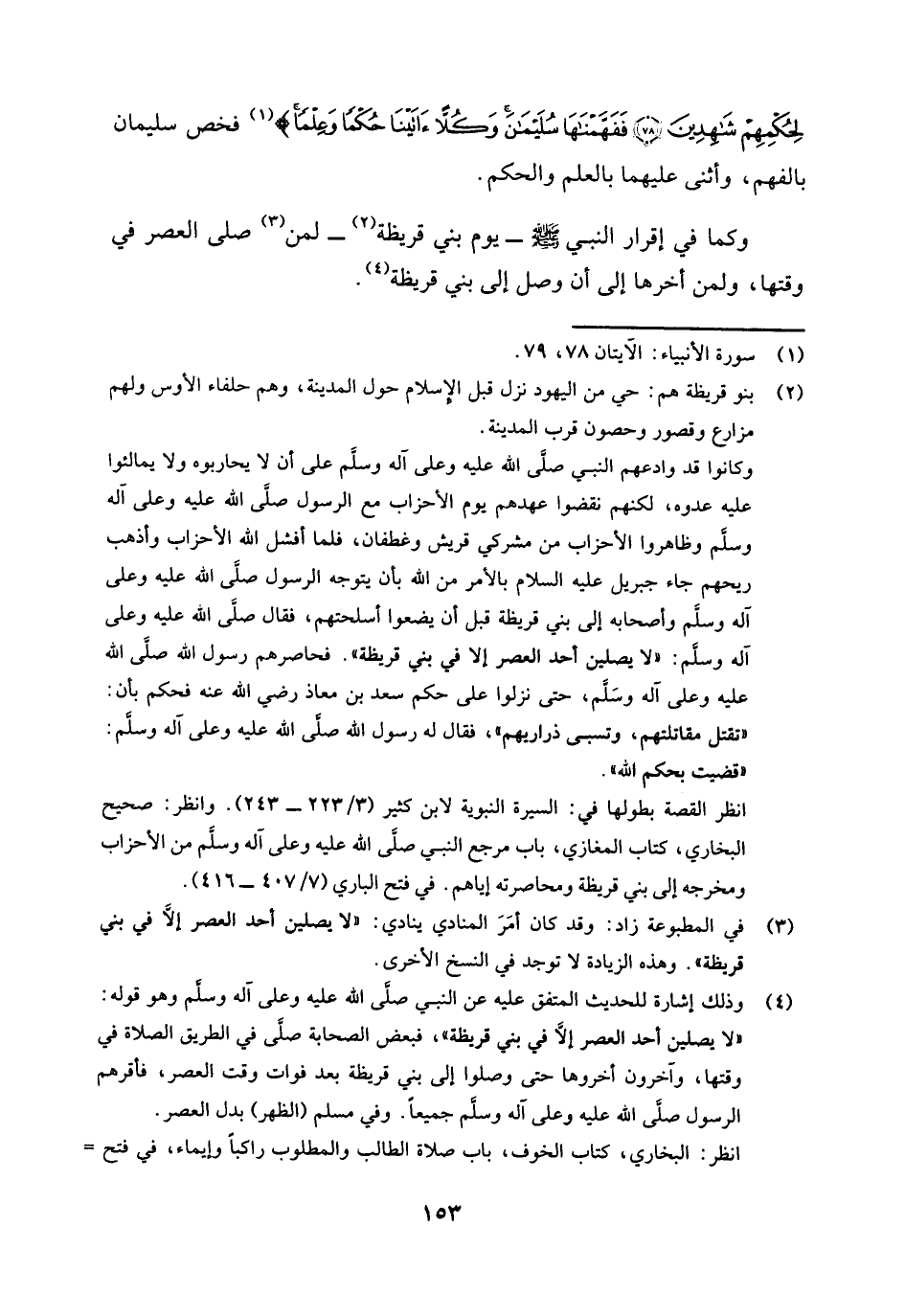 (¬4) وذلك إشارة للحديث المتفق عليه عن النبي صلى الله عليه وعلى آله وسلم وهو قوله: " لا يصلين أحد العصر إلا في بني قريظة "، فبعض الصحابة صلى في الطريق الصلاة في وقتها، وآخرون أخروها حتى وصلوا إلى بني قريظة بعد فوات وقت العصر، فأقرهم الرسول صلى الله عليه وعلى آله وسلم جميعا. وفي مسلم (الظهر) بدل العصر.