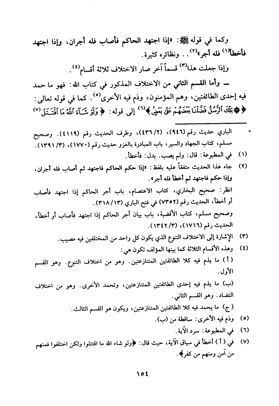 (¬4) وهذه الأقسام الثلاثة كما بينها المؤلف تكون هي: (أ) ما يذم فيه كلا الطائفتين المتنازعتين، وهو من اختلاف التنوع، وهو القسم الأول.