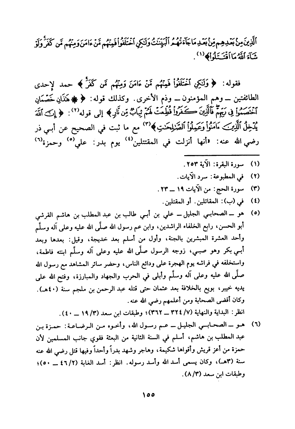 فقوله: {وَلَكِنِ اخْتَلَفُوا فَمِنْهُمْ مَنْ آمَنَ وَمِنْهُمْ مَنْ كَفَرَ} [البقرة: 253] حمد لإحدى الطائفتين - وهم المؤمنون - وذم للآخرى، وكذلك قوله: {هَذَانِ خَصْمَانِ اخْتَصَمُوا فِي رَبِّهِمْ فَالَّذِينَ كَفَرُوا قُطِّعَتْ لَهُمْ ثِيَابٌ مِنْ نَارٍ} [الحج: 19] إلى قوله (¬2) {إِنَّ اللَّهَ يُدْخِلُ الَّذِينَ آمَنُوا وَعَمِلُوا الصَّالِحَاتِ} [الحج: 23] (¬3) مع ما ثبت في الصحيح عن أبي ذر رضي الله عنه: " أنها نزلت في المقتتلين (¬4) يوم بدر: علي (¬5) وحمزة (¬6)