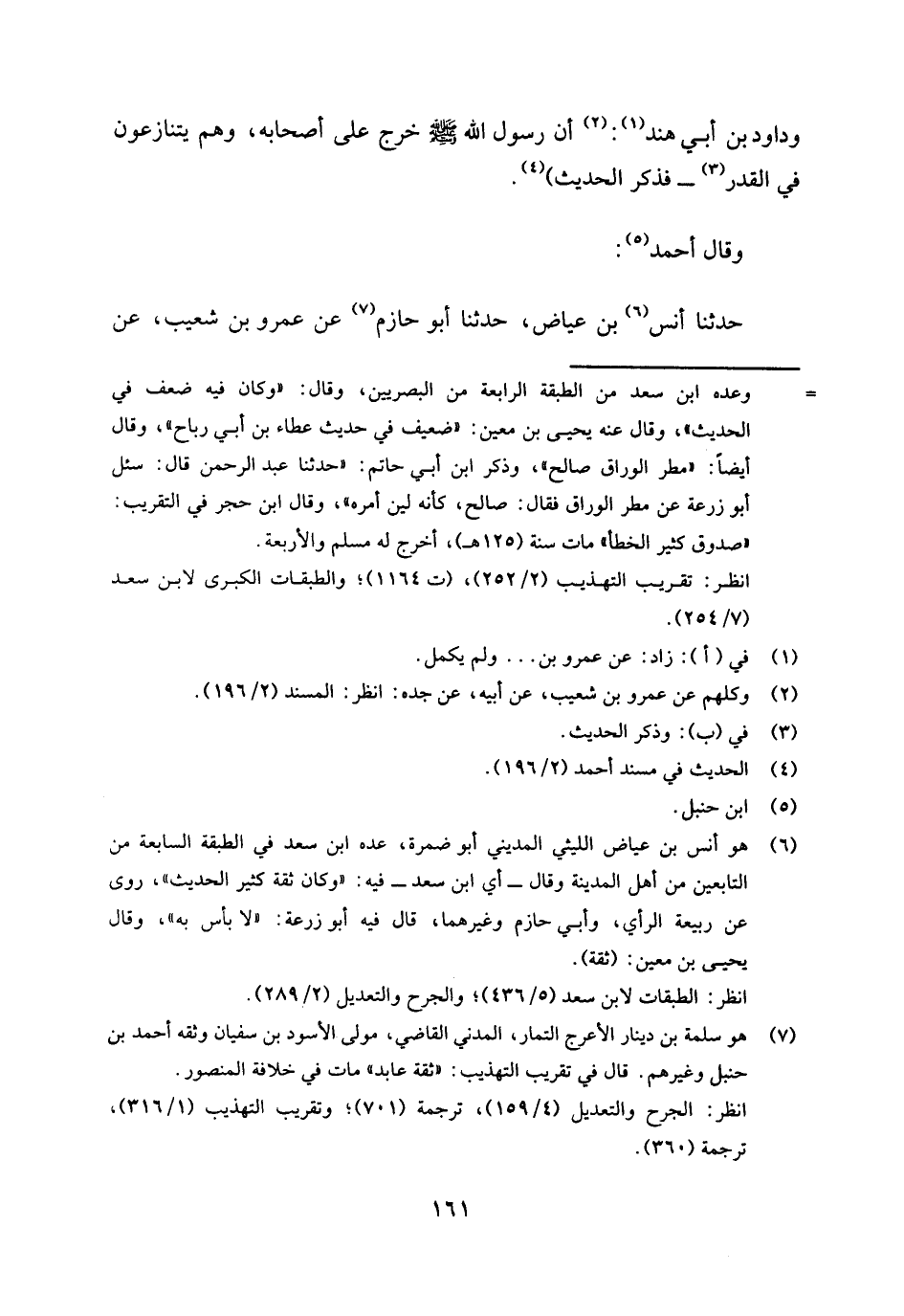 (¬5) هو: أنس بن عياض الليثي المديني، أبو ضمرة، عده ابن سعد في الطبقة السابعة من التابعين من أهل المدينة، وقال - أي ابن سعد - فيه: " وكان ثقة كثير الحديث "، روى عن ربيعة الرأي، وأبي حازم وغيرهما، قال فيه أبو زرعة: " لا بأس به "، وقال يحيى بن معين: " ثقة ".