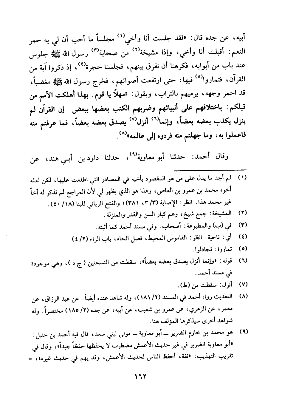 أبيه، عن جده قال: «لقد جلست أنا وأخي (¬1) مجلسا ما أحب أن لي به حمر النعم: أقبلت أنا وأخي، وإذا مشيخة (¬2) من صحابة (¬3) رسول الله صلى الله عليه وسلم جلوس عند باب من أبوابه، فكرهنا أن نفرق بينهم فجلسنا حجرة (¬4) إذ ذكروا آية من القرآن فتماروا (¬5) فيها حتى ارتفعت أصواتهم فخرج رسول الله صلى الله عليه وسلم مغضبا، قد احمر وجهه يرميهم بالتراب، ويقول: " مهلا يا قوم، بهذا أهلكت الأمم من قبلكم: باختلافهم على أنبيائهم وضربهم الكتب بعضها ببعض، إن القرآن لم ينزل يكذب بعضه بعضا، وإنما (¬6) أنزل (¬7) يصدق بعضه بعضا، فما عرفتم منه فاعملوا به وما جهلتم منه فردوه إلى عالمه» (¬8) .
