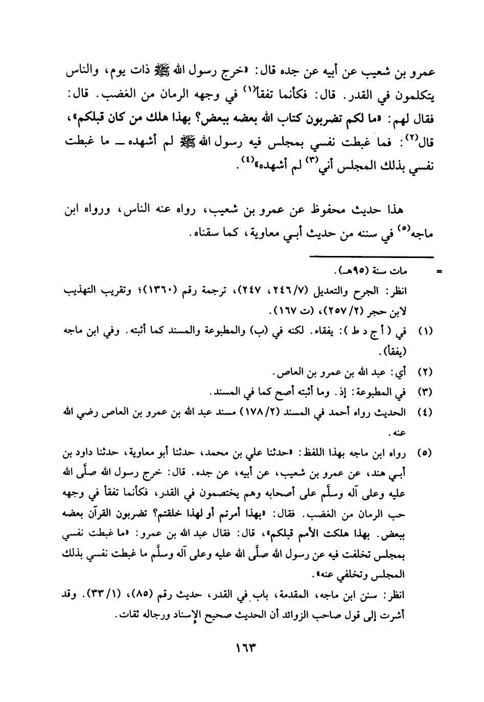 (¬5) رواه ابن ماجه بهذا اللفظ: (حدثنا علي بن محمد، حدثنا أبو معاوية، حدثنا داود بن أبي هند، عن عمرو بن شعيب، عن أبيه، عن جده، قال: خرج رسول الله صلى الله عليه وآله وسلم على أصحابه وهم يختصمون في القدر، فكأنما تفقأ في وجهه حب الرمان من الغضب، فقال: " بهذا أمرتم أو لهذا خلقتم؟ تضربون القرآن بعضه ببعض. بهذا هلكت الأمم قبلكم "، قال: فقال عبد الله بن عمرو: ما غبطت نفسي بمجلس تخلفت فيه عن رسول الله صلى الله عليه وعلى آله وسلم ما غبطت نفسي بذلك المجلس وتخلفي عنه) .