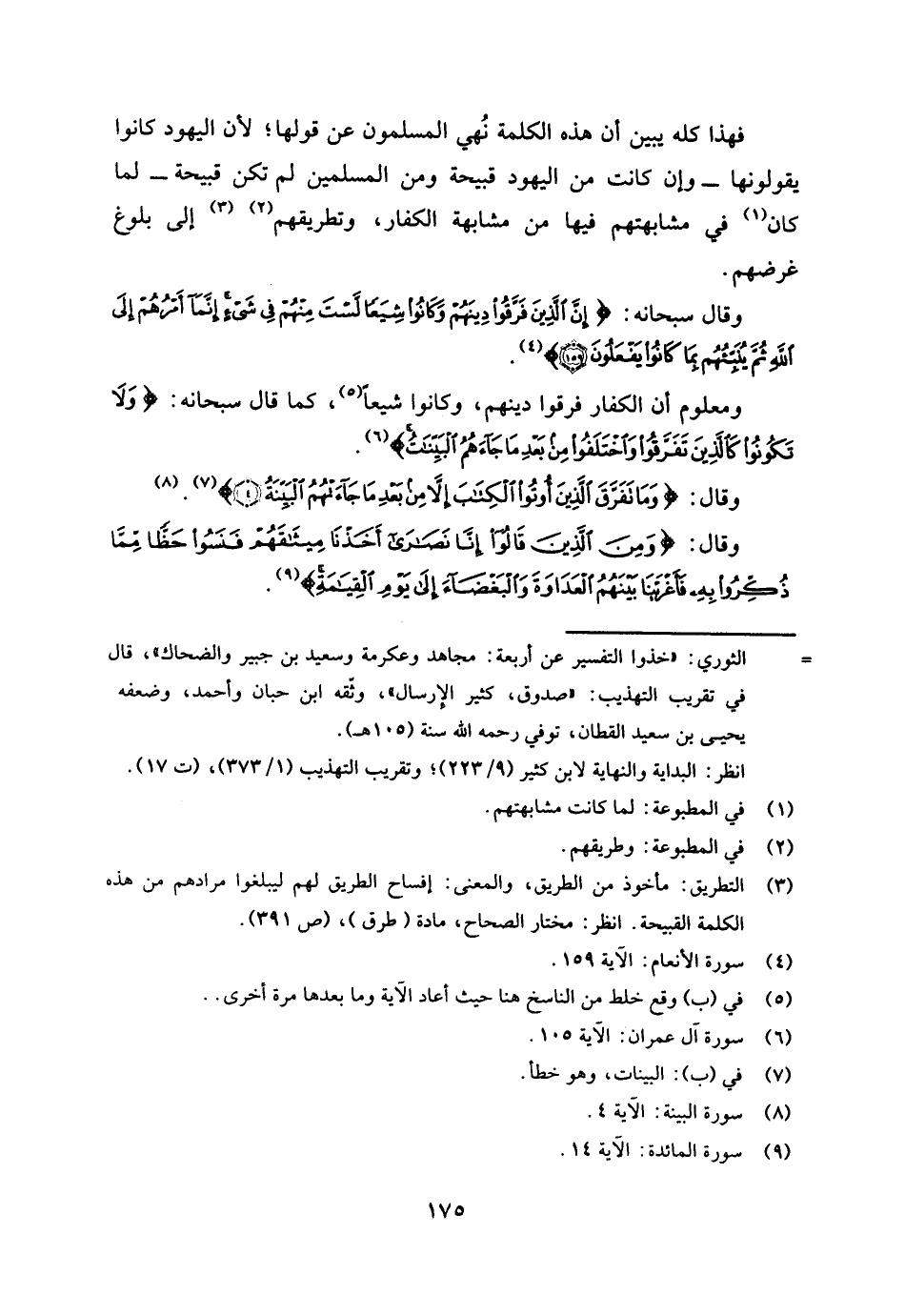 ومعلوم أن الكفار فرقوا دينهم، وكانوا شيعا (¬4) كما قال سبحانه: {وَلَا تَكُونُوا كَالَّذِينَ تَفَرَّقُوا وَاخْتَلَفُوا مِنْ بَعْدِ مَا جَاءَهُمُ الْبَيِّنَاتُ} [آل عمران: 105] (¬5) .