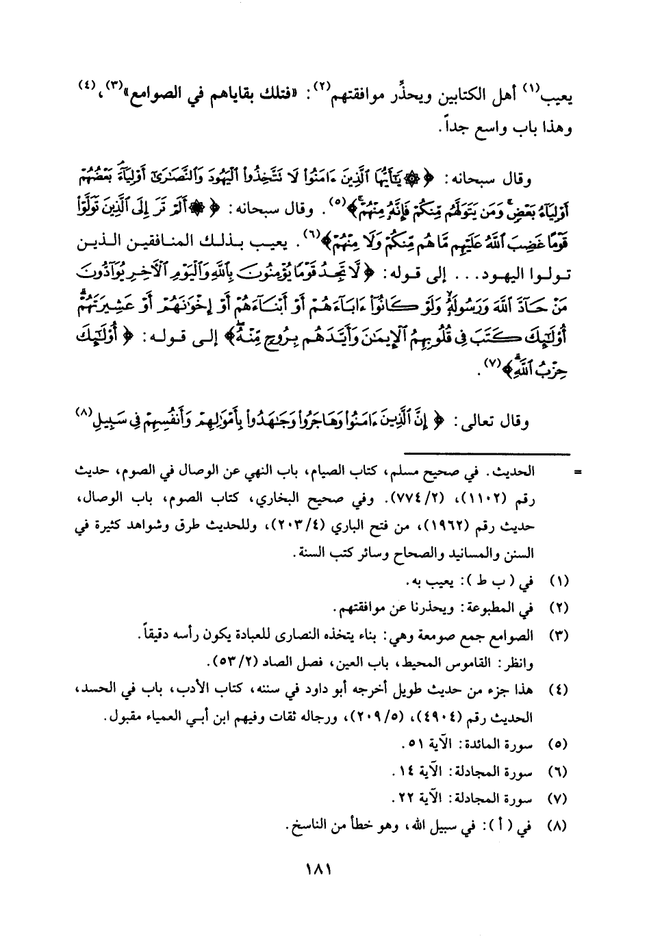 وقال سبحانه: {يَا أَيُّهَا الَّذِينَ آمَنُوا لَا تَتَّخِذُوا الْيَهُودَ وَالنَّصَارَى أَوْلِيَاءَ بَعْضُهُمْ أَوْلِيَاءُ بَعْضٍ وَمَنْ يَتَوَلَّهُمْ مِنْكُمْ فَإِنَّهُ مِنْهُمْ} [المائدة: 51] (¬5) وقال سبحانه: {أَلَمْ تَرَ إِلَى الَّذِينَ تَوَلَّوْا قَوْمًا غَضِبَ اللَّهُ عَلَيْهِمْ مَا هُمْ مِنْكُمْ وَلَا مِنْهُمْ} [المجادلة: 14] (¬6) يعيب بذلك المنافقين الذين تولوا اليهود. . . إلى قوله: {لَا تَجِدُ قَوْمًا يُؤْمِنُونَ بِاللَّهِ وَالْيَوْمِ الْآخِرِ يُوَادُّونَ مَنْ حَادَّ اللَّهَ وَرَسُولَهُ وَلَوْ كَانُوا آبَاءَهُمْ أَوْ أَبْنَاءَهُمْ أَوْ إِخْوَانَهُمْ أَوْ عَشِيرَتَهُمْ أُولَئِكَ كَتَبَ فِي قُلُوبِهِمُ الْإِيمَانَ وَأَيَّدَهُمْ بِرُوحٍ مِنْهُ} [المجادلة: 22] إلى قوله: {أُولَئِكَ حِزْبُ اللَّهِ} [المجادلة: 22] (¬7) .