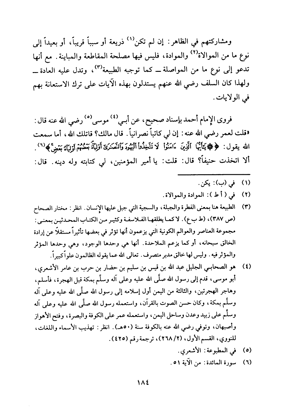 ومشاركتهم في الظاهر: إن لم تكن (¬1) ذريعة أو سببا قريبا أو بعيدا إلى نوع ما من الموالاة (¬2) والموادة، فليس فيها مصلحة المقاطعة والمباينة، مع أنها تدعو إلى نوع ما من المواصلة - كما توجبه الطبيعة (¬3) وتدل عليه العادة - ولهذا كان السلف رضي الله عنهم يستدلون بهذه الآيات على ترك الاستعانة بهم في الولايات.