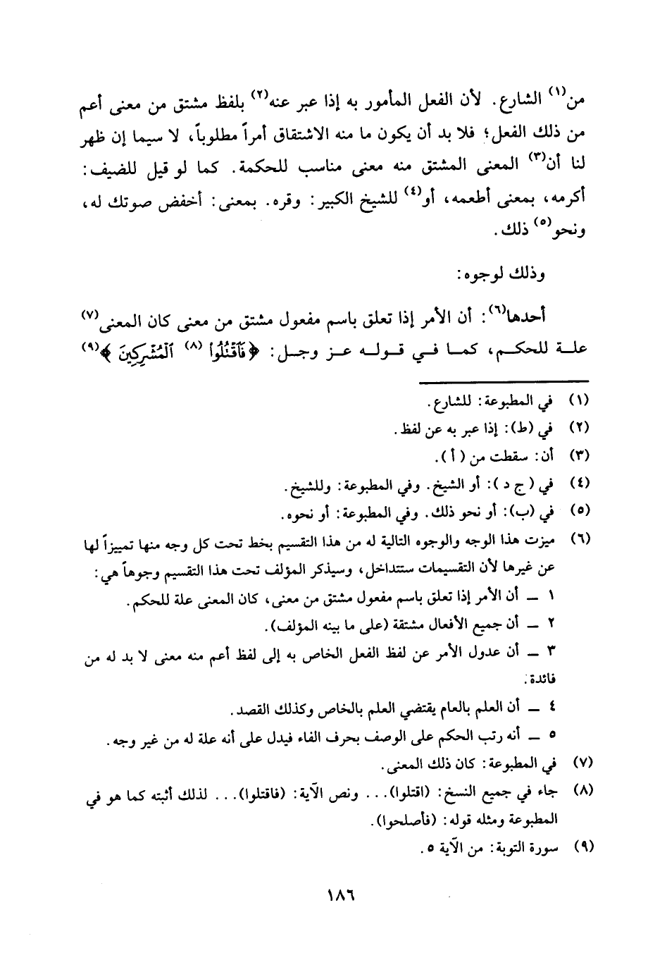 * أحدها (¬6) أن الأمر إذا تعلق باسم مفعول مشتق من معنى كان المعنى (¬7) علة للحكم، كما في قوله عز وجل: {فَاقْتُلُوا (¬8) الْمُشْرِكِينَ} [التوبة: 5] (¬9)