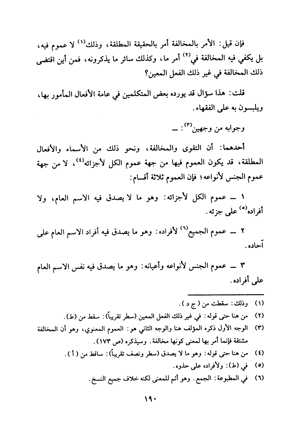 (¬3) الوجه الأول ذكره المؤلف هنا والوجه الثاني هو: العموم المعنوي، وهو أن المخالفة مشتقة فإنما أمر بها لمعنى كونها مخالفة، وسيذكره (ص 173) .