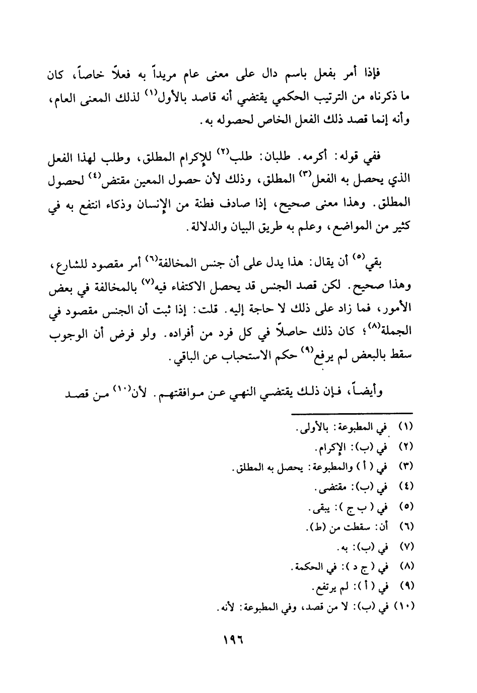 ففي قوله: أكرمه. طلبان طلب (¬2) للإكرام المطلق وطلب لهذا الفعل الذي يحصل به الفعل (¬3) المطلق؛ وذلك؛ لأن حصول المعين مقتض (¬4) لحصول المطلق، وهذا معنى صحيح، إذا صادف فطنة من الإنسان وذكاء؛ انتفع به في كثير من المواضع وعلم به طريق البيان والدلالة.