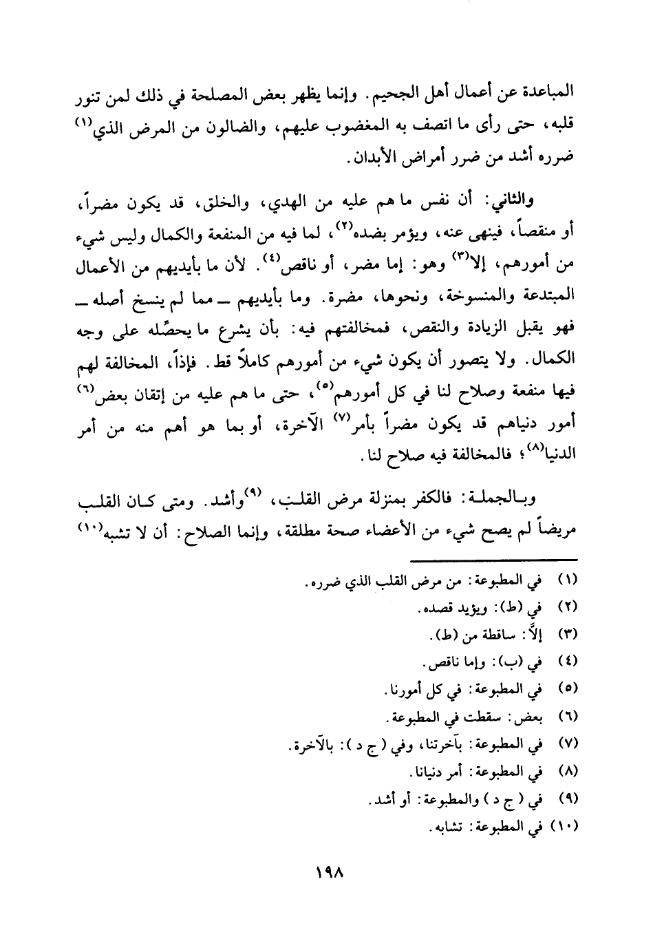 وبالجملة فالكفر بمنزلة مرض القلب (¬9) وأشد ومتى كان القلب مريضا لم يصح شيء من الأعضاء صحة مطلقة، وإنما الصلاح أن لا تشبه (¬10)