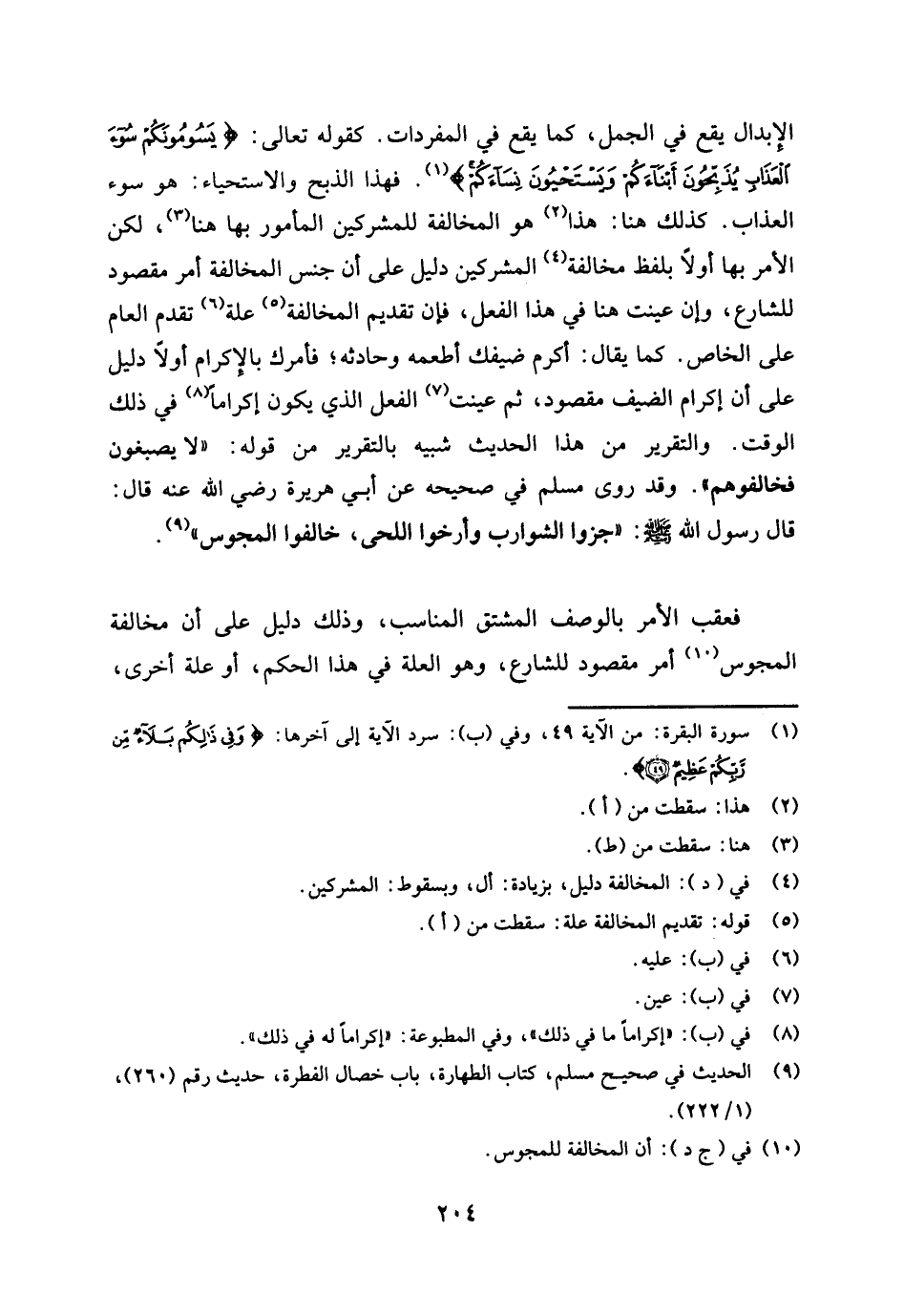 الإبدال يقع في الجمل كما يقع في المفردات كقوله تعالى: {يَسُومُونَكُمْ سُوءَ الْعَذَابِ يُذَبِّحُونَ أَبْنَاءَكُمْ وَيَسْتَحْيُونَ نِسَاءَكُمْ} [البقرة: 49] (¬1) فهذا الذبح والاستحياء هو سوء العذاب كذلك هنا هذا (¬2) هو المخالفة للمشركين المأمور بها هنا (¬3) لكن الأمر بها أولا بلفظ مخالفة (¬4) المشركين دليل على أن جنس المخالفة أمر مقصود للشارع وإن عينت هنا في هذا الفعل فإن تقديم المخالفة (¬5) علة (¬6) تقدم العام على الخاص كما يقال: أكرم ضيفك: أطعمه، وحادثه. فأمرك بالإكرام أولا دليل على أن إكرام الضيف مقصود، ثم عينت (¬7) الفعل الذي يكون إكراما (¬8) في ذلك الوقت.