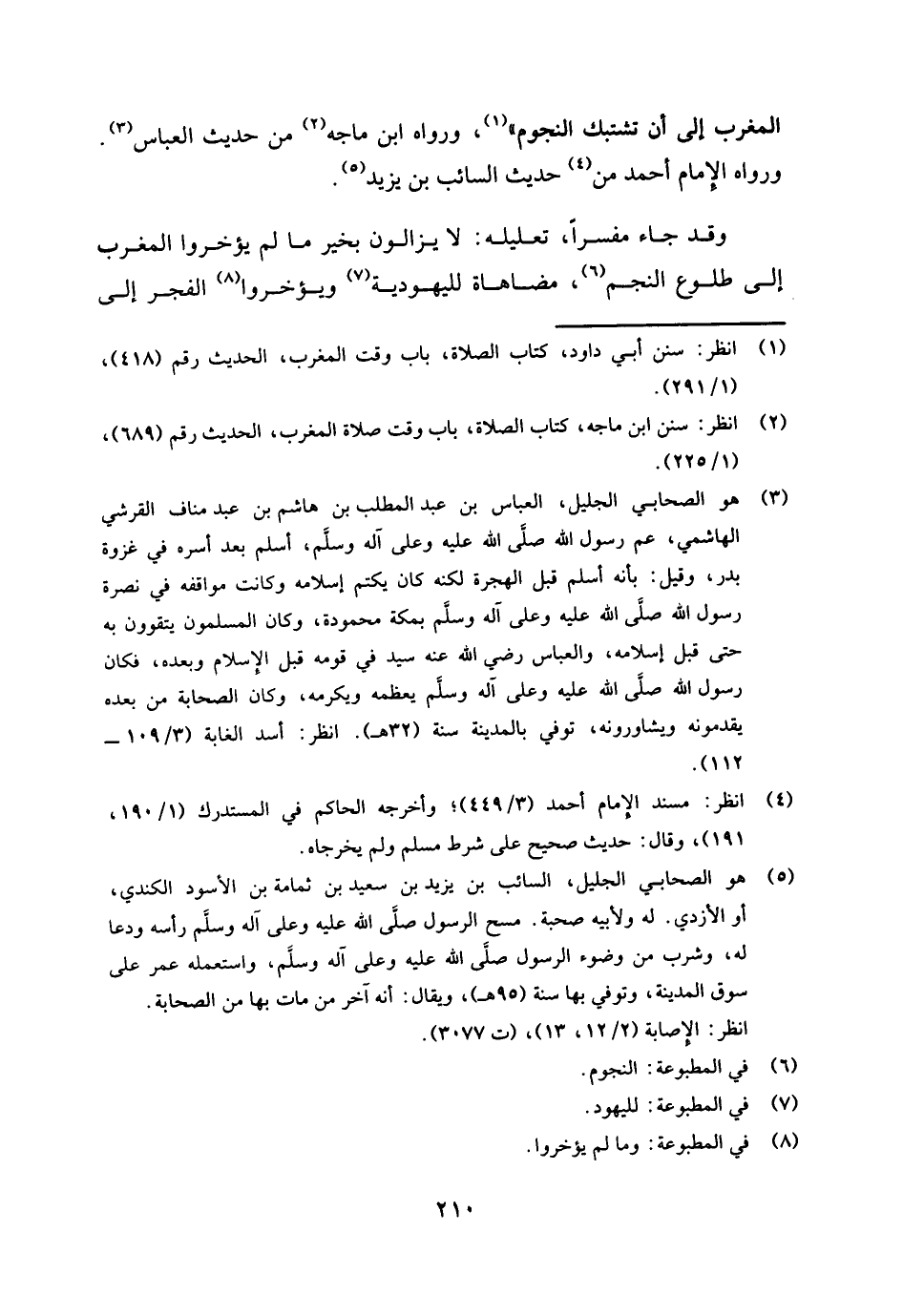 المغرب إلى أن تشتبك النجوم» (¬1) ورواه ابن ماجه (¬2) من حديث العباس (¬3) ورواه الإمام أحمد من (¬4) حديث السائب بن يزيد (¬5) .