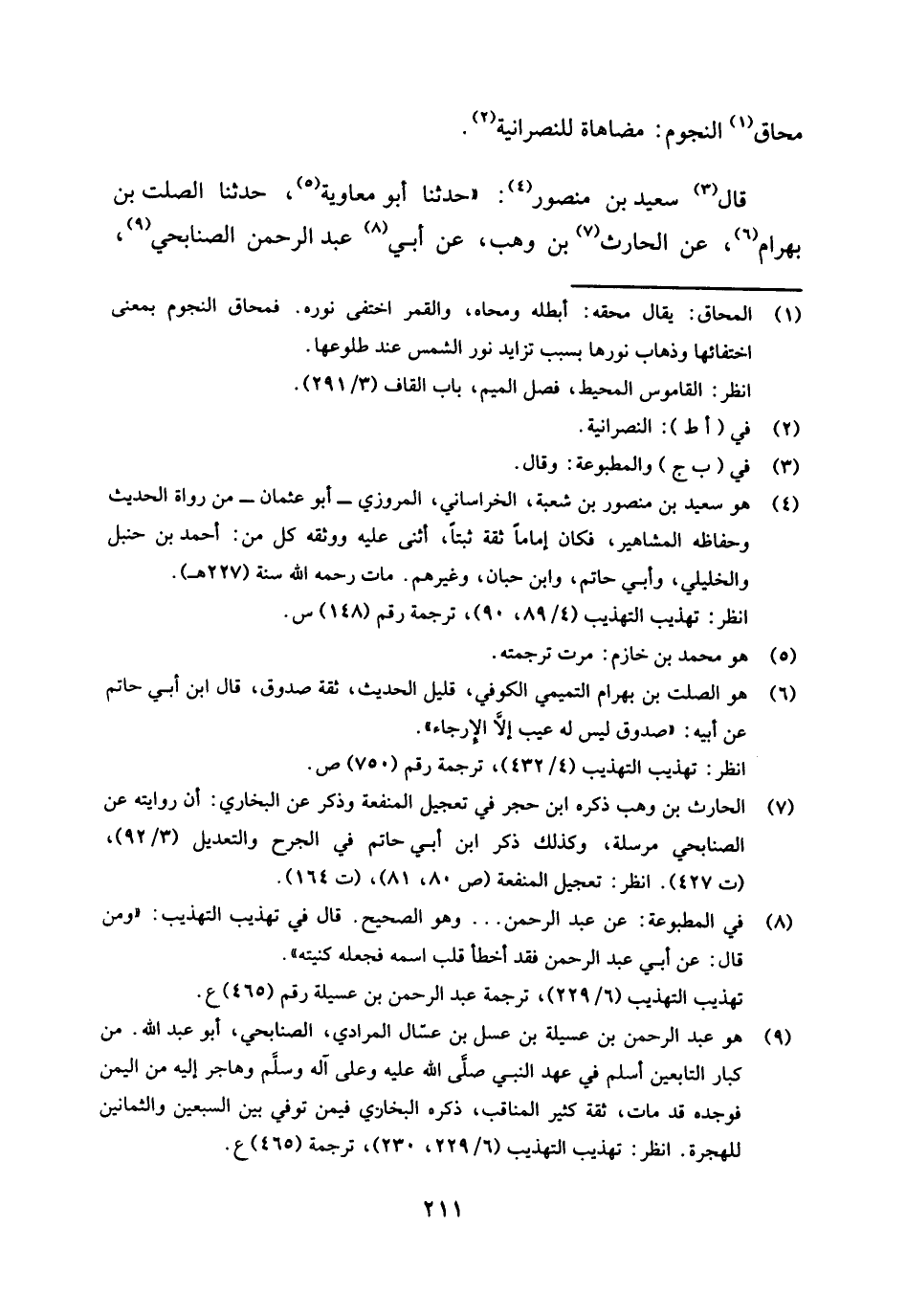 (¬4) هو: سعيد بن منصور بن شعبة، الخراساني، المروزي، أبو عثمان، من رواة الحديث وحفاظه المشاهير، فكان إماما ثقة ثبتا، أثنى عليه ووثقه كل من: أحمد بن حنبل والخليلي، وأبي حاتم، وابن حبان، وغيرهم، مات رحمه الله سنة (227 هـ) .