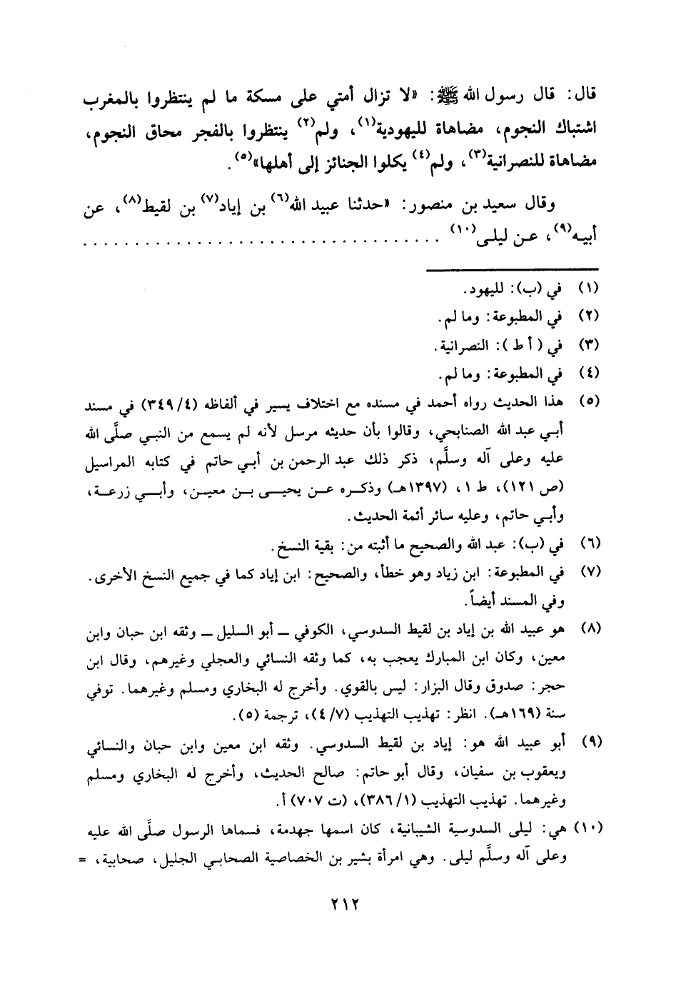 (¬5) هذا الحديث رواه أحمد في مسنده مع اختلاف يسير في ألفاظه (4 / 349) في مسند أبي عبد الله الصنابحي، وقالوا بأن حديثه مرسل؛ لأنه لم يسمع من النبي صلى الله عليه وعلى آله وسلم، ذكر ذلك عبد الرحمن بن أبي حاتم في كتابه المراسيل (ص121، ط1،، (1397 هـ) وذكره عن يحيى بن معين، وأبي زرعة، وأبي حاتم، وعليه سائر أئمة الحديث.