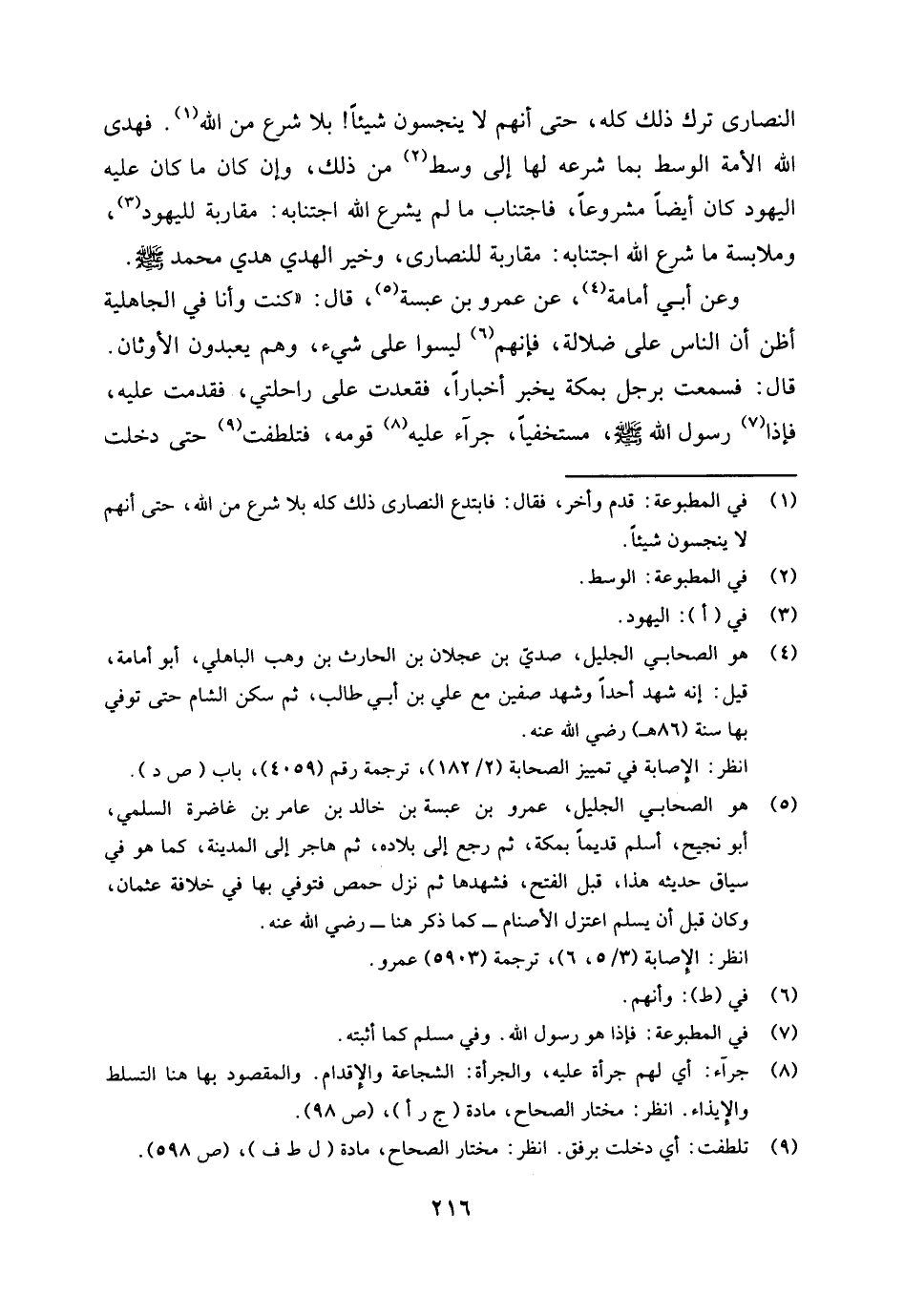 (¬5) هو الصحابي الجليل: عمرو بن عبسة بن خالد بن عامر بن غاضرة السلمي، أو نجيح، أسلم قديما بمكة، ثم رجع إلى بلاده، ثم هاجر إلى المدينة، كما هو في سياق حديثه هذا، قبل الفتح، فشهدها ثم نزل حمص فتوفي بها في خلافة عثمان، وكان قبل أن يسلم اعتزل الأصنام- كما ذكر هنا- رضي الله عنه.