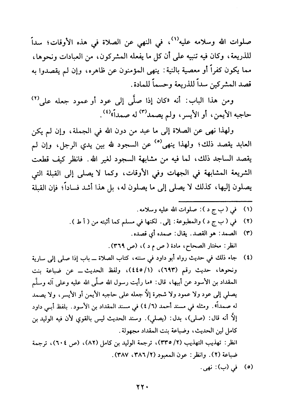 صلوات الله وسلامه عليه (¬1) في النهي عن الصلاة في هذه الأوقات، سدا للذريعة وكان فيه تنبيه على أن كل ما يفعله المشركون من العبادات ونحوها، مما يكون كفرا أو معصية بالنية، ينهى المؤمنون عن ظاهره وإن لم يقصدوا به قصد المشركين سدا للذريعة وحسما للمادة.