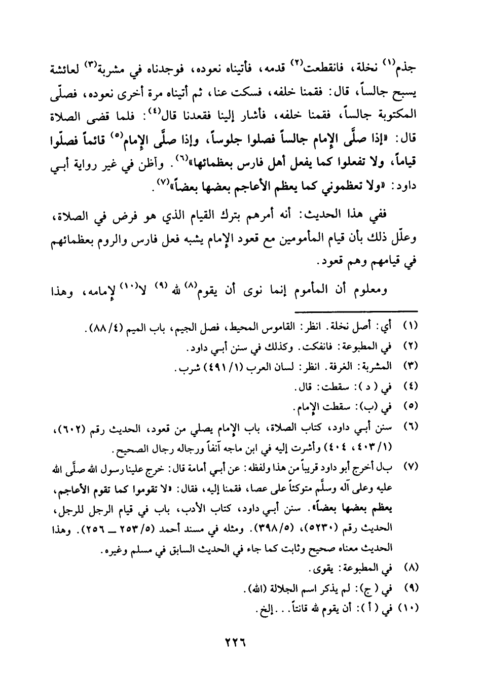 ففي هذا الحديث أنه أمرهم بترك القيام الذي هو فرض في الصلاة، وعلل ذلك بأن قيام المأمومين مع قعود الإمام يشبه فعل فارس والروم بعظمائهم، في قيامهم وهم قعود.
