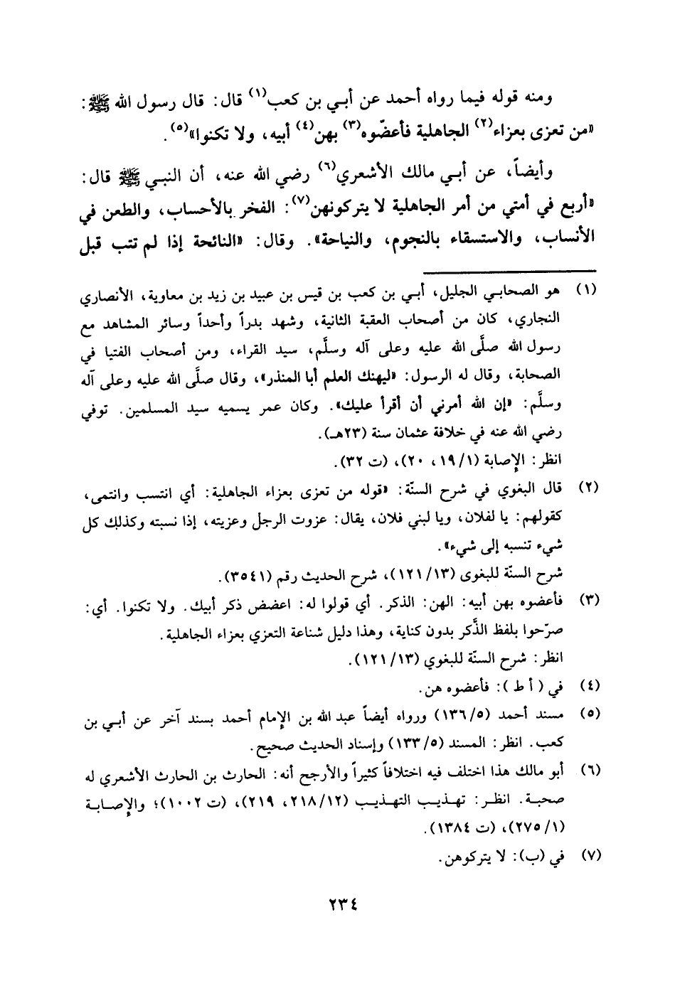وأيضا عن أبي مالك الأشعري (¬6) رضي الله عنه أن النبي صلى الله عليه وسلم قال: «أربع في أمتي من أمر الجاهلية لا يتركونهن (¬7) الفخر بالأحساب، والطعن في الأنساب، والاستسقاء بالنجوم، والنياحة وقال: النائحة إذا لم تتب قبل