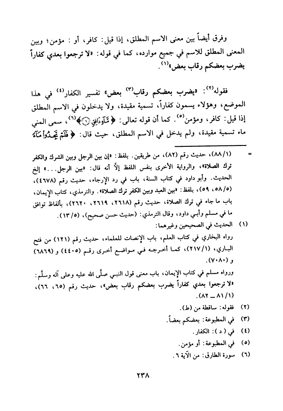 وفرق أيضا بين معنى الاسم المطلق إذا قيل: كافر أو مؤمن. وبين المعنى المطلق للاسم في جميع موارده كما في قوله: لا ترجعوا بعدي كفارا، يضرب بعضكم رقاب بعض (¬1) .
