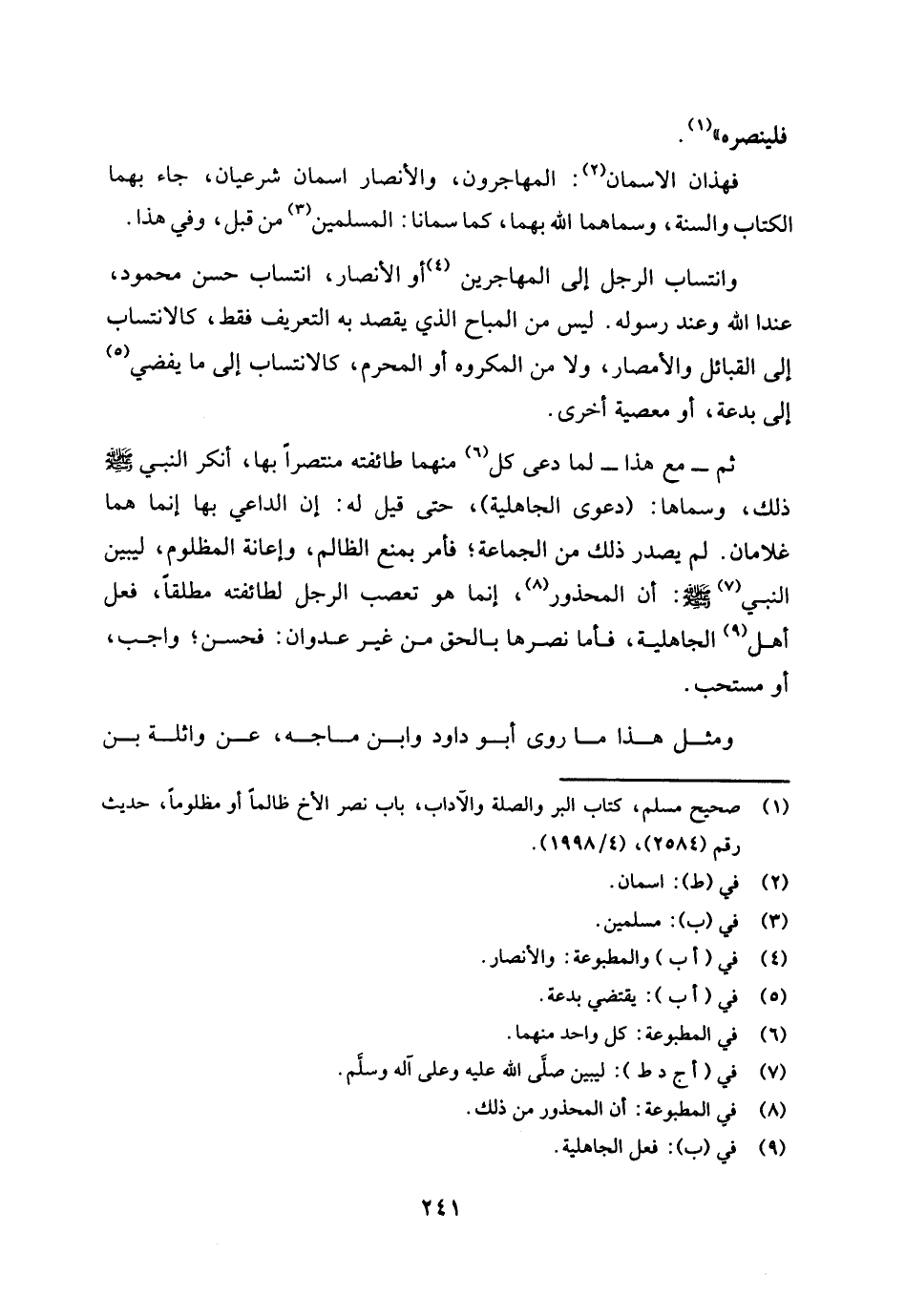 (¬1) صحيح مسلم، كتاب البر والصلة والآداب، باب نصر الأخ ظالما أو مظلوما، حديث رقم (2584) ، (4 / 1998) .