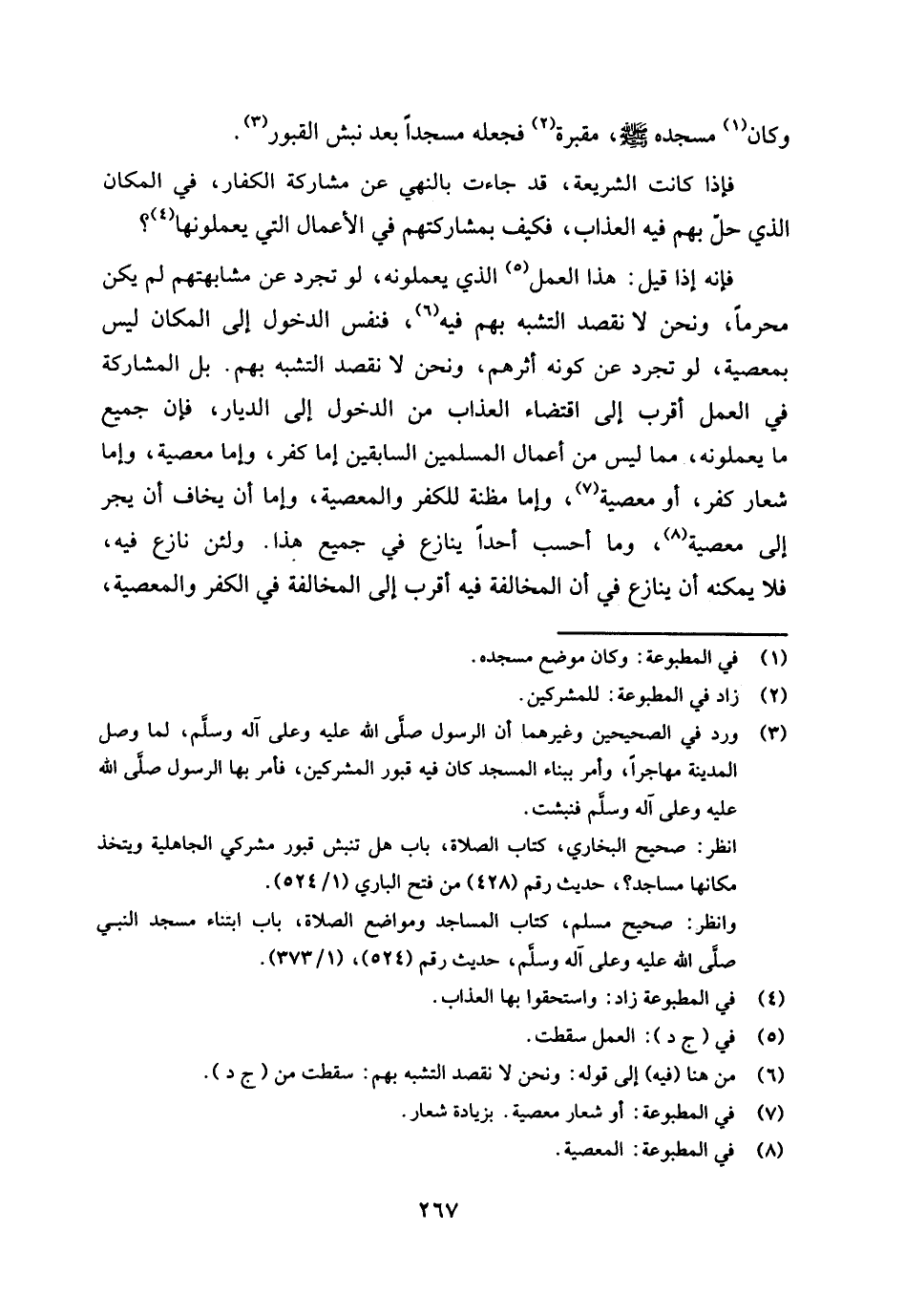 فإنه إذا قيل: هذا العمل (¬5) الذي يعملونه لو تجرد عن مشابهتهم لم يكن محرما، ونحن لا نقصد التشبه بهم فيه، (¬6) فنفس الدخول إلى المكان ليس بمعصية لو تجرد عن كونه أثرهم ونحن لا نقصد التشبه بهم، بل المشاركة في العمل أقرب إلى اقتضاء العذاب من الدخول إلى الديار فإن جميع ما يعملونه مما ليس من أعمال المسلمين السابقين، إما كفر، وإما معصية، وإما شعار كفر، أو معصية (¬7) وإما مظنة للكفر والمعصية، وإما أن يخاف أن يجر إلى معصية (¬8) وما أحسب أحدا ينازع في جميع هذا ولئن نازع فيه فلا يمكنه أن ينازع في أن المخالفة فيه أقرب إلى المخالفة في الكفر والمعصية