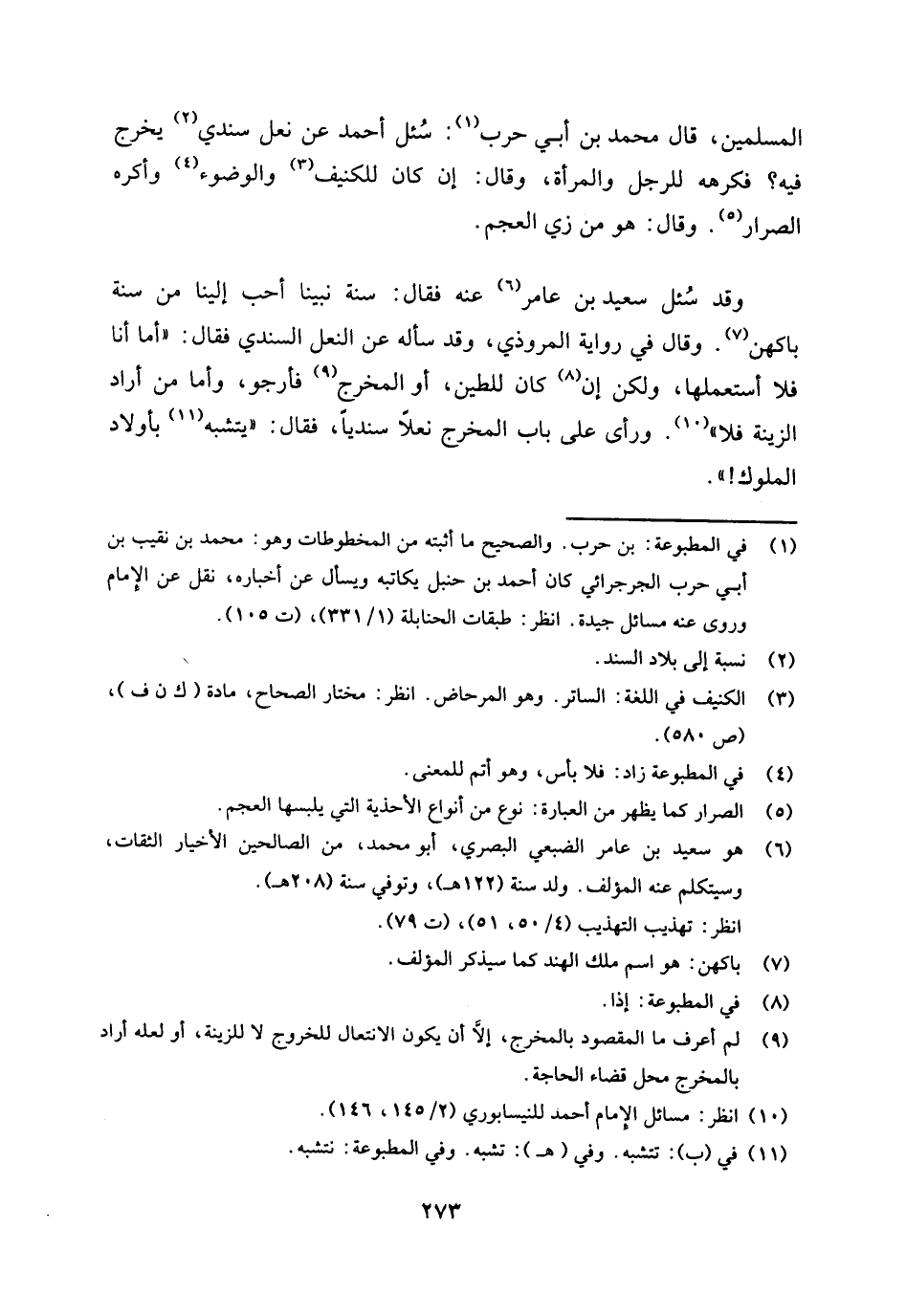 المسلمين قال محمد بن أبي حرب (¬1) سئل أحمد عن نعل سندي (¬2) يخرج فيه. فكرهه للرجل والمرأة وقال: إن كان للكنيف (¬3) والوضوء (¬4) وأكره الصرار (¬5) وقال: هو من زي العجم.